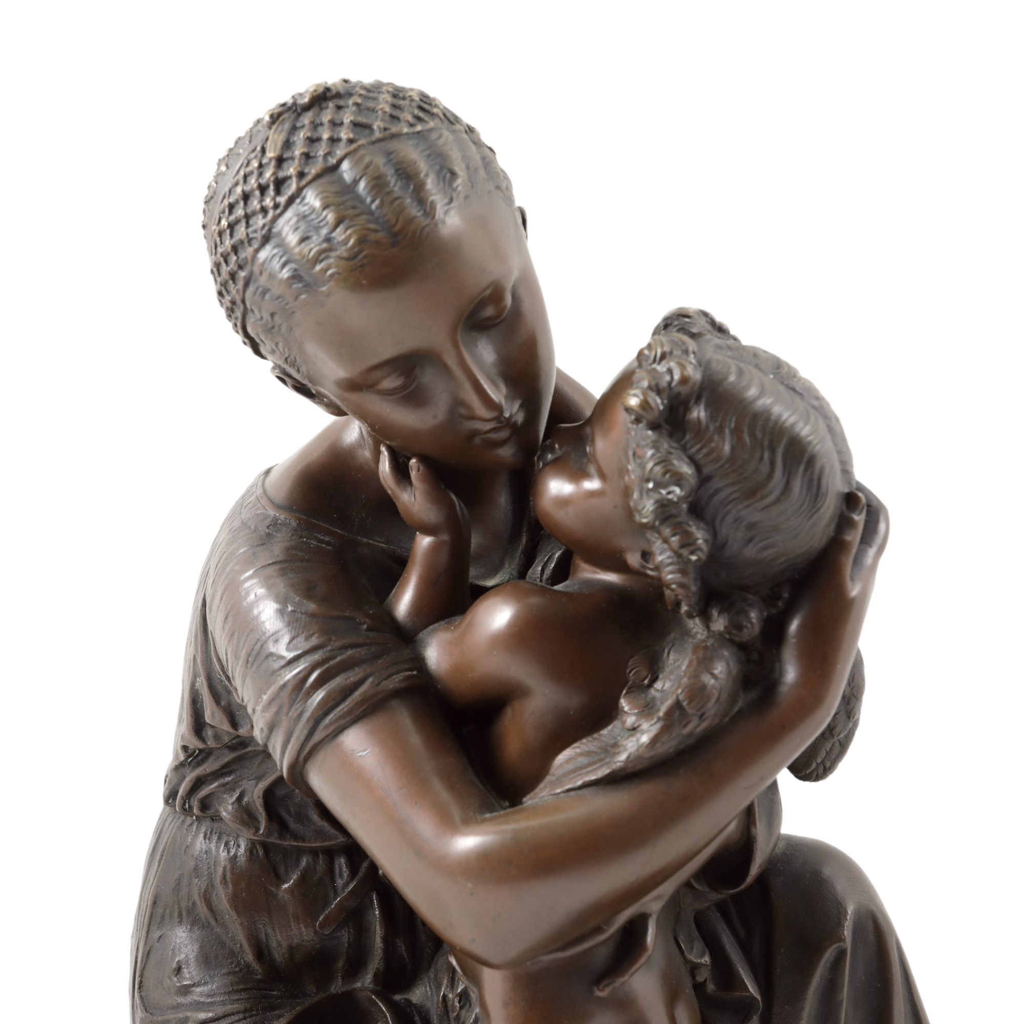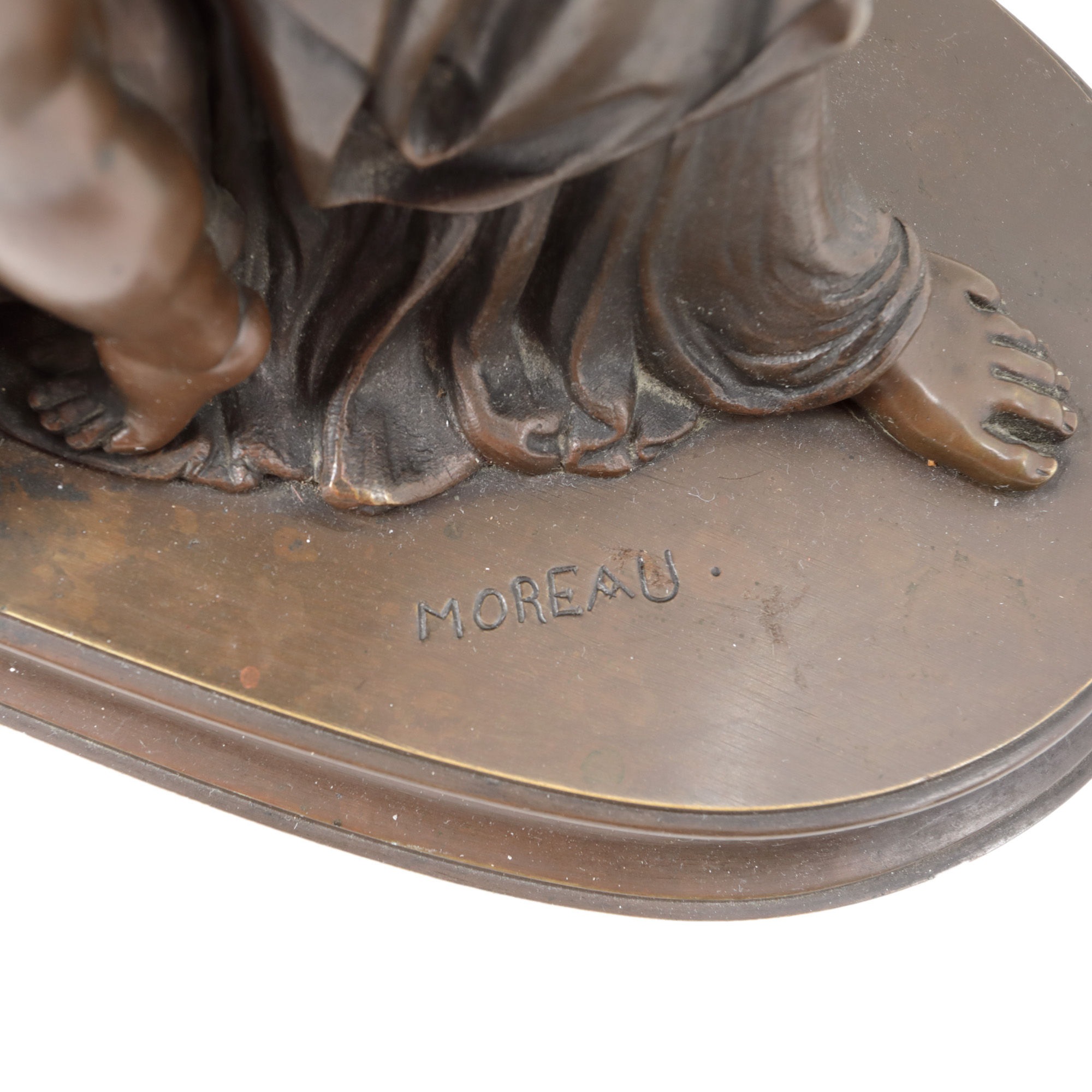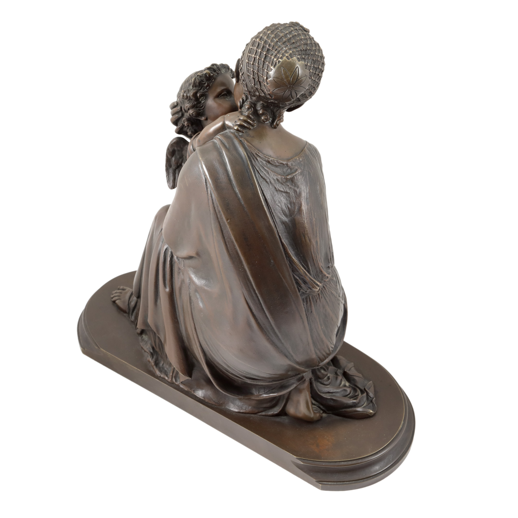 Cu rădăcini într-o impunătoare familie de artiști francezi, Mathurin Moreau se va remarca, de asemenea, în ipostaza de sculptor reprezentant al artei academice. Tatăl său a fost sculptorul Jean-Baptise-Louis-Joseph Moreau, cel care îi va și ghida primii pași în artă; iar frații săi au fost artiștii Hippolyte și Auguste Moreau. Mathurin Moreau va obține un prim premiu în cadrul expoziției de la Roma la vârsta de doar 21 de ani. Va expune apoi în cadrul Saloanelor de la Paris și va fi premiat în cadrul Salonului organizat în anul 1897. Va dedica mai mult timp sculpturilor de for public, pe care le va expune atât pe teritoriul Franței, cât și la Geneva, Liverpool, Peru ori Buenos Aires. În anul 1855, reginei Victoria îi vor fi oferite în dar sculpturi semnate de Mathurin Moreau reprezentând alegorii ale anotimpurilor. Cariera artistică se va împleti cu aceea de om politic, artistul ocupând funcția de primar al arondismentului 19 din Paris din 1879 și până în 1912, anul trecerii sale în neființă. Tot în acest an, o stradă din Paris va fi redenumită în memoria sa. Sculptura sa e remarcabilă prin finețea execuției și prin încărcătura sentimentală pe care reușește să o încastreze artistul în duritatea materialelor. Eleganța formei potențează precizia execuției și ne relevă subiecte preluate din mitologie precum Daphnis și Chloe, zeița Diana ori celebra pereche Venus și Amor. La o privire mai atentă, vom observa faptul că sculptorul a oferit diferite interpretări perechii anterior menționate. În opera de față, o regăsim pe Venus protectoare, cuprinzându-l în brațe pe micul Amoraș. În alte lucrări, Amor e înfățișat oferindu-i lui Venus scoica încărcată cu apă; ori Venus confiscându-i săgeata lui Cupidon. Fiică a lui Jupiter și zeiță a iubirii și fertilității, Venus va fi un subiect popular în rândul artiștilor. Născută din valuri și din spuma mării, ea va fi reprezentată uneori ca o nimfă, iar alteori vom remarca alegoria scoicii din care își face apariția zeița. Etimologia numelui său se ramifică printr-o natură a seducției, o poțiune a iubirii ori un element feminin cu particularități acvatice. De-a lungul timpului au fost descoperite mai multe statuete înfățișând-o pe zeiță, fapt ce va duce la cunoașterea ei drept etalon al frumuseții. Operele de artă ne-o vor ilustra pe zeiță însoțită, de cele mai multe ori, de fiul său și al lui Mercur: Cupidon (ori Amor în poezia latină), zeu al dorinței, înarmat cu un arc și mai multe săgeți. Portretizat drept micul copilaș cu aripi, ce poartă cu sine un arc și săgeți, va fi ilustrat îndeosebi drept un Cupidon-jucăuș, care aleargă după fluturi ori care flirtează cu nimfe. Săgețile sale devin un simbol al iubirii care debutează neașteptat și care îl poate copleși pe titularul sentimentelor profunde. Avem de-a face așadar cu un duo dinamic, care are menirea de a reitera importanța afecțiunii și a stării de euforie degajată de aceasta.