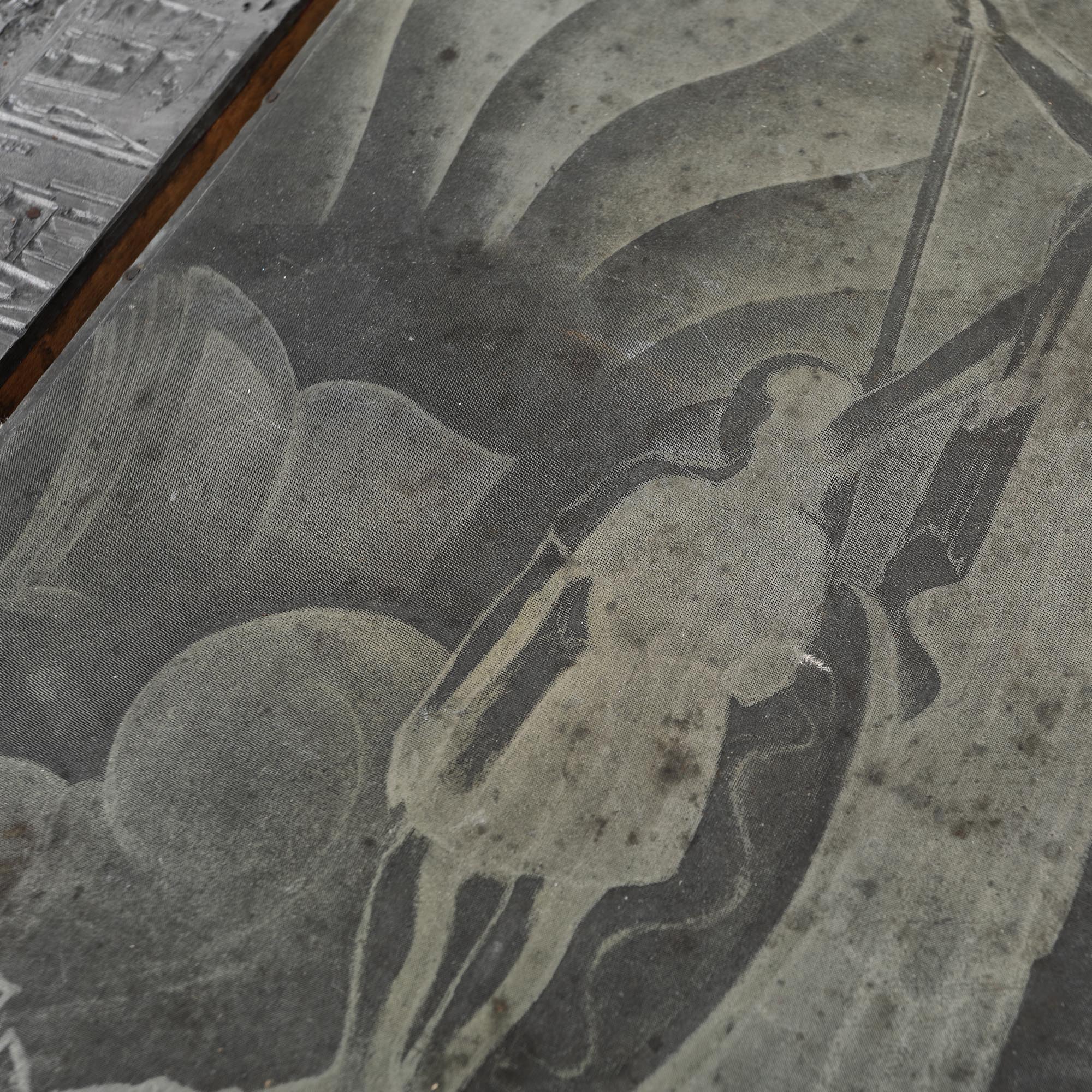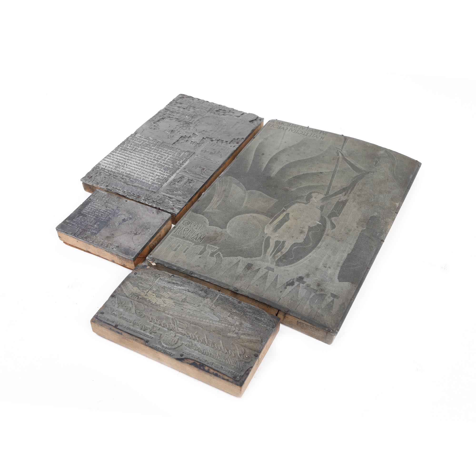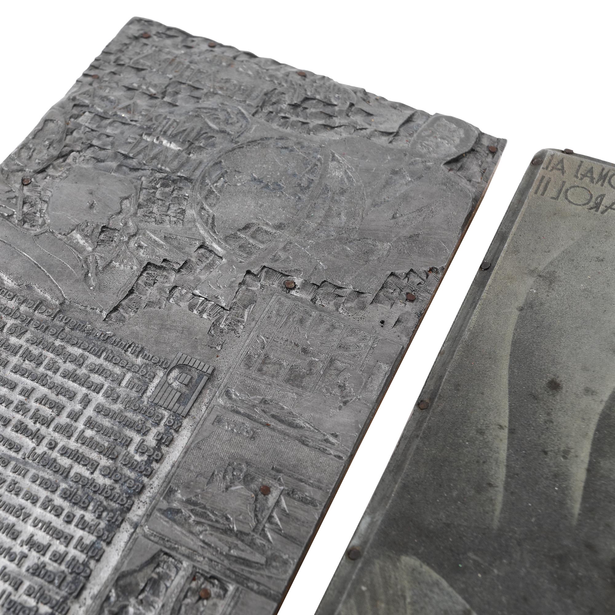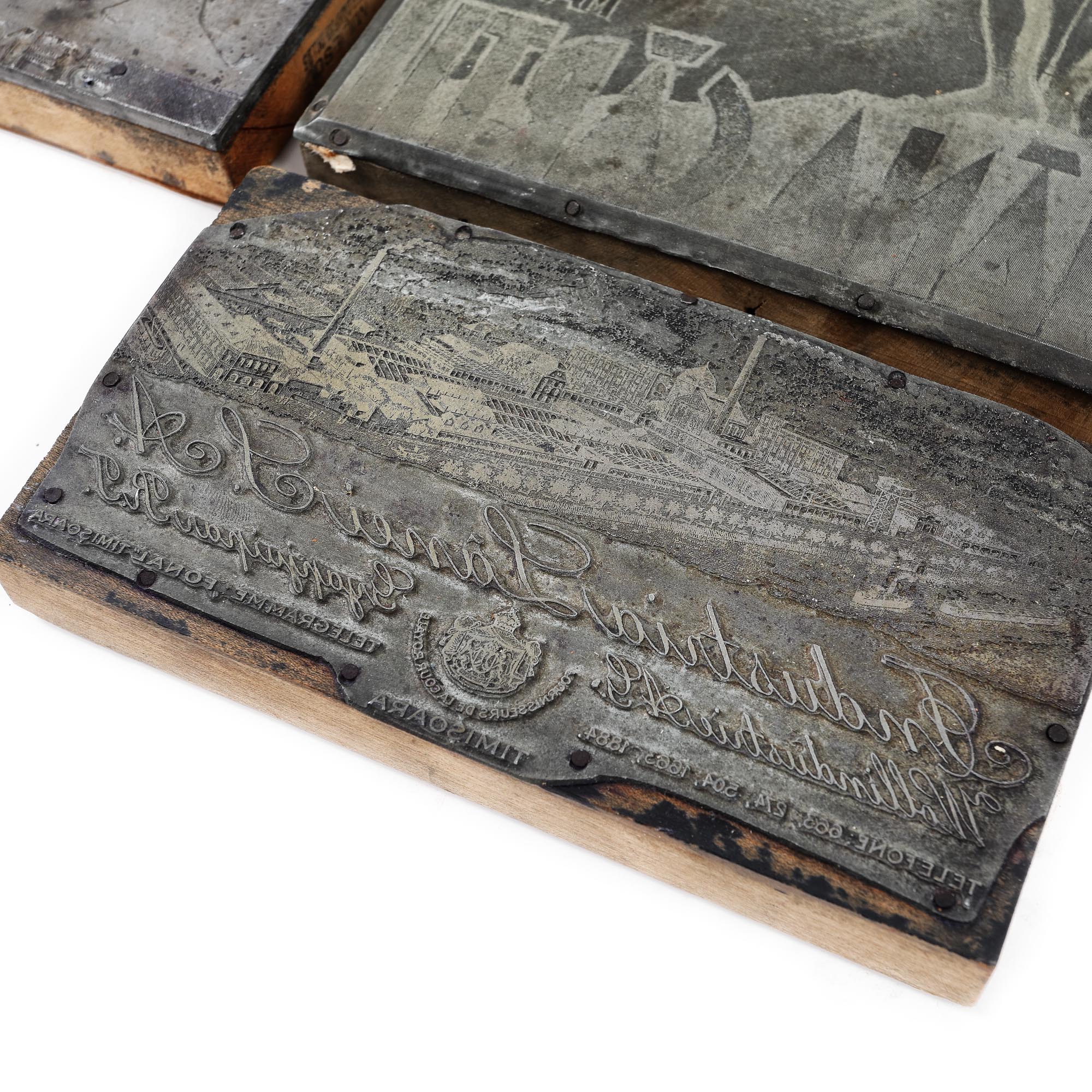 103. Lot format din patru plăci din zinc pentru gravură reprezentând coperta revistei ”Săptămâna Cărții”, un articol despre beneficiile telefoniei și reclamele pentru ”Industria Lânei S. A.”, ”Desinfectantul Semori”, cca. 1940