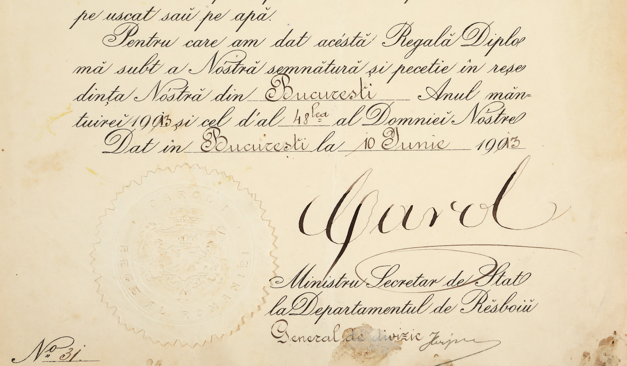 40. Brevet de înălțare la gradul de medic maior în rezervă, cu semnătura olografă a Regelui Carol I, 1913