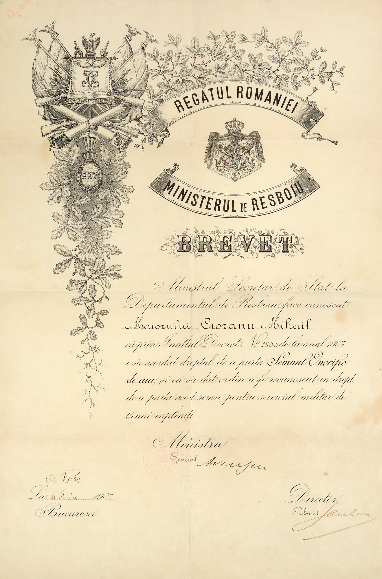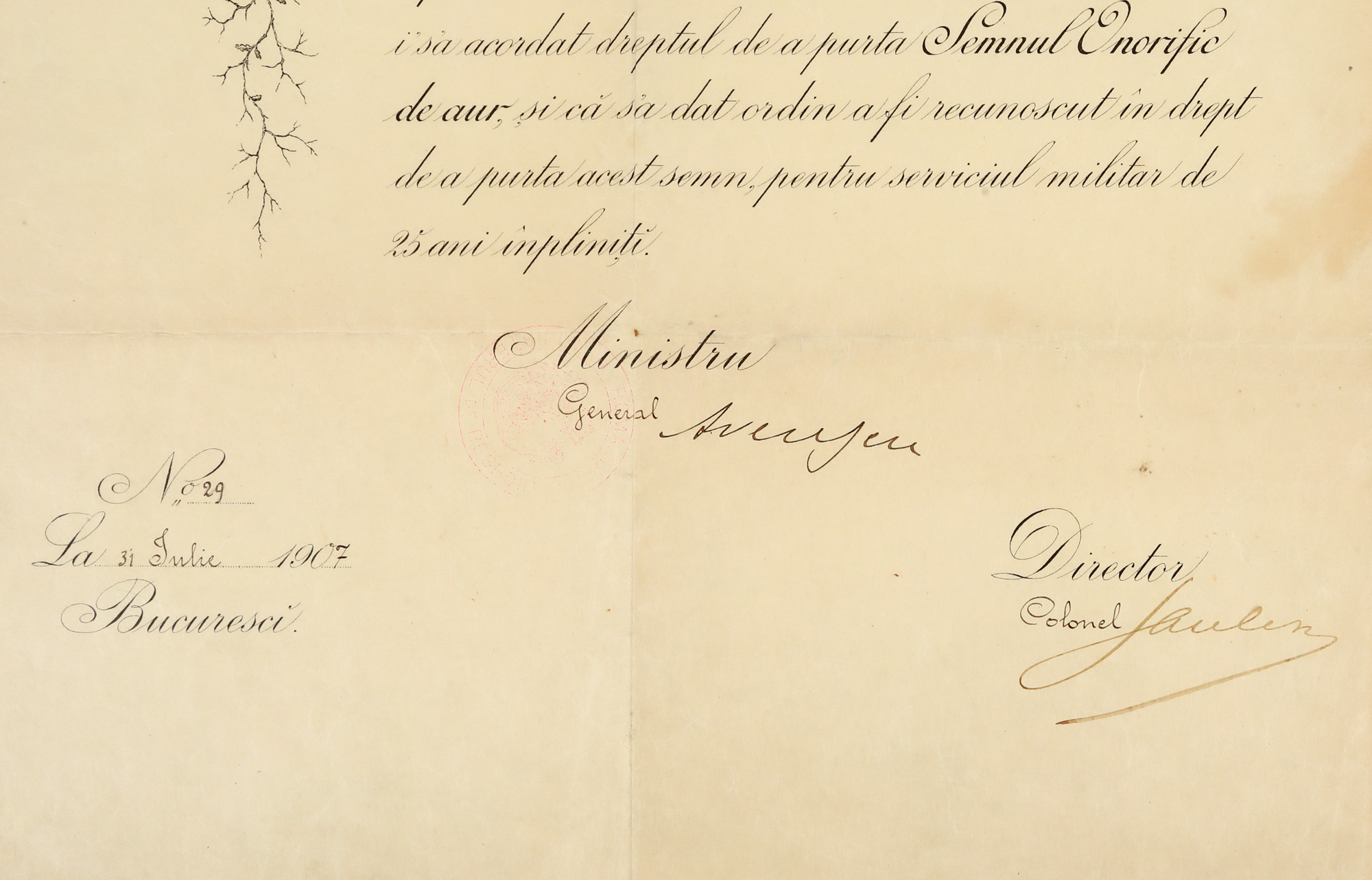 41. Brevet pentru "Semnul onorific de aur pentru 25 de ani de serviciu militar", cu semnătura olografă a generalului Alexandru Averescu, Ministru de Război, 1907
