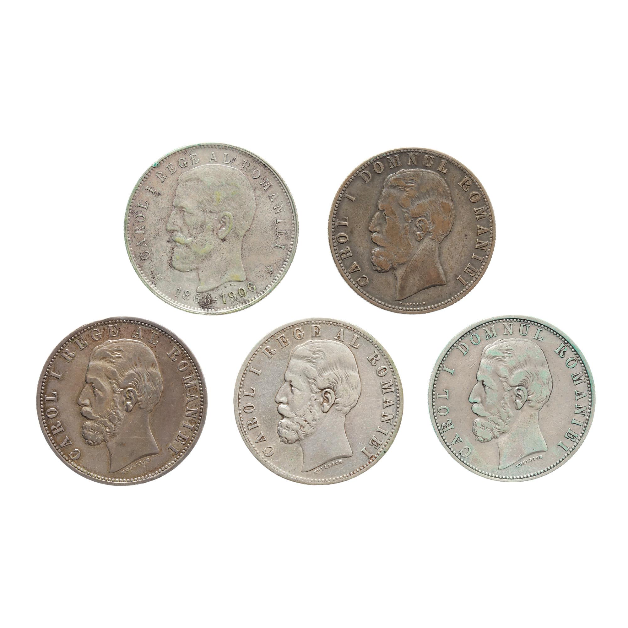 83. Lot format din cinci monede de 5 Lei, ani consecutivi 1880-1883 și 1906, argint