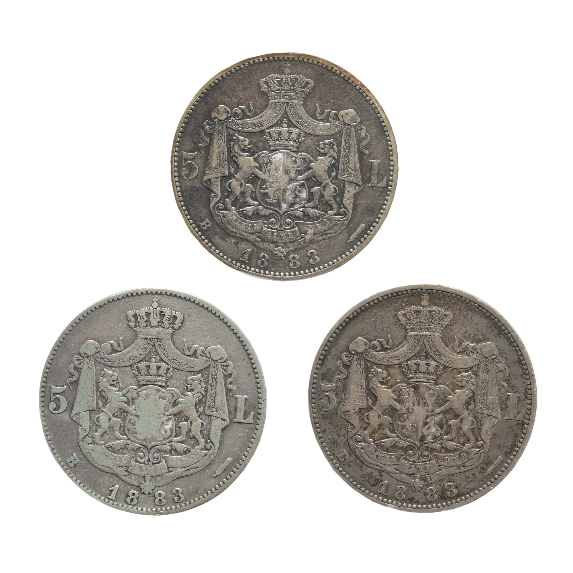 81. Lot format din trei monede de 5 Lei 1883, argint