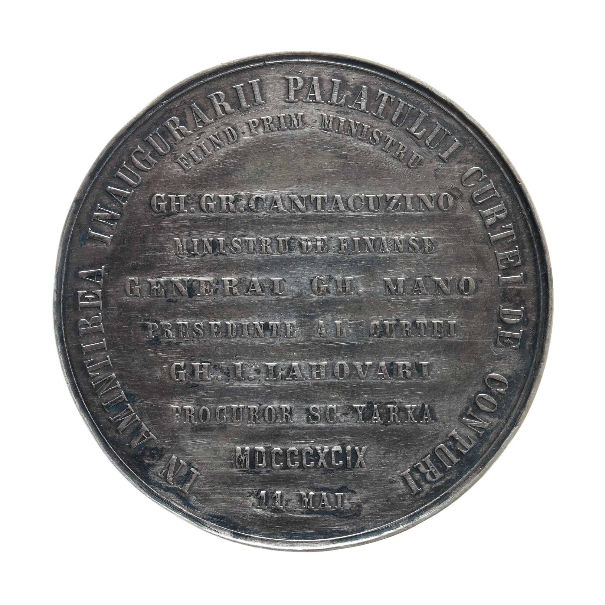 Aversul: Legendă circulară; bustul regelui Carol I spre stânga; Reversul: Legendă circulară pe două rânduri și liniară pe șapte rânduri;; Legenda aversului: CAROL I REGE AL ROMÂNIEI; Legenda reversului: ÎN AMINTIREA INAUGURĂRII PALATULUI CURTEI DE CONTURI FIIND PRIM MINISTRU GH, GR. CANTACUZINO, MINISTRU DE FINANȚE GENERAL GH. MANO, PREȘEDINTE AL CURTE GH.I.LAHOVARI,PROCUROR SC.YARKA MDCCCCIX