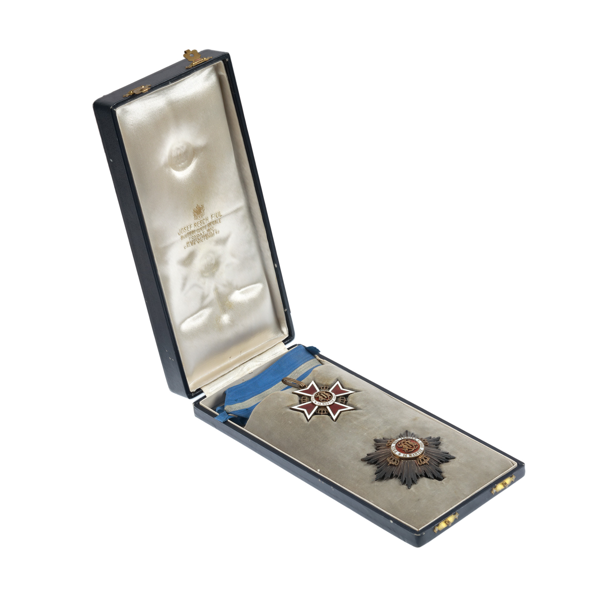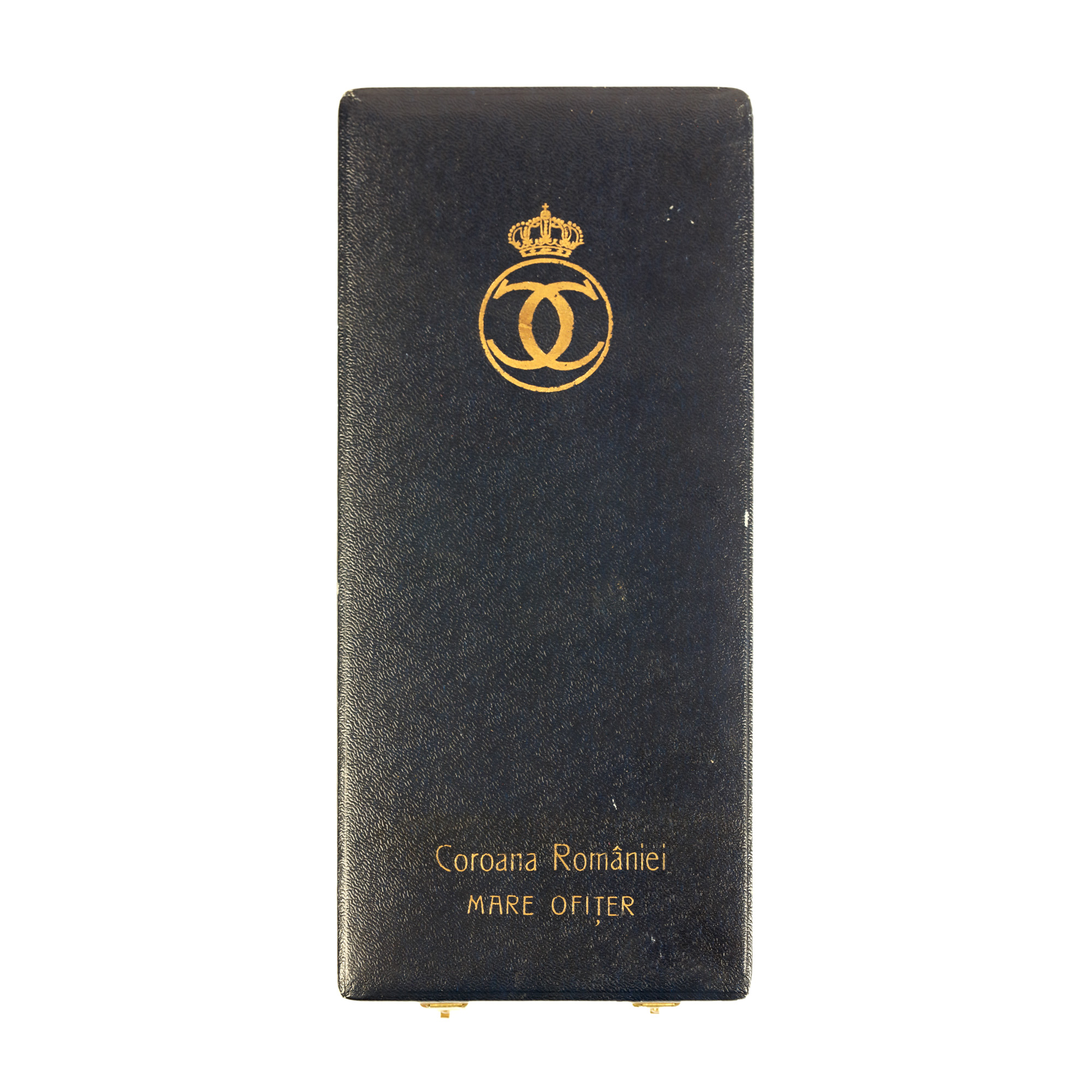 22. Ordinul "Coroana României", al doilea model 1932, Mare Ofițer, civil, în cutia originală cu cifrul Regelui Carol al II-lea, bijutier Joseph Resch fiul, argint aurit și email, perioada interbelică