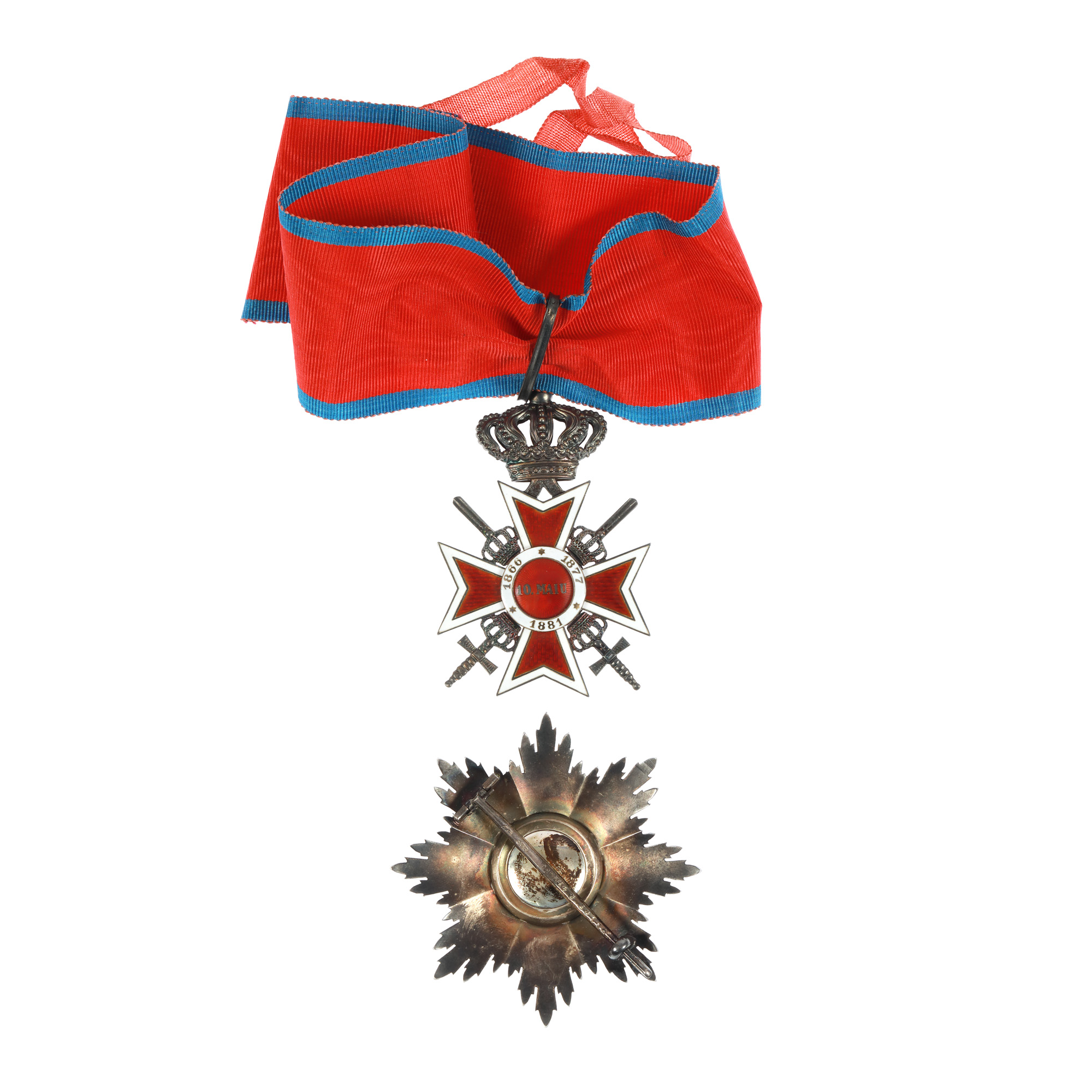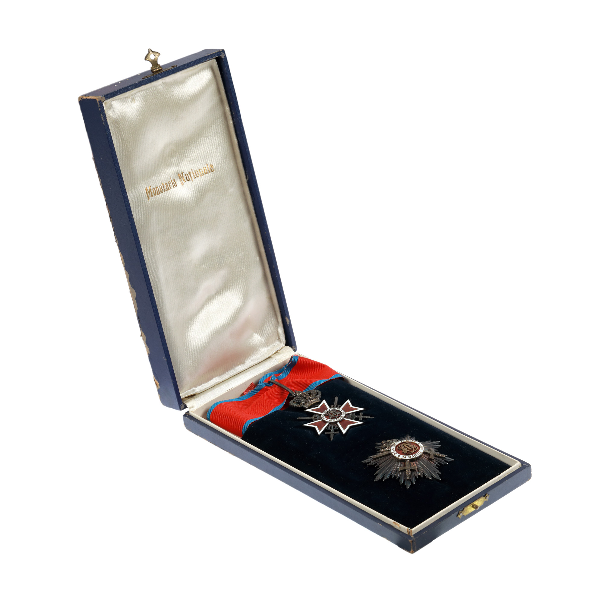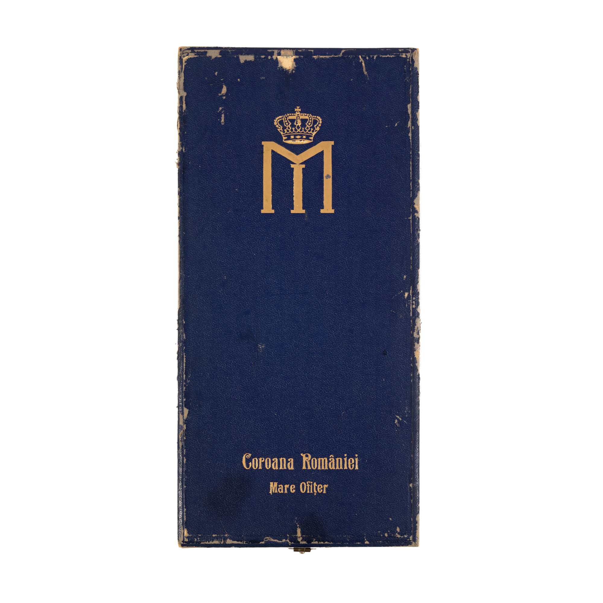 23. Ordinul "Coroana României", al doilea model 1938, Mare Ofițer, militar, cu panglică de Virtute Militară, în cutia originală cu cifrul Regelui Mihai I, bijutier Carl Friedrich Zimmerman, argint aurit și email, perioada celui de-al Doilea Război Mondial