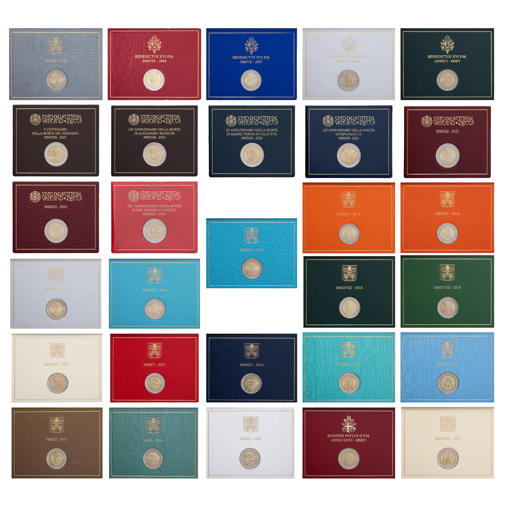 Lotul conține: Monedă comemorativă 2 Euro 2004, 75 de ani de la înființarea statului Vatican Monedă comemorativă 2 Euro 2005, Ziua Mondială a Tineretului, ediția XX Monedă comemorativă 2 Euro 2006, a 500-a Aniversare a Gărzii Elvețiene a Vaticanului Monedă comemorativă 2 Euro 2007, a 80-a Aniversare a Papei Benedict al XVI-lea Monedă comemorativă 2 Euro 2008, Anul Paulin (dedicat Sf. Paul) Monedă comemorativă 2 Euro 2009, Anul Internațional al Astronomiei Monedă comemorativă 2 Euro 2010, Anul Sacerdotal (dedicat rolului preotului în Biserică și în comunitate) Monedă comemorativă 2 Euro 2011, Ziua Mondială a Tineretului, ediția XXVI Monedă comemorativă 2 Euro 2012, Reuniunea Mondială a Familiei, ediția VII Monedă comemorativă 2 Euro 2013, Ziua Mondială a Tineretului, Rio de Janeiro, ediția XXVIII Monedă comemorativă 2 Euro 2014, a 25-a Aniversare a Căderii Zidului Berlinului Monedă comemorativă 2 Euro 2015, Reuniunea Mondială a Familiei, ediția VIII Monedă comemorativă 2 Euro 2016, Jubileul Milostivirii (împlinirea a 50 de ani de la Conciliul Vatican II) Monedă comemorativă 2 Euro 2016, Bicentenarul Corpului Jandarmeriei Vaticanului Monedă comemorativă 2 Euro 2017, Centenarul Apariției Fecioarei Maria la Fátima Monedă comemorativă 2 Euro 2017, a 1950-a Aniversare a Martiriului Sfinților Petru și Paul Monedă comemorativă 2 Euro 2018, Anul European al Patrimoniului Cultural Monedă comemorativă 2 Euro 2018, a 50-a Aniversare a Morții lui Padre Pio Monedă comemorativă 2 Euro 2019, a 25-a Aniversare a finalizării restaurării Capelei Sixtine Monedă comemorativă 2 Euro 2019, 90 de ani de la înființarea statului Vatican Monedă comemorativă 2 Euro 2020, Centenarul nașterii Sfântului Ioan Paul al II-lea Monedă comemorativă 2 Euro 2020, a 500-a Aniversare a morții pictorului Rafael Sanzio Monedă comemorativă 2 Euro 2021, a 700-a Aniversare a morții lui Dante Alighieri Monedă comemorativă 2 Euro 2021, a 450-a Aniversare a nașterii pictorului Caravaggio Monedă comemorativă 2 Euro 2022, a 125-a Aniversare a nașterii Papei Paul al VI-lea Monedă comemorativă 2 Euro 2022, a 25-a Aniversare a morții Maicii Tereza Monedă comemorativă 2 Euro 2023, a 150-a Aniversare a morții scriitorului Alessandro Manzoni Monedă comemorativă 2 Euro 2023, a 500-a Aniversare a morții pictorului Pietro Perugino Monedă comemorativă 2 Euro 2024, a 750-a Aniversare a morții Sfântului Toma de Aquino
