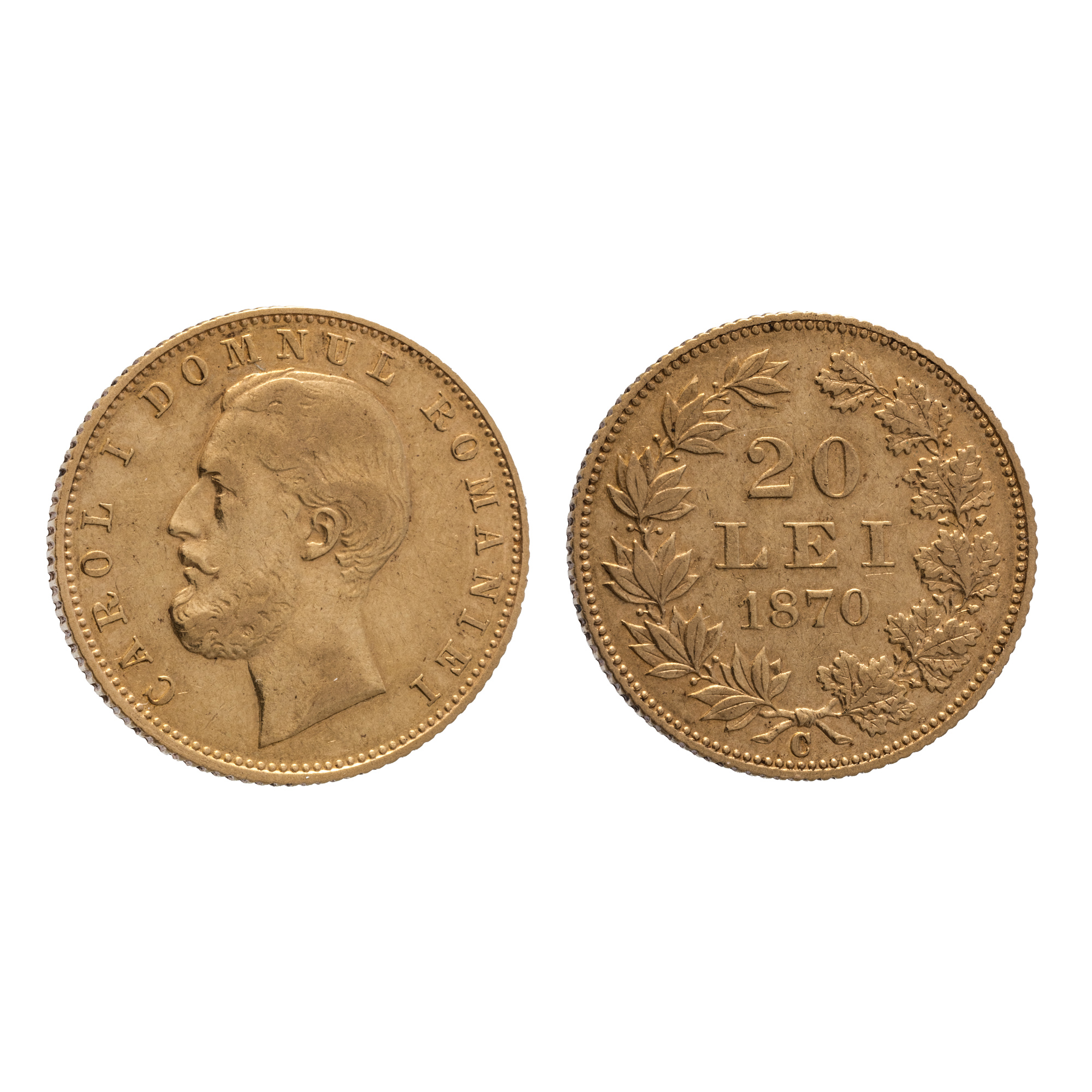 20 Lei 1870 a fost a doua monedă românească de aur bătută de statul român modern. Prima (tot un 20 de lei, bătută în 1868) fusese destinată doar protocolului şi recunoaşterii internaţionale. Această a doua piesă de aur însă a fost menită circulaţiei. Doar 5.000 de piese au ieşit din monetăria din Bucureşti, ce fusese inaugurată în anul 1870 (în catalogul Schäffer - Stambuliu din 2009 se afirmă că monedele de aur din 1870 au fost bătute la Berlin, iar efigia lui Carol I a fost gravată de Kullrich). Tirajul mic face ca această piesă de aur să fie una din cele mai mari rarităţi din numismatica românească.