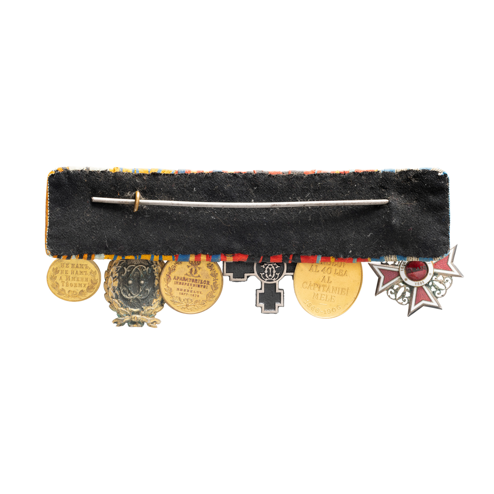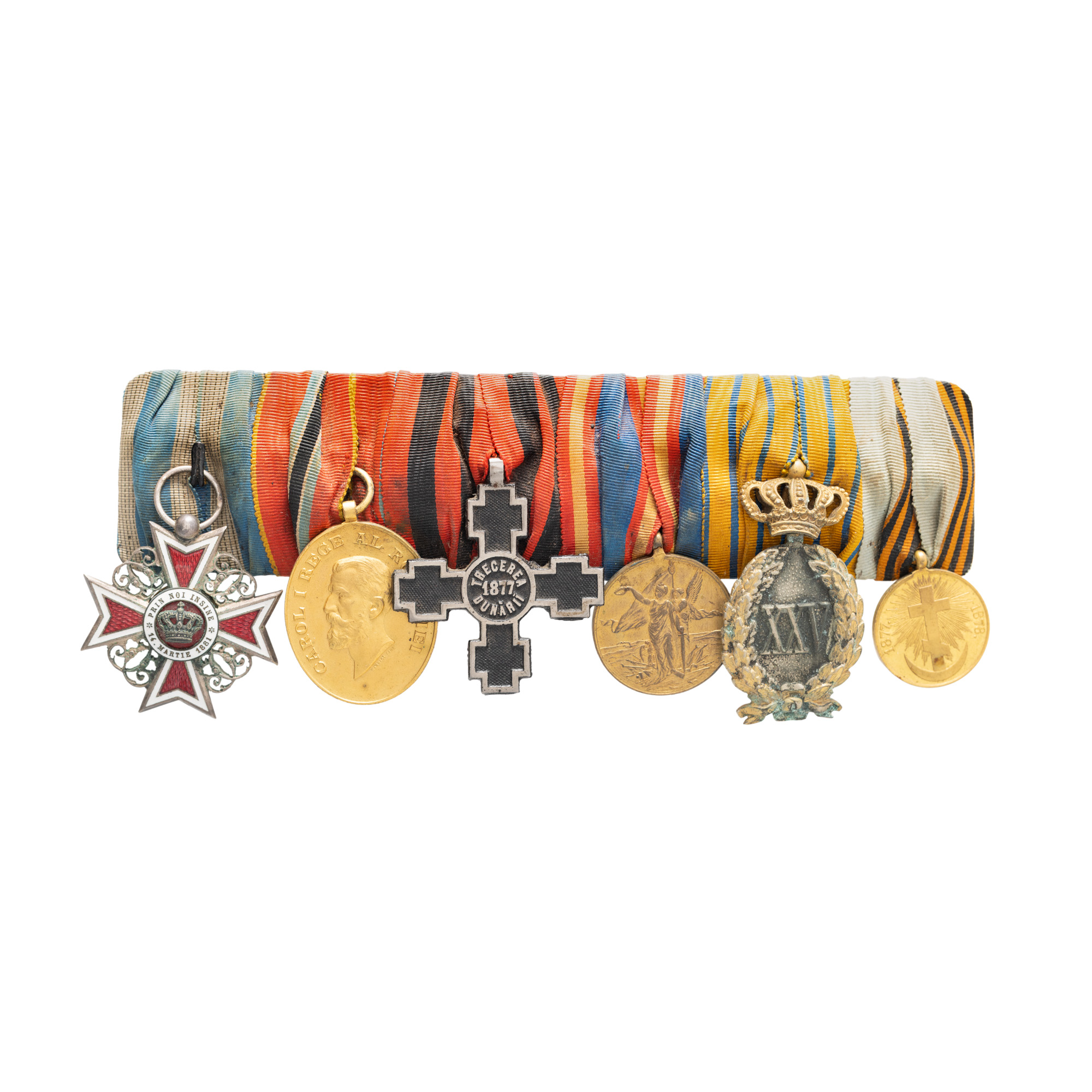 Bareta reprezintă mai mult decât o simplă înșiruire de distincții militare - ea este o mărturie concretă a devotamentului, curajului și angajamentului față de idealurile naționale într-un moment crucial al istoriei României moderne. Prin fiecare element care o compune, această bareta reflectă nu doar meritele personale ale ofițerului, ci și transformările majore prin care a trecut statul român în drumul său spre suveranitate. Ordinul Coroana României este una dintre cele mai prestigioase distincții regale, instituită de Carol I în 1881, imediat după proclamarea Regatului. Acordarea acestui ordin subliniază recunoașterea contribuțiilor excepționale aduse de ofițer nu doar pe câmpul de luptă, ci și în consolidarea noului stat român. El marchează apartenența la o elită militară și morală care a contribuit direct la afirmarea independenței. Crucea „Trecerea Dunării”, decorație specifică Războiului de Independență, evocă unul dintre cele mai dramatice și simbolice momente ale campaniei: trecerea trupelor române peste Dunăre, într-un gest de hotărâre strategică ce a consfințit participarea efectivă a României în confruntarea cu Imperiul Otoman. Această distincție este dovada implicării directe a ofițerului în momentele cheie ale conflictului. Semnul Onorific pentru 25 de ani de serviciu atestă o carieră militară îndelungată, desfășurată cu loialitate și profesionalism. Această decorație adaugă o dimensiune de durabilitate și statornicie baretei, sugerând că ofițerul nu a fost doar un erou de moment, ci un slujitor constant al armatei române și al statului. În fine, Medalia Campaniei Războiului Ruso-Turc reflectă participarea concretă pe front, alături de trupele ruse, într-o alianță decisivă pentru recunoașterea internațională a independenței României. Este o distincție care simbolizează suferința, curajul și solidaritatea în fața unui inamic comun. Privită în ansamblu, această bareta este o „cronică în miniatură” a unei epoci formative pentru statul român. Ea vorbește despre lupta pentru suveranitate, despre onoare militară, loialitate și sacrificiu personal. Într-un muzeu sau în colecția unei familii, ea nu este doar un obiect istoric, ci o punte de memorie între trecutul eroic și identitatea națională de astăzi.