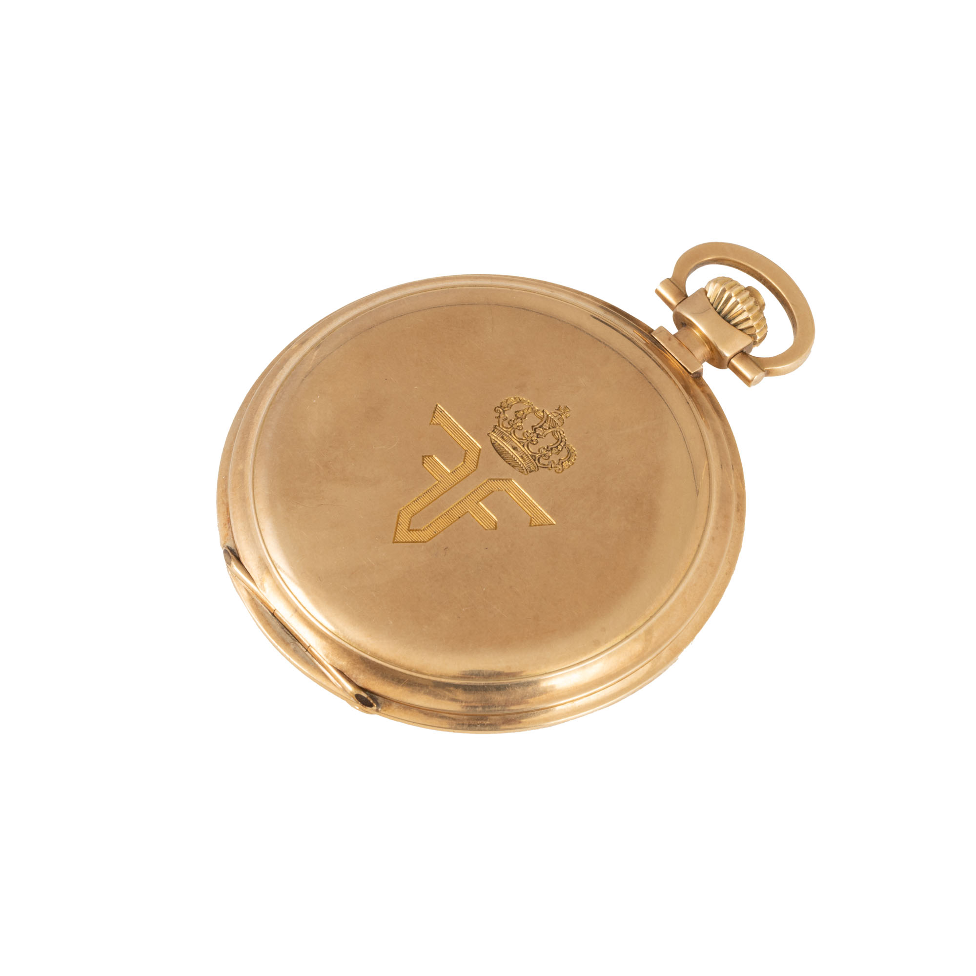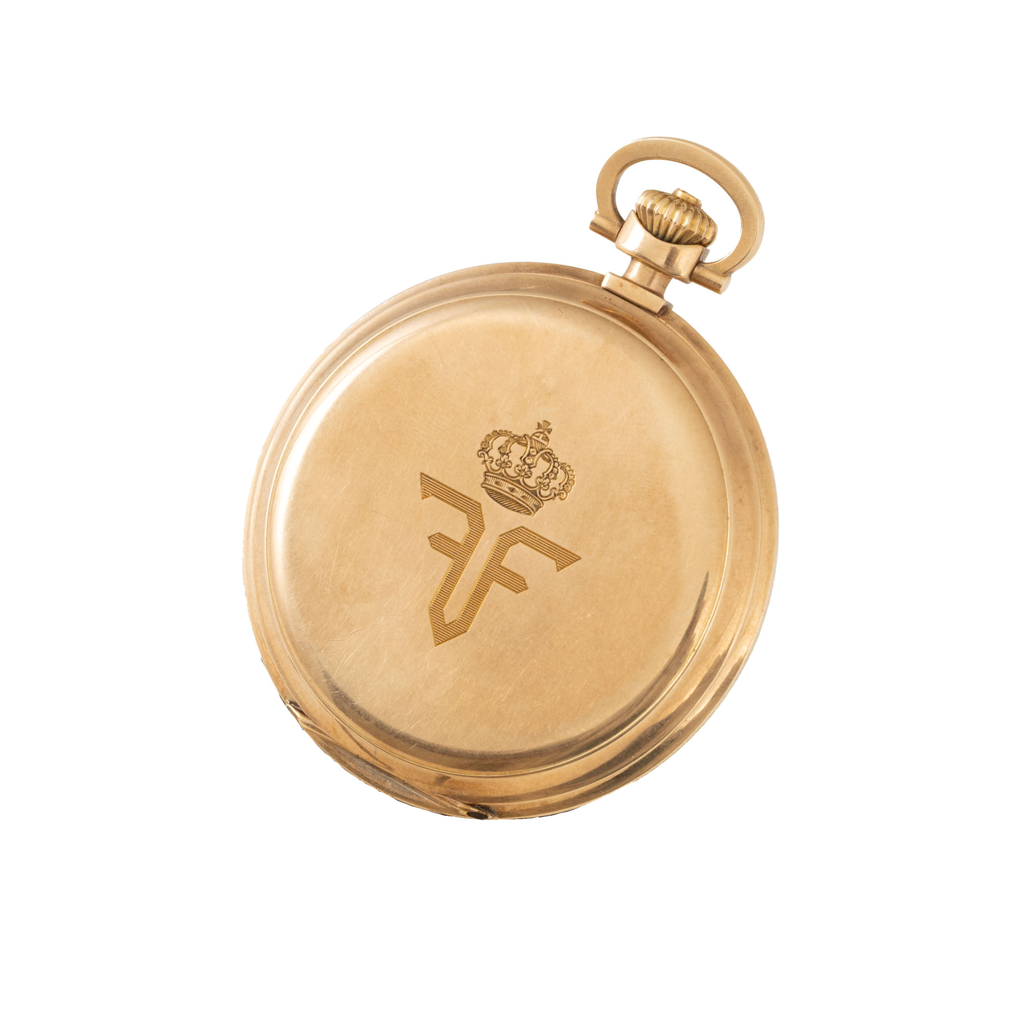 77. Ceas din aur, de buzunar, decorat cu cifrul Regelui Ferdinand, cca. 1920, piesă rară, de colecție