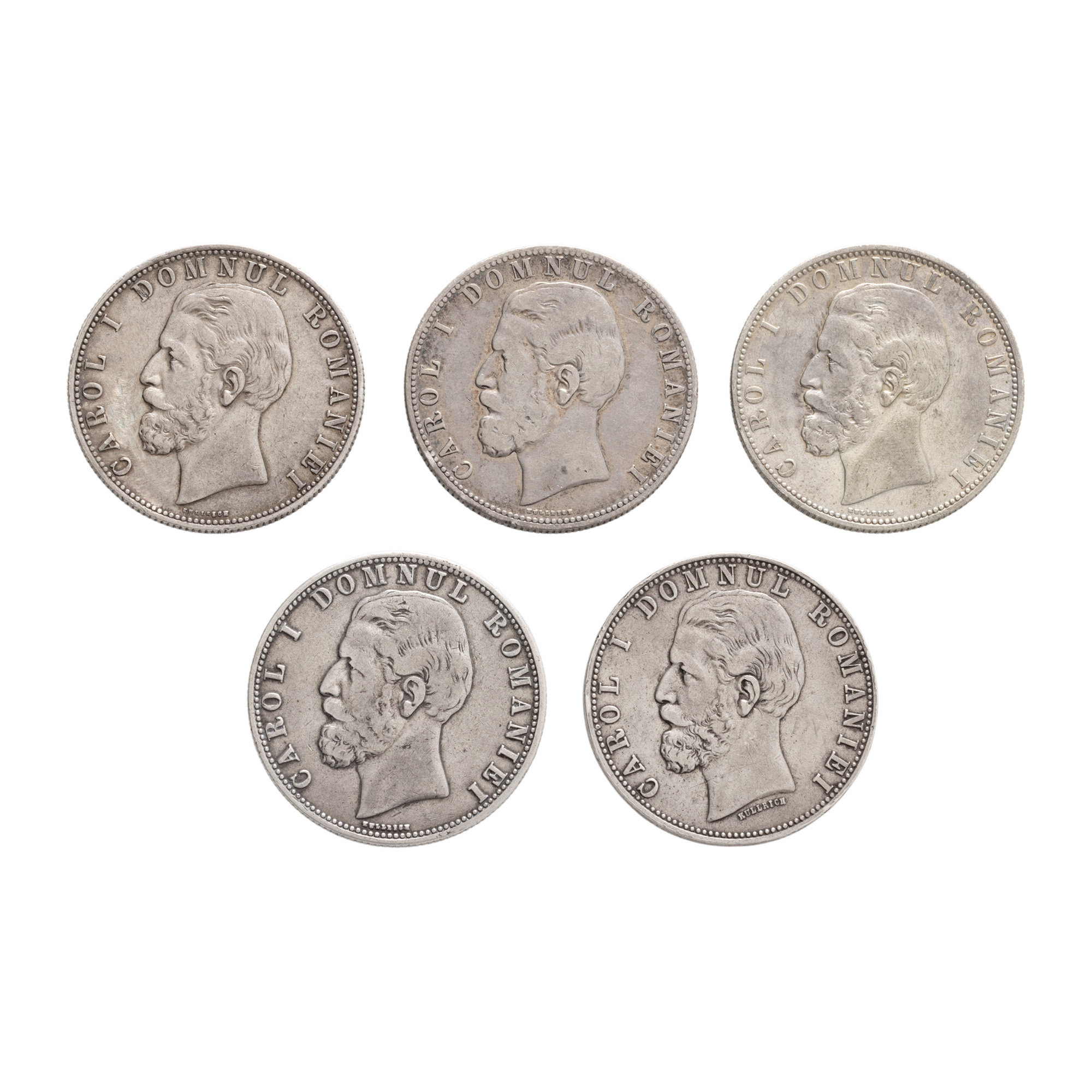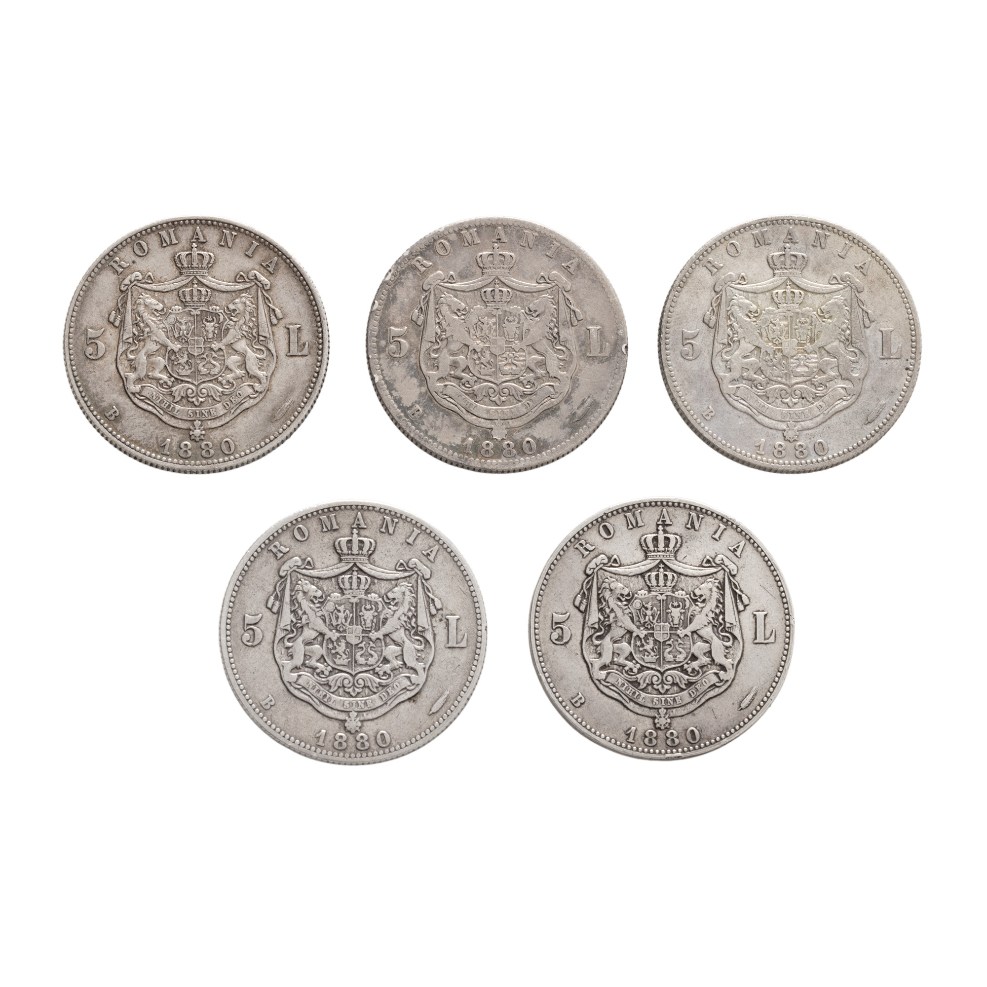 37. Lot format din cinci monede 5 Lei, Carol I, 1880, argint