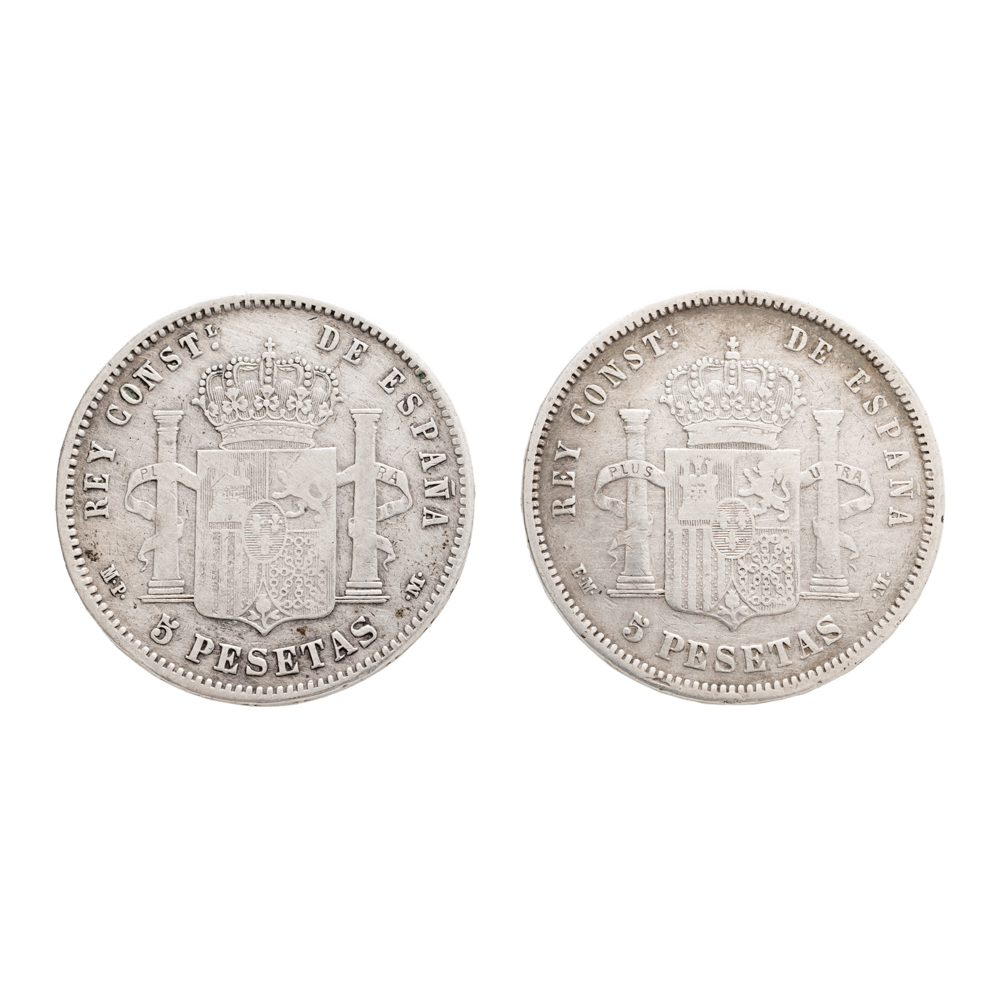 36. Lot format din două monede 5 Pesetas spaniole, Alfonso XII, 1879 și 1885, argint