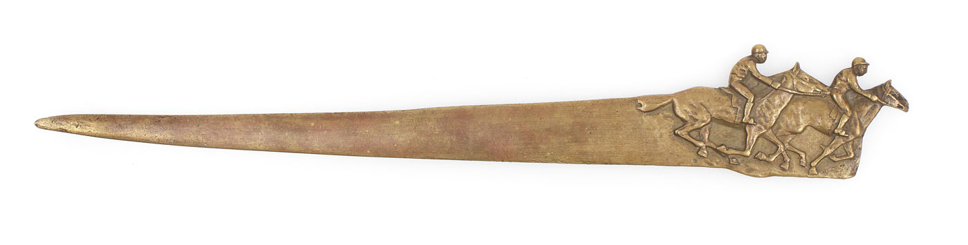 44. Coupe-papier din alamă, ornat cu motive hipice, începutul sec. XX