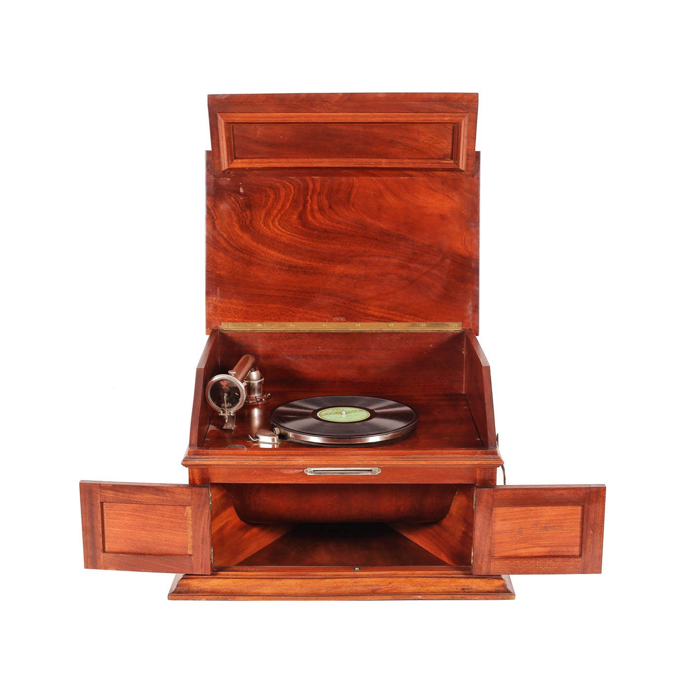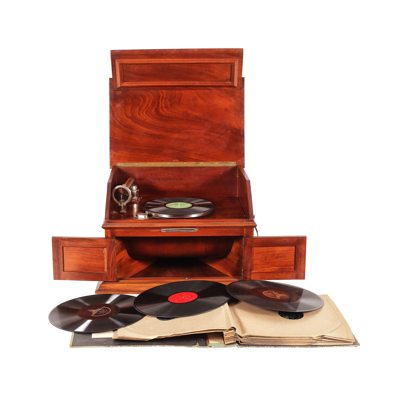 48. Fonograf "Pathéphone No 36" din lemn de nuc, însoțit de 12 discuri vinyl conținând arii din opere și operete celebre (Giacomo Puccini, Giuseppe Verdi, Georges Bizet și Wolfgang Amadeus Mozart), cca. 1920