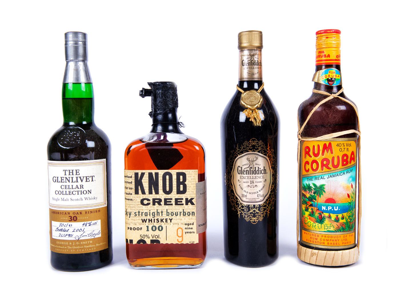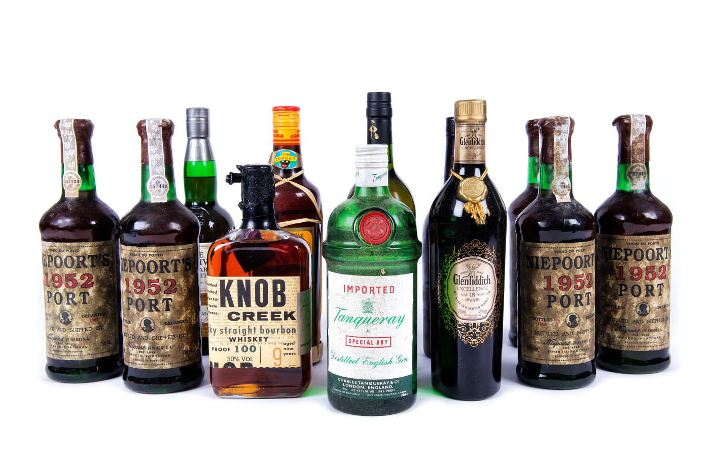 1 x Knob Creek Kentucky Straight Bourbon 9 yrs hand bottled, Kentucky, USA, 70cl 1 x Glenfiddich Excellence 18yrs, Scotland, 70cl 1 x Tio Pepe Sherry, Spain, 75cl 5 x Dow’s Port, Portugal, 1952, 75cl 1 x Dow’s Port, Portugal, 1972, 75cl 1 x Rum Coruba, Jamaica, 70cl 1 x Tanquerai Special Dry Gin, Scotland, 100cl 1 x Glenlivet 30yrs, bottled 2001 Cellar Collection, Scotland, 70cl