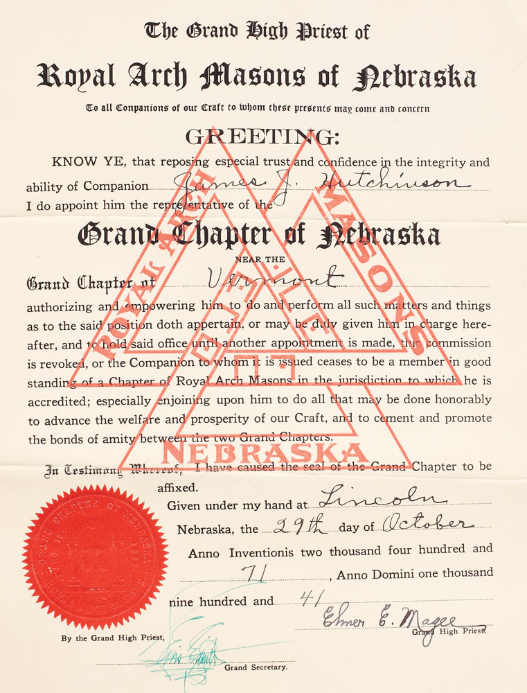 187. Certificat masonic, loja Royal Arch din Nebraska, Statele Unite ale Americii,1941