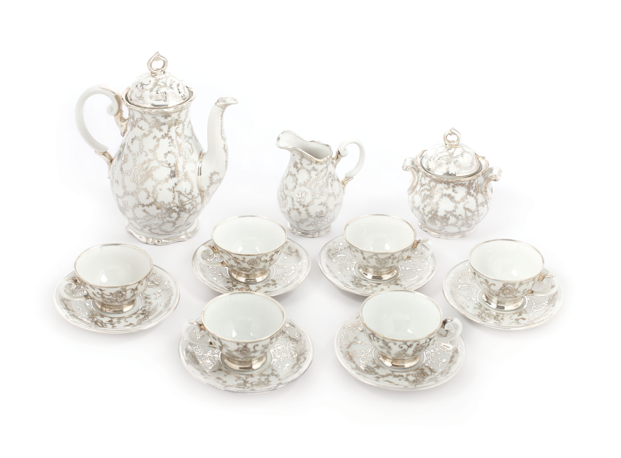 Serviciu pentru ceai pentru șase persoane, cu cafetieră, letieră, sucrieră cu capac și ceșcuțe cu farfurioare sucupe, cu decor de argint ramuri înflorite pe fond alb.