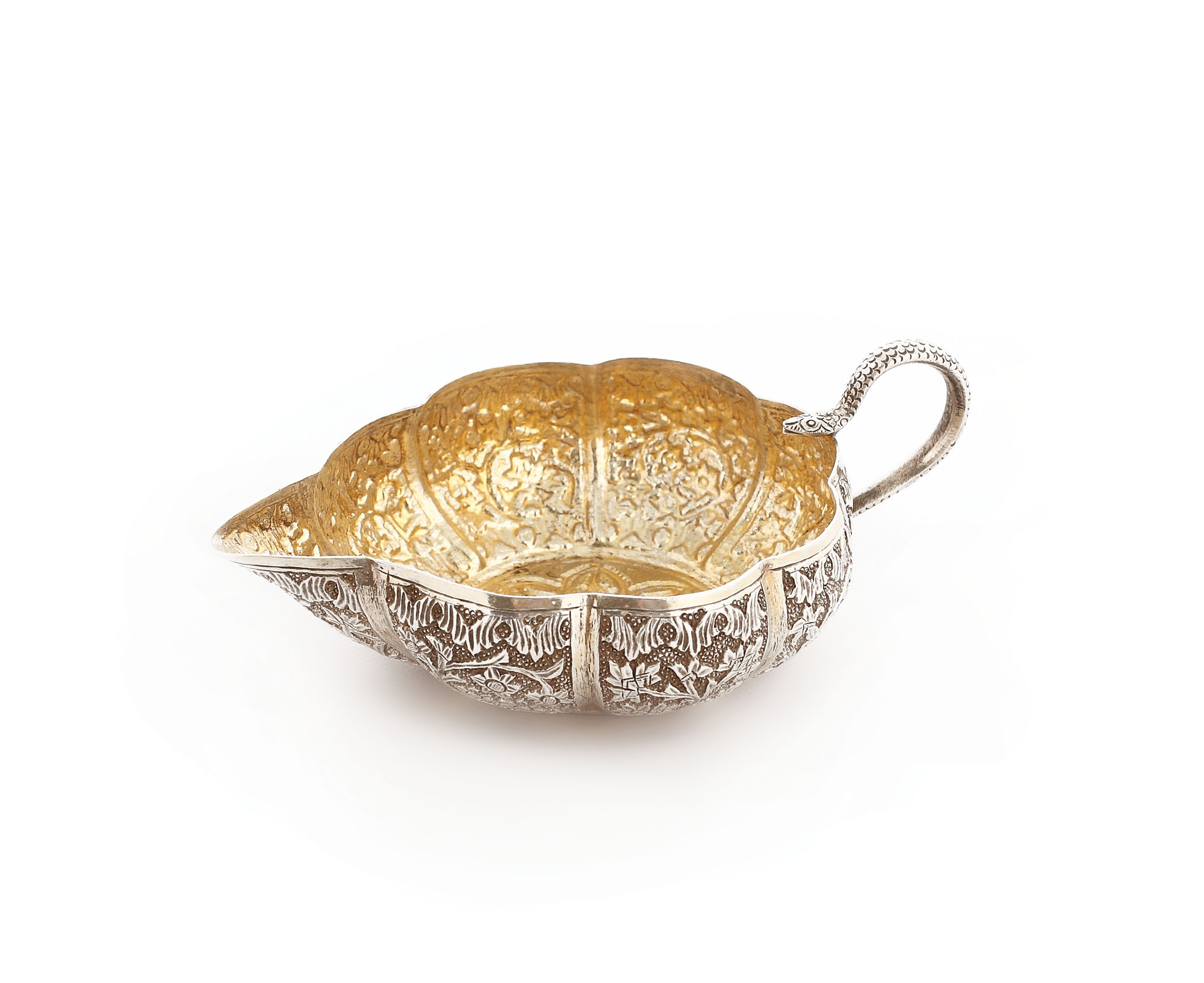Vas mic, semisferic, cu ansă șarpe și țurțure și corpul lobat decorat în stil orientalizant, cu ramuri mărunte. Piesa prezintă poanson de import Elizabeth Taylor (Londra).