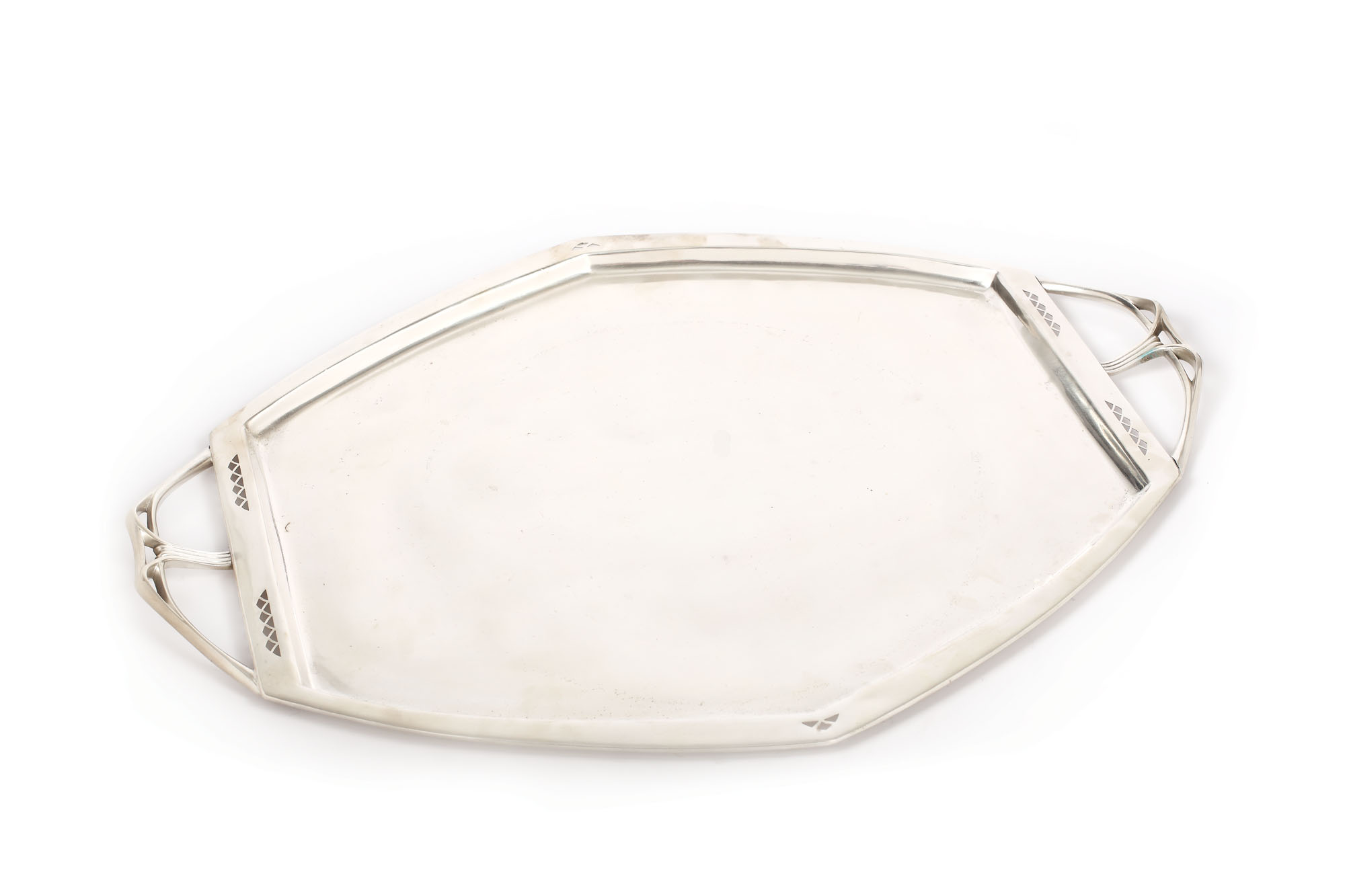 Tavă mare, romboidală, cu bordura perforată cu motive triunghiulare și anse. În stil Sezession.