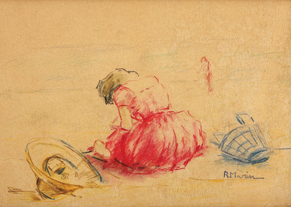 Rodica Maniu a fost una dintre artistele care s-au remarcat în perioada interbelică, lucrând atât ulei, cât şi acuarelă sau grafică. Peisajul este genul pe care l-a practicat cu predilecţie, pictând locurile prin care a trecut, în Italia şi Franţa. În 1923 s-a căsătorit cu Samuel Mutzner şi a călătorit alături de acesta, împărtăşind fascinaţia pentru Orient şi transpunând pe pânze impresiile lăsate de arhitectura clădirilor, atmosfera bazarurilor, viaţa oamenilor şi natura locurilor. Rodica Maniu a devenit cunoscută contemporanilor săi prin tematica marină pe care a abordat-o în multe dintre lucrările sale. A pictat ţărmul Mării Negre în Dobrogea, la Balcic, Caliacra şi Cavarna, fiind interesată de redarea momentelor spontane şi surprinderea efectelor de lumină în continuă schimbare. A adoptat elemente stilistice postimpresioniste, pe care le-a îmbinat cu o viziune romantică, ce poate fi descifrată în atitudinile teatrale şi costumele personajelor sau în spectacolul pe care îl oferă natura, cu vegetaţia bogată şi strălucirea atmosferei. Lucrul cu creionele colorate, precum şi cu acuarela, îi dă posibilitatea de a imprima cu rapiditate efectele schimbătoare de lumină, atunci când lucrează în natură. Strălucirea razelor de soare de după-amiază aproape că şterge culorile mării şi ale nisipului, estompează contururile personajului şi scaldă imaginea într-o atmosferă plată. În acest decor îşi plasează artista scena, în care o femeie, o pălărie şi un coş spun povestea unei trăiri sufleteşti marcate de melancolie.