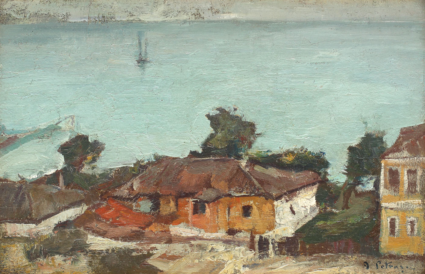 ‘‘Ca să privească în lume, domnul Petrașcu își trage pălăria pe sprâncene sau așteaptă să se facă noapte. [...] ființele și lucrurile fumurii par a fi fost prealabil tăvălite prin funingine și cerneală [...] paleta domnului Petrașcu pare alăturată în permanență la ustensilele unui depou de antracit și turbă. Casele, zidite din brichete și spoite cu chinoroz, sunt acoperite cu ardezie și grafit. Copacii, preparați încă din viață pentru strungărie, par supuși tratamentului acid al ebenistului. Plăci de tuci pardosesc drumurile. Apele sunt de catifea și bumbac, dat cu lac’’. Cuvintele lui Tudor Arghezi , apărute în cadrul revistei “Facla” (16 martie) drept recenzie a unei expoziții a lui Petrașcu din cursul anului 1913 – expoziția personală la Ateneul Român, 3 martie-1 aprilie – ne oferă principalele directive ale picturii lui Gheorghe Petrașcu, așa cum se defineau ele la începutul perioadei de maturitate. Opera de față aparține acestei decade de după descoperirea Balcicului (1913), moment în care paleta artistului resimte anumite transcendențe în regimul cromatic, evident sub directa influență a atmosferei sud-dobrogene – fapt universal adevărat pentru majoritatea artiștilor ce descopereau Balcicul și întreaga Coastă de Argint. În ceea ce privește peisajul marin, Petrașcu nu este direcționat doar de fluxul imaginar dobrogean, fiind cunoscut întregul itinerar pe care artistul îl modelează în urma unor călătorii inițiatice. Alături de orașele de pe malul Mării Negre sau al Dunării, Petrașcu va picta încă din deceniului doi al secolului trecut în nordul Franței (Roscoff, Saint Malo) sau marine italienești (Veneția și Chioggia), dezvoltând o adevărată tipologie în conceperea, pictarea și direcția estetică a acestor peisaje definite de mediul acvatic. Aspectul de materialitate și volumetrie dat de pasta bogată este contrabalansat uneori în peisaj de petele de culoare ale unei palete ce s-a deschis treptat, Petrașcu fiind recunoscut pentru pasiunea de a picta noaptea ori la crepuscul sau, așa cum același Arghezi observa, “din negru purced culorile sale toate”. De altfel, nu doar Arghezi traduce o anumită poezie a peisajului petrașcian, Zambaccian fiind și el atras de marinele pictorului “Acea nostalgie marină pe care numai noi, cei născuţi şi crescuţi la mare credeam că o simţim, ne-a redat-o magistral Petraşcu, cel născut pe şes. La mare sau prin ţinuturile încărcate cu vapori, unde lumina vine tamisată şi contrastele dispar, paleta lui Petraşcu se înmoaie ca prin minune. În această atmosferă învăluită, vânjosul pictor se potoleşte, negrul lui se diluează pe paletă, roşul se calmează, iar albastrul şi cobaltul se îmbină într-o baie de verde émeraude, dând picturii acea fericită armonie şi nobleţe apuseană.”(I.P.)