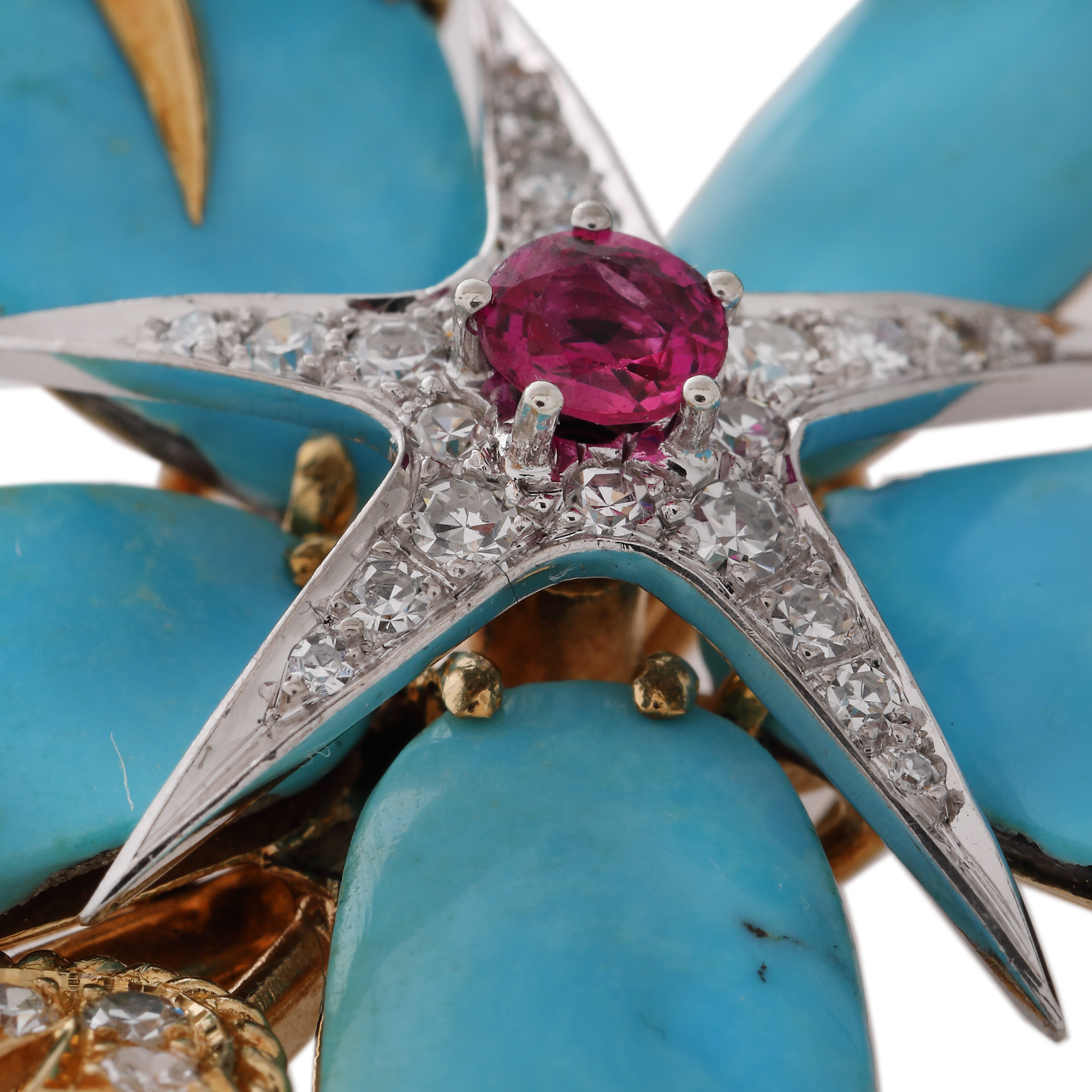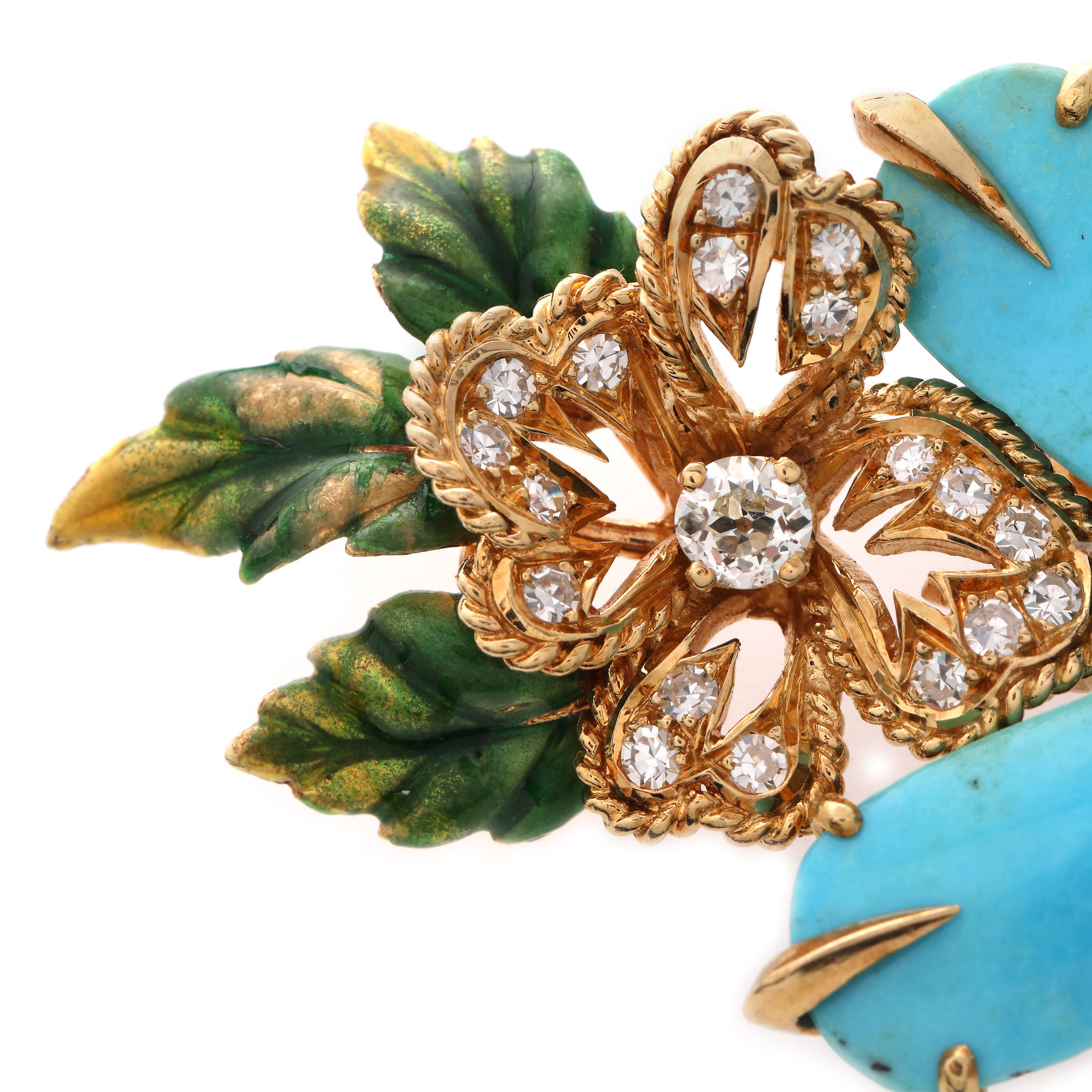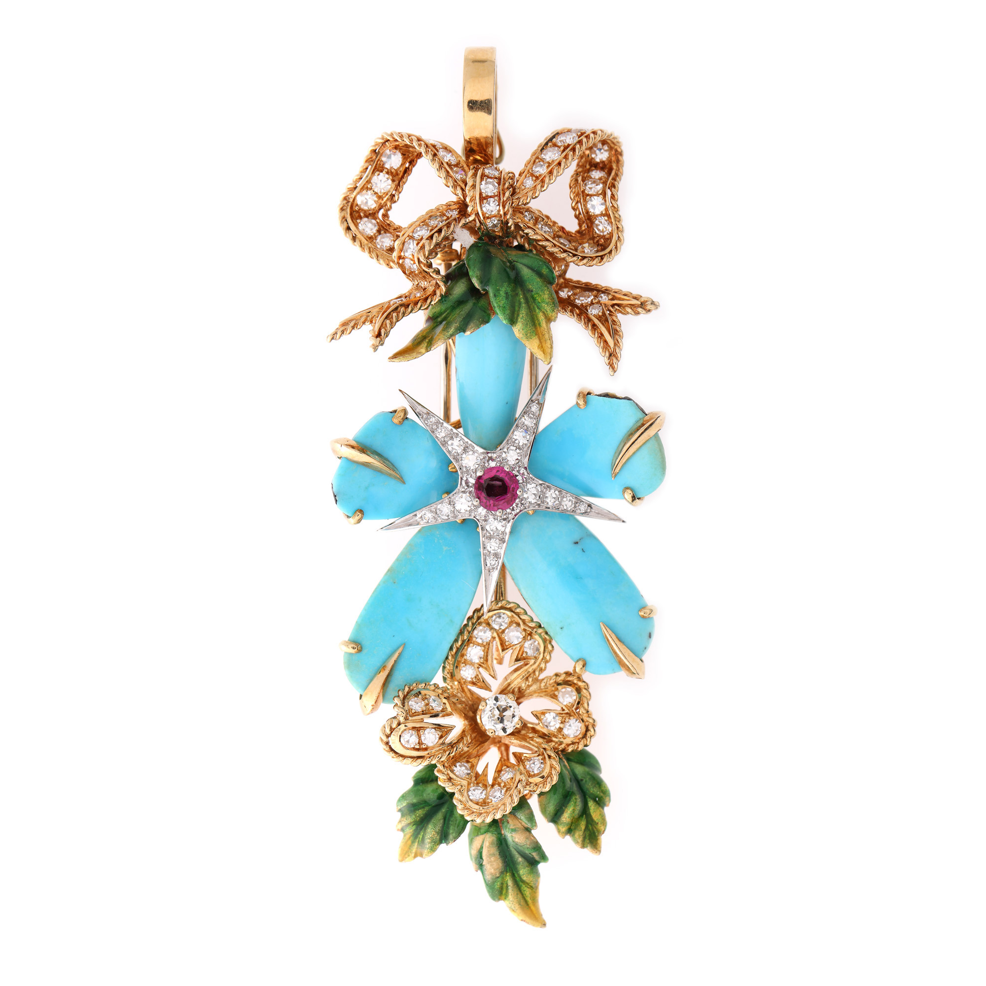 65. Broșă-pandantiv René Kern din aur, decorată cu turcoaze, diamante, rubin și email, piesă de colecție [Cca. 1970-1990]