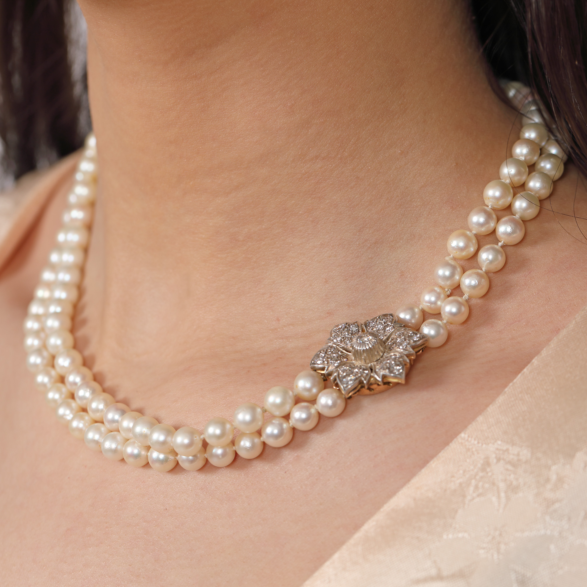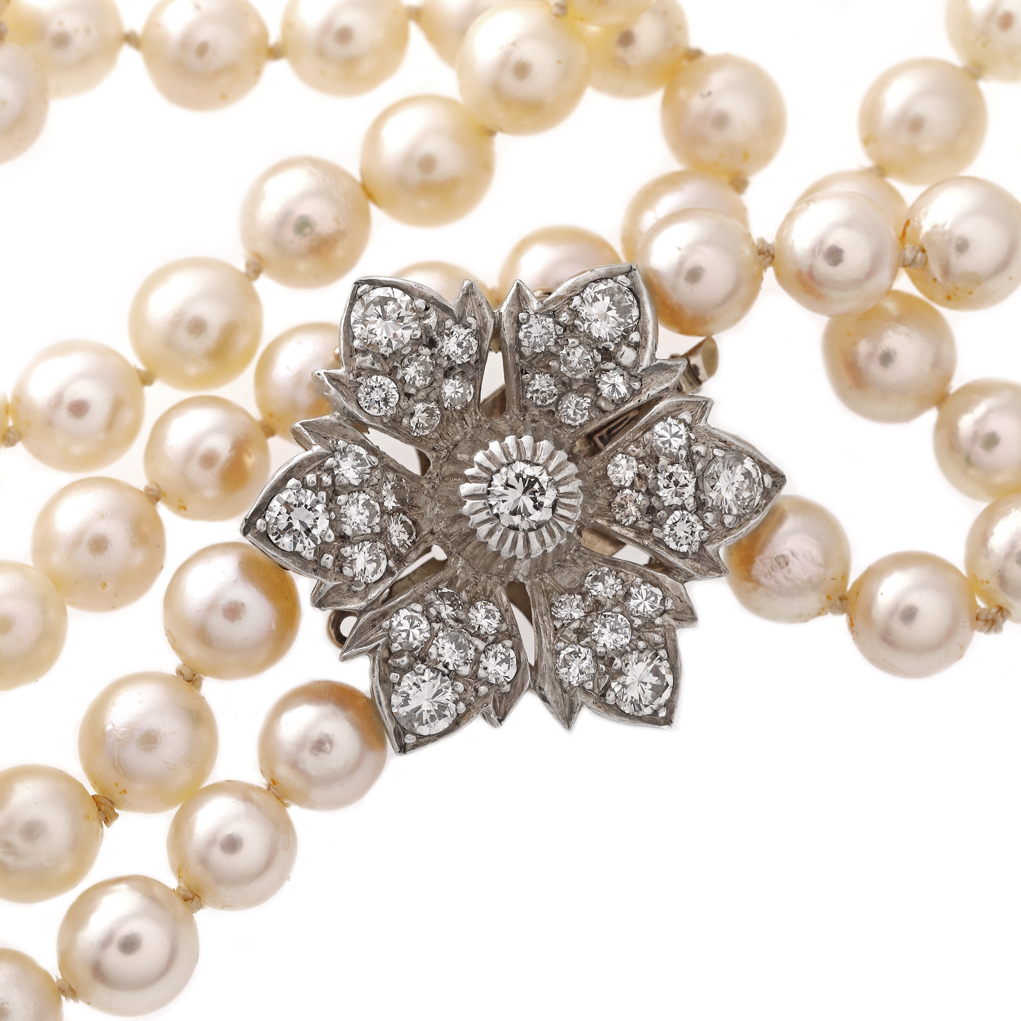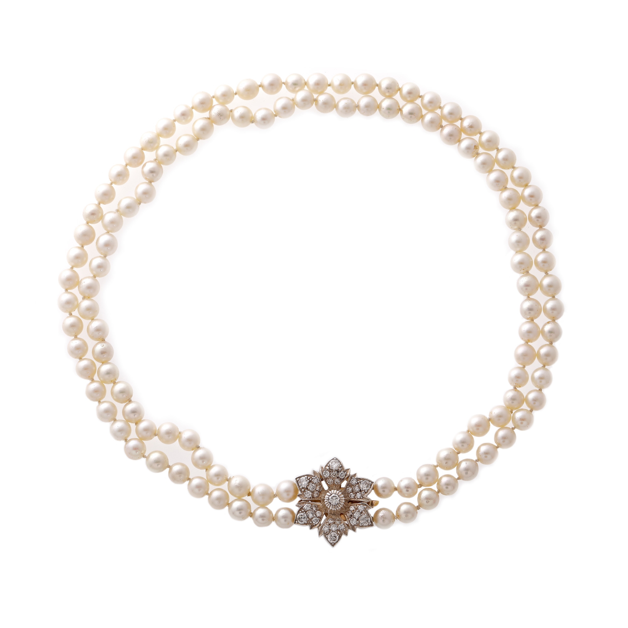 87. Colier din perle Akoya, cu închizătoare din aur și argint în forma unei flori ornată cu diamante