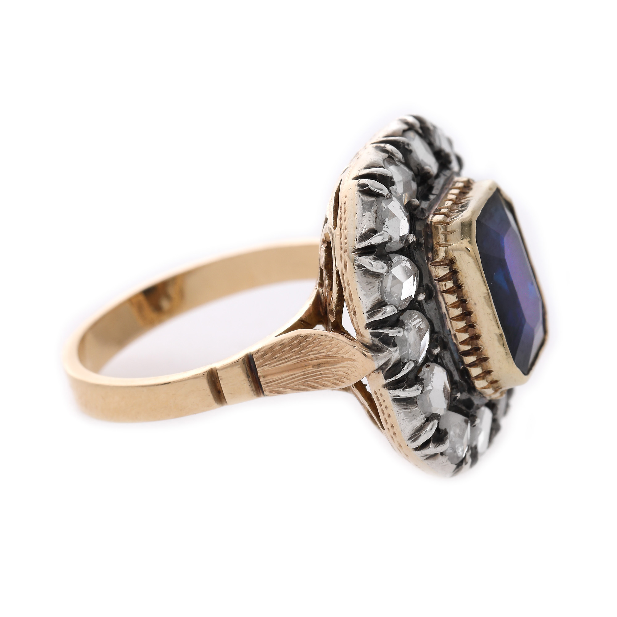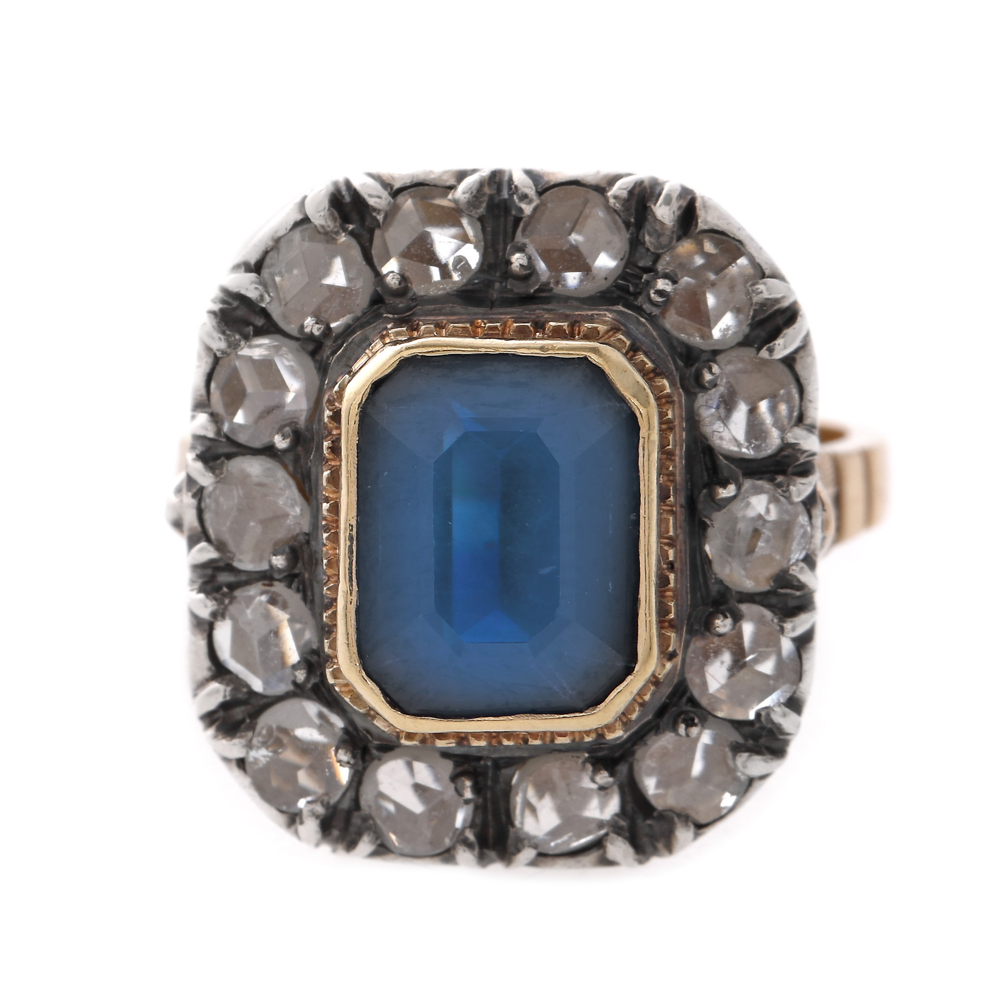 1 safir emerald cut, culoare albastru, claritate eye-clean, cca. 2,40 ct. și 14 diamante rose cut, culoare G-I, claritate VS2-I1, cca. 0,56 ct.