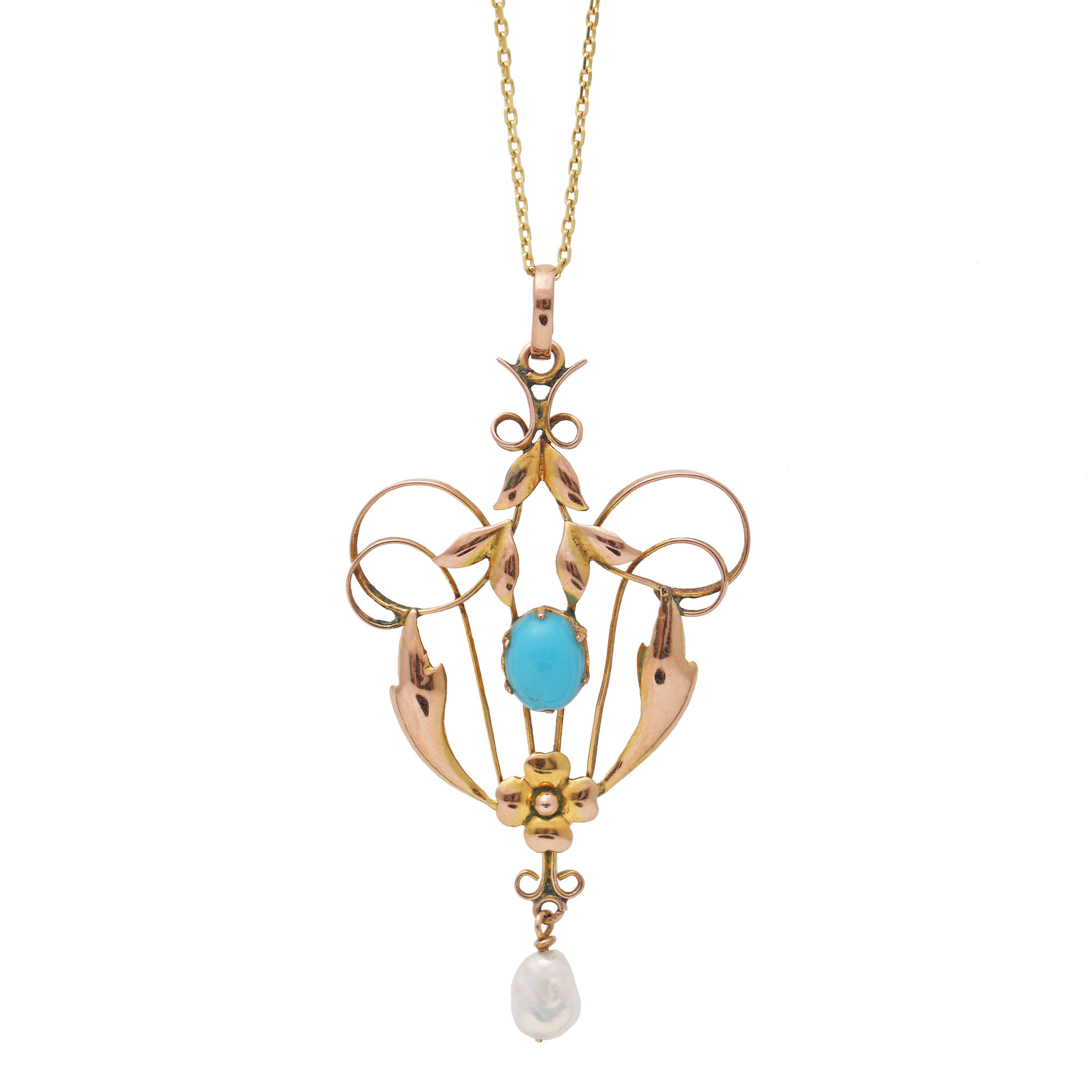 64. Lanț cu pandantiv din aur și argint, de inspirație Art Nouveau, decorat cu turcoaz și perlă