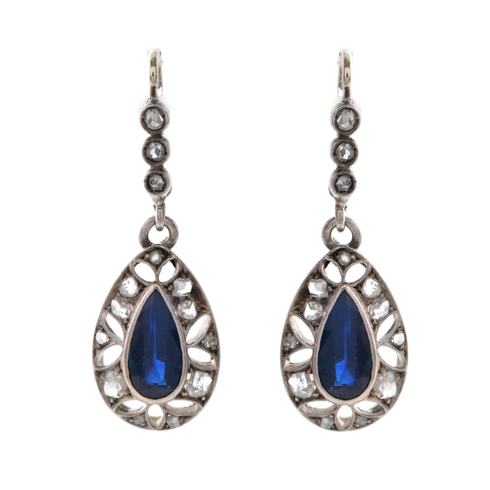 2 safiră pară, culoare albastru, claritate eye-clean-SI, cca. 2,20 ct. și 28 diamante rose cut, culoare F-G, claritate VS1-I1, cca. 0,38 ct.