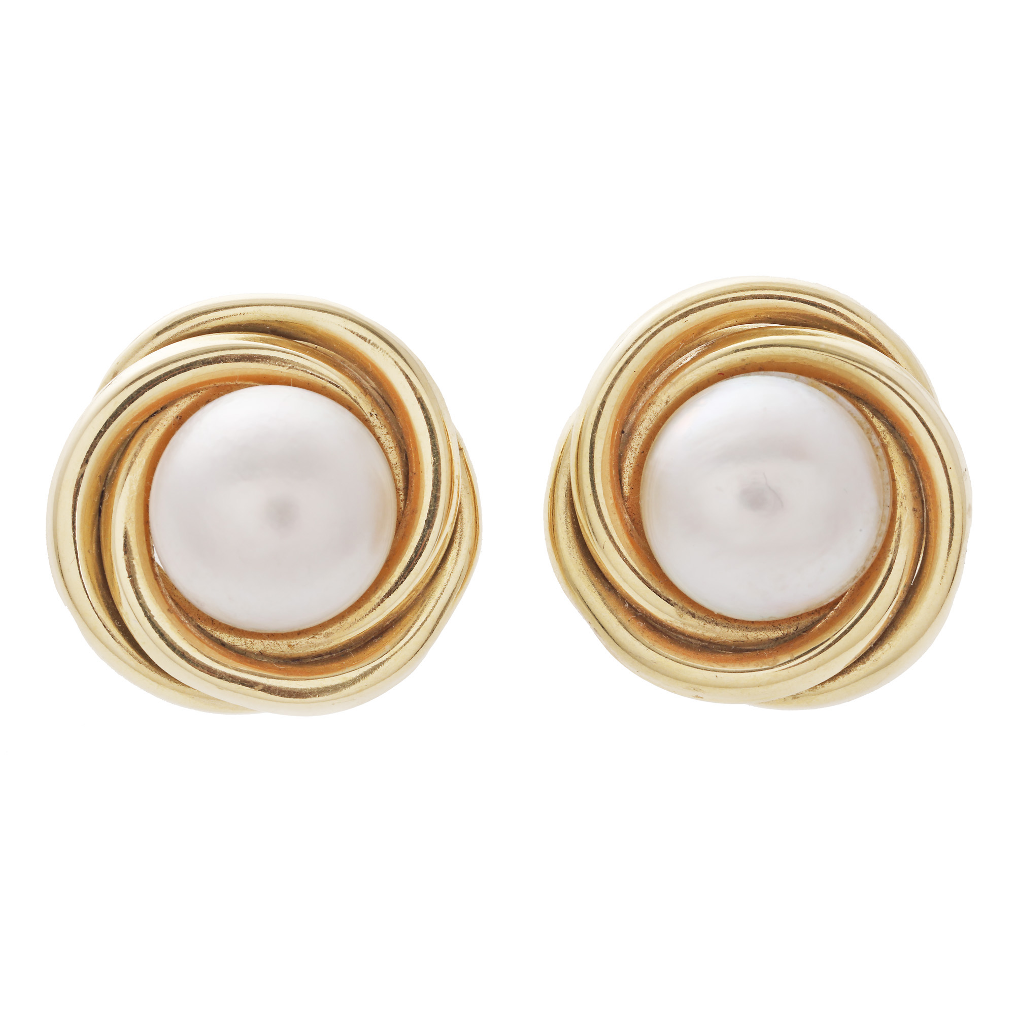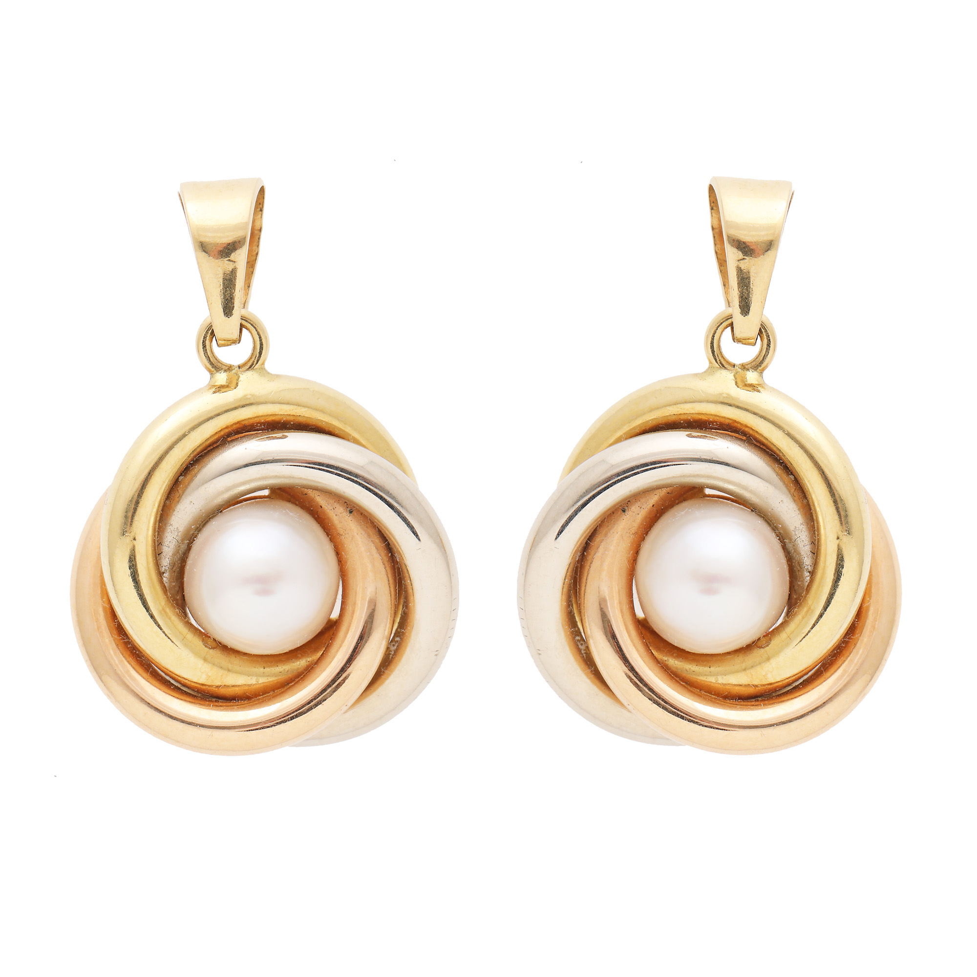 63. Set din aur în două culori, format din pereche de cercei și pandantiv, decorat cu perle