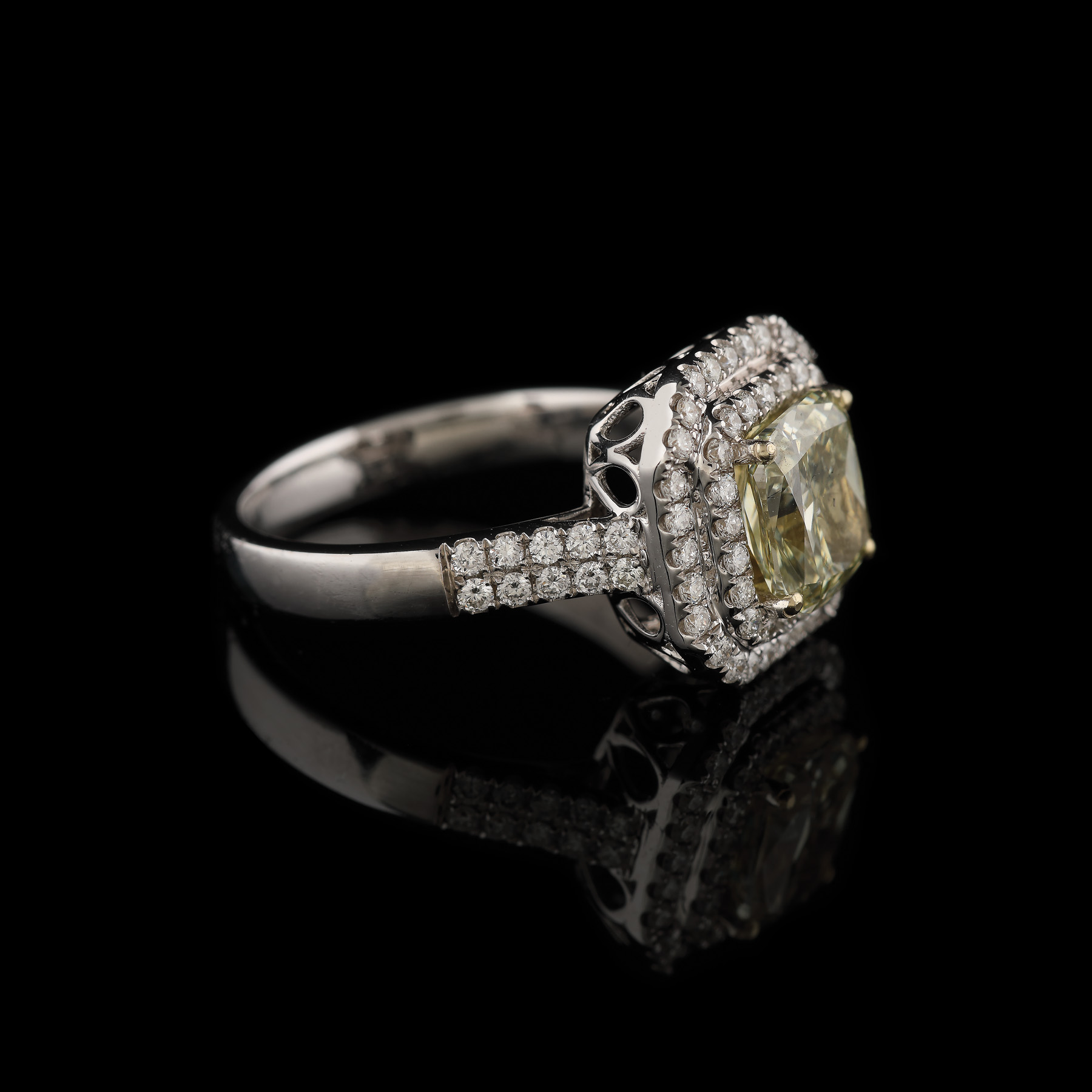 220. Important inel din aur alb, decorat cu un diamant cushion cut greenish-yellow, anturat de două rânduri de briliante, însoțit de certificat GIA