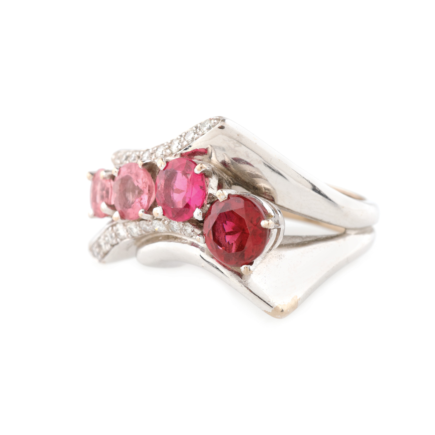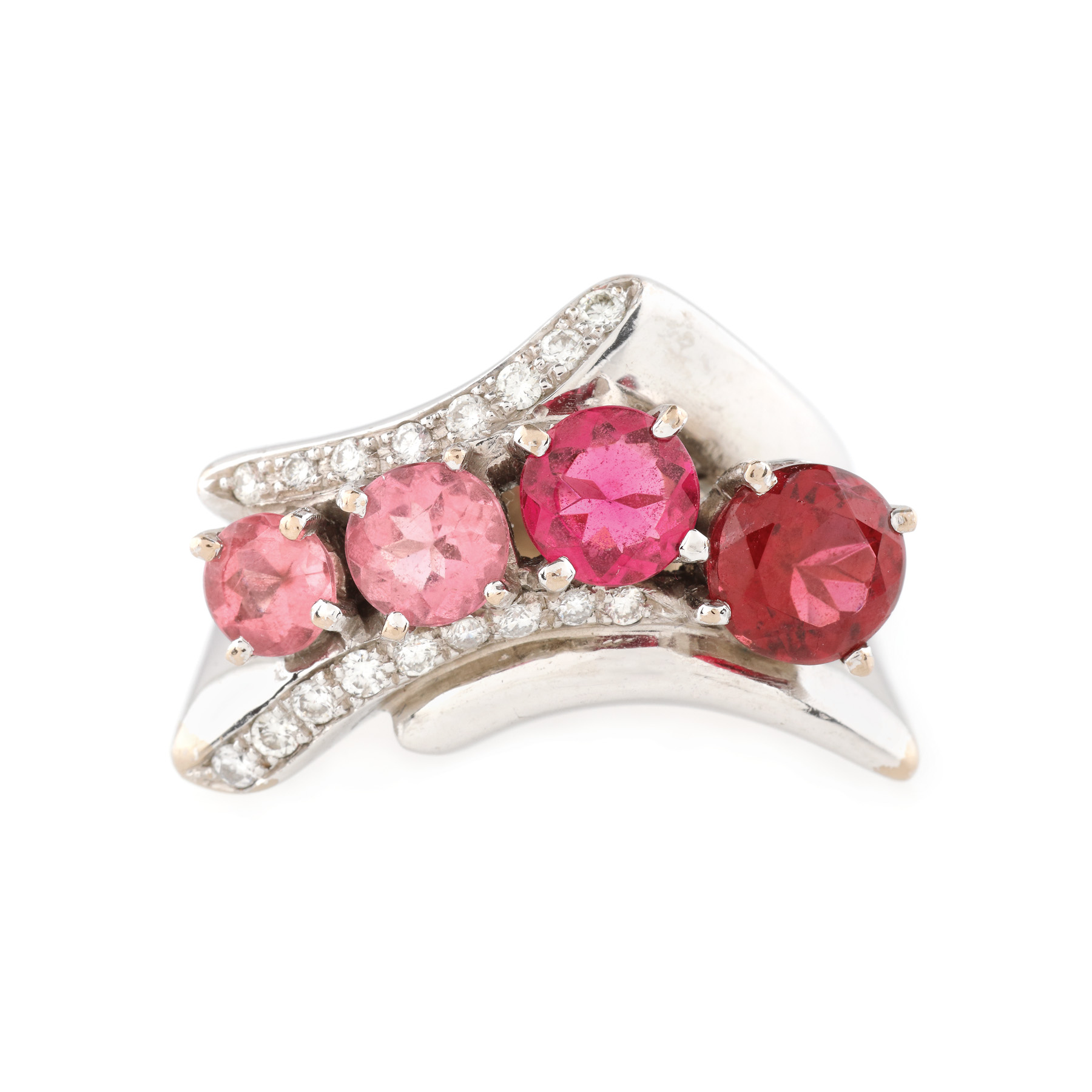 4 turmaline rotund fațetate, culoare roz și roșu, claritate eye-clean, cca. 2,0 ct. și 17 diamante rotunde briliant, culoare G-H, claritate VS2-SI, cca. 0,17 ct.