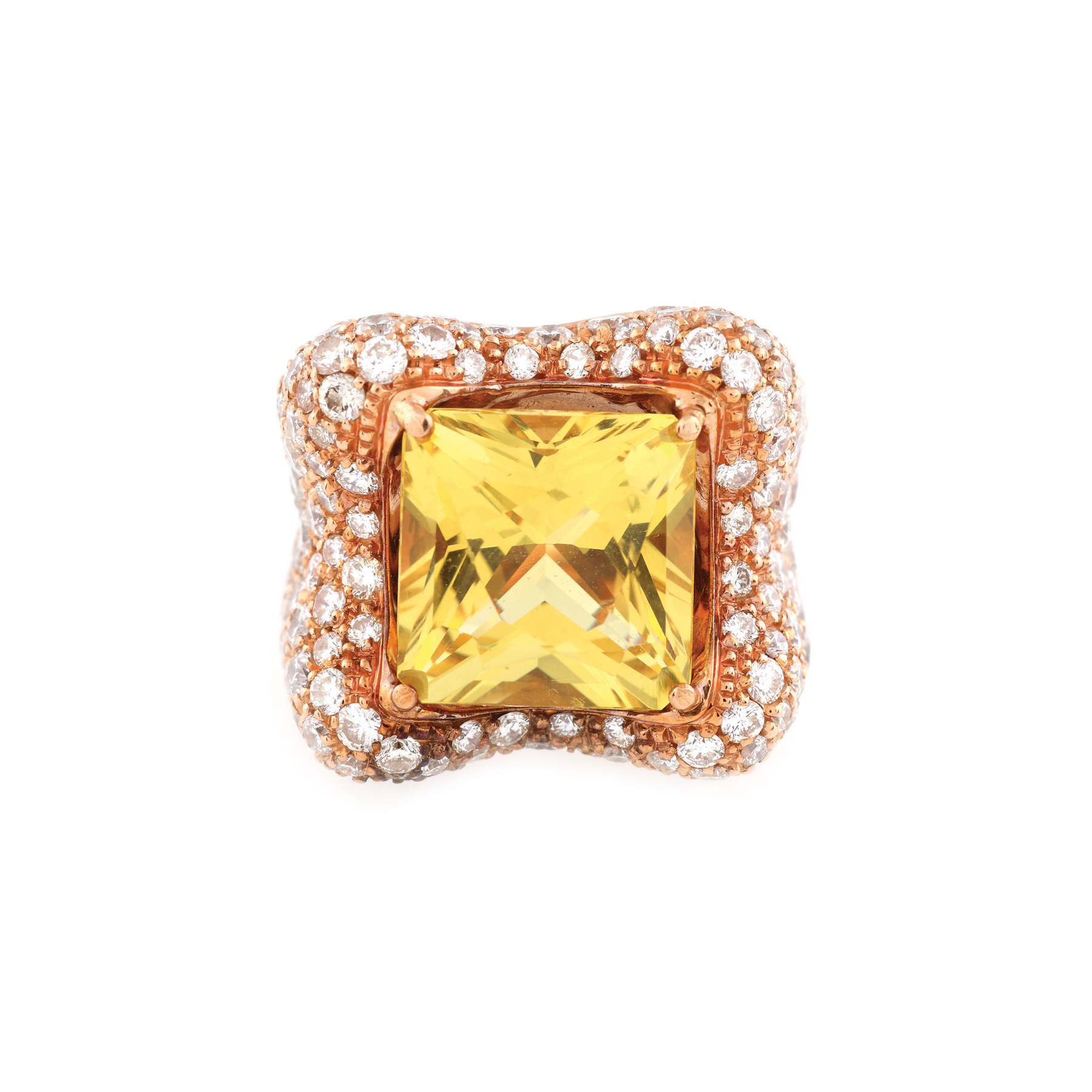 1 citrin pătrat fațetat, culoare galben, claritate eye-clean, cca. 11,5 ct. și 162 diamante rotunde briliant, culoare H-I, claritate VS, cca. 4,1 ct.