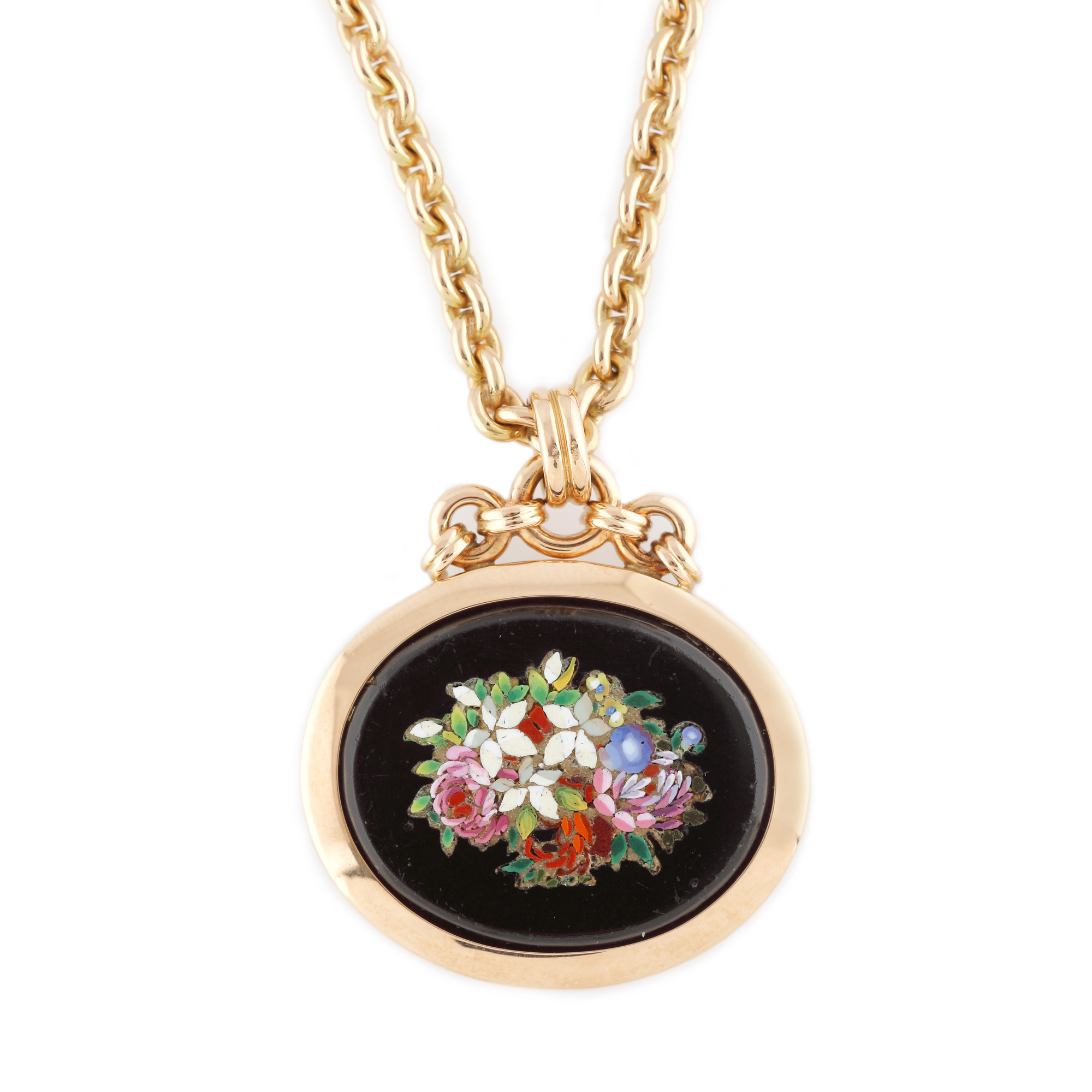 205. Colier cu pandantiv din aur, decorat cu medalion din micromozaic în forma unui buchet floral