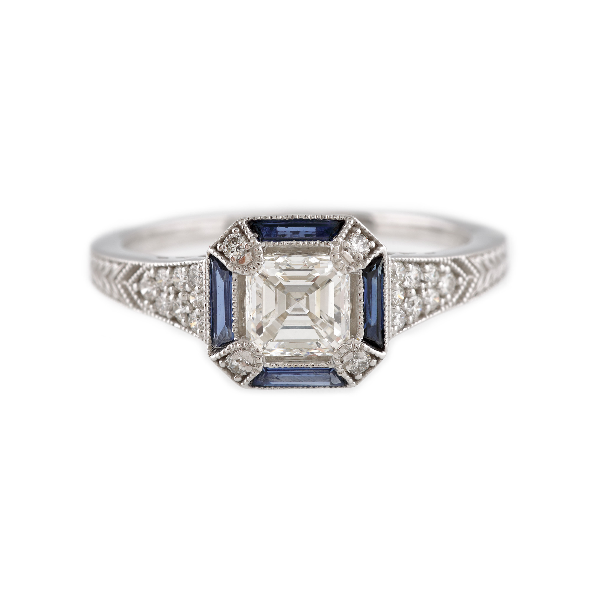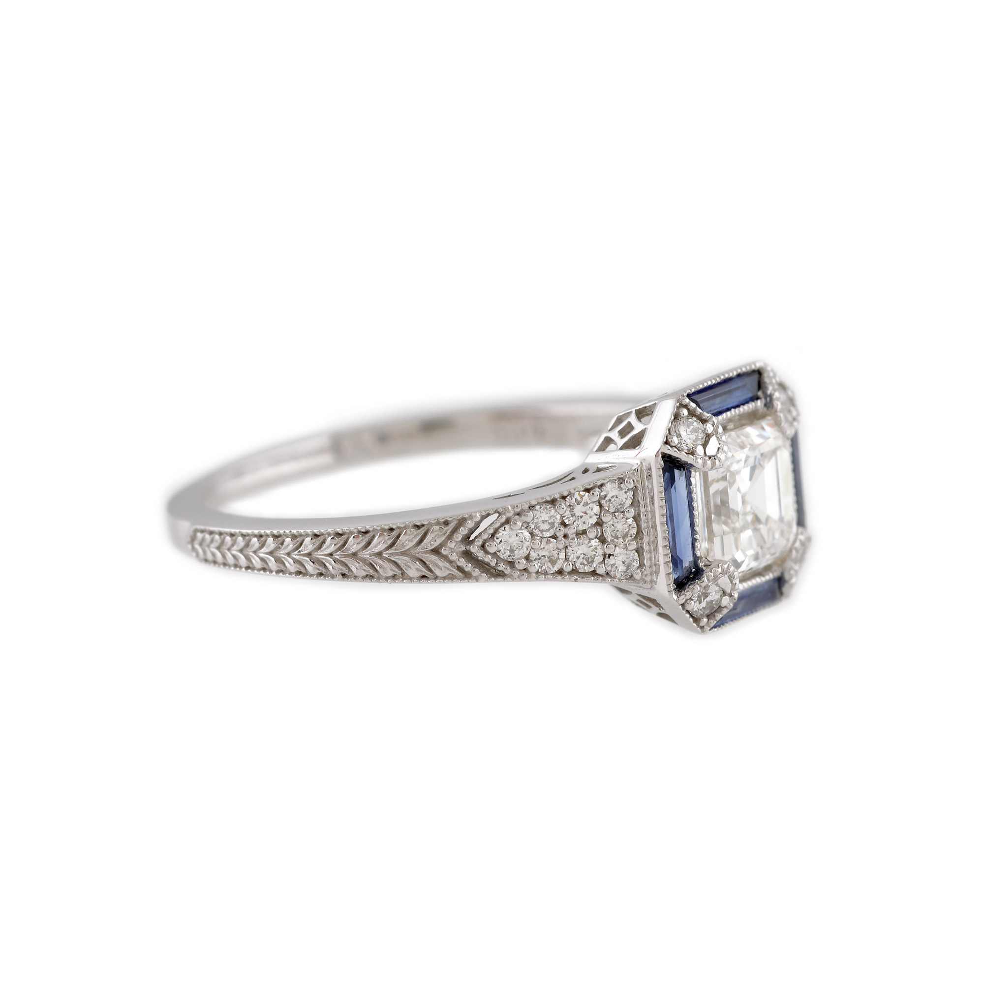 1 diamant pătrat step cut, culoare G, claritate VS2, cca. 0,70 ct.; 20 diamante rotunde briliant, culoare G-H, claritate VS, cca. 0,18 ct. și 4 safire trapez fațetate, culoare albastru, claritate eye-clean, cca. 0,12 ct.