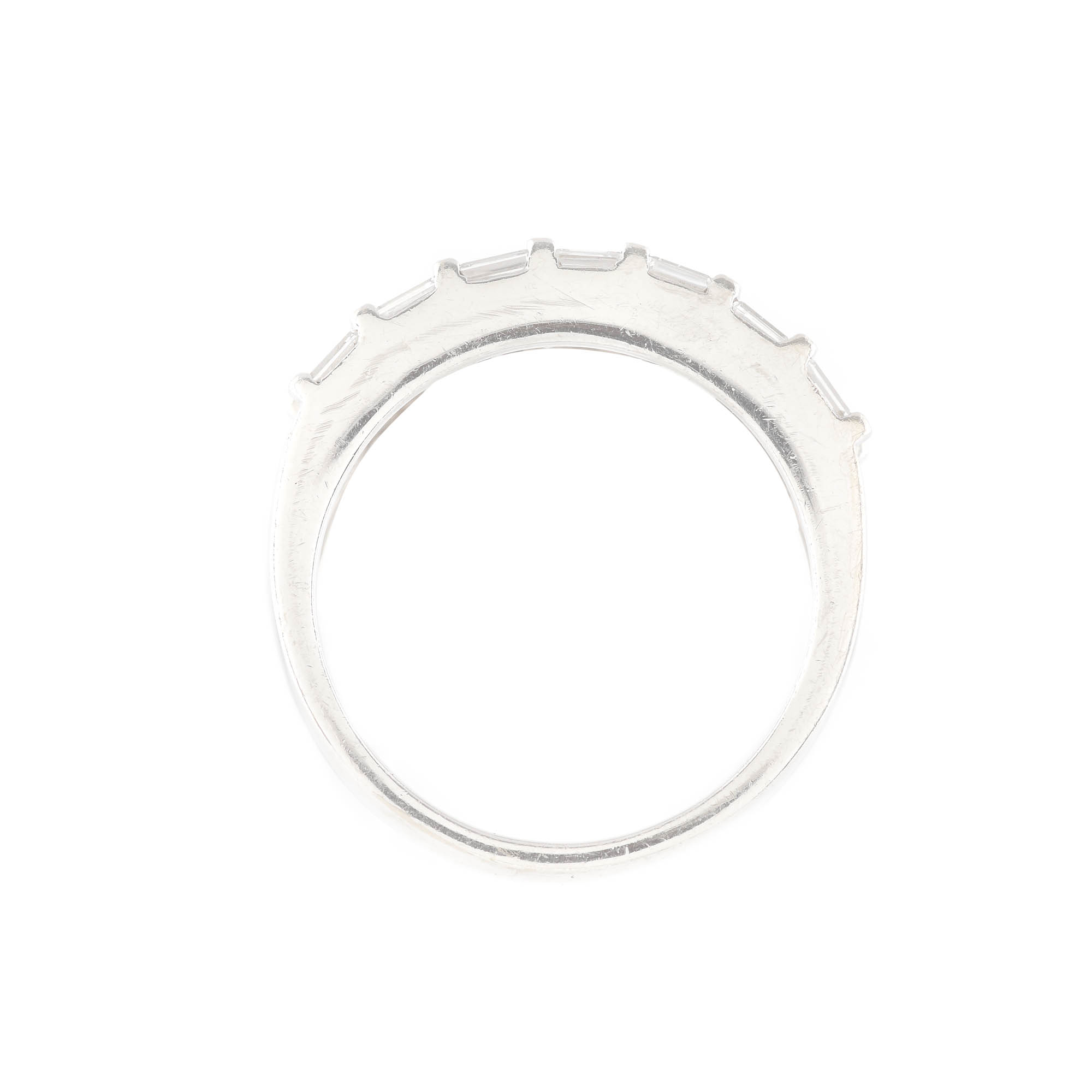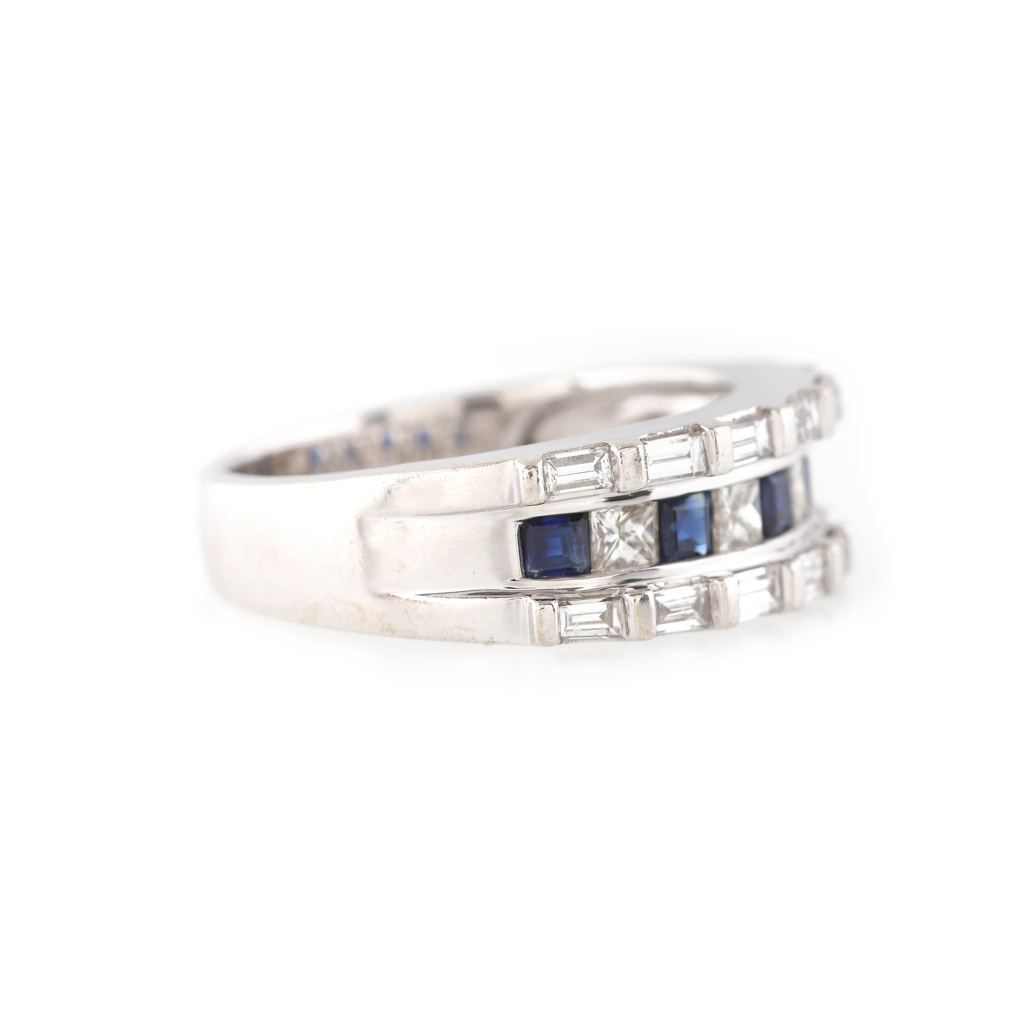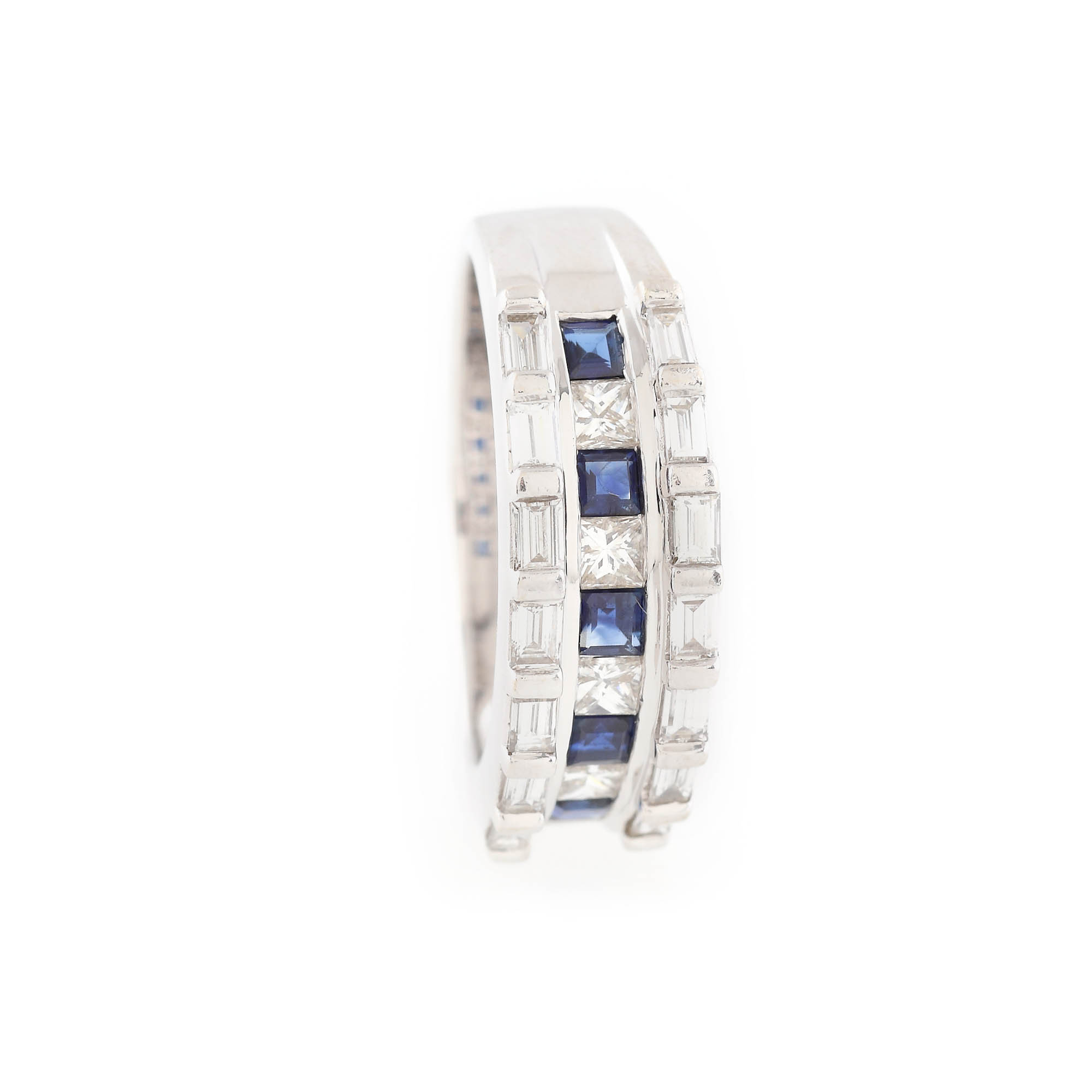 14 diamante baghete, culoare F-G, claritate VVS-VSI, cca. 0,84 ct.; 4 diamante princess cut, culoare F-G, claritate VVS-VSI, cca. 0,52 ct. și 5 safire pătrate step cut, culoare albastru, claritate eye-clean, cca. 0,75 ct.