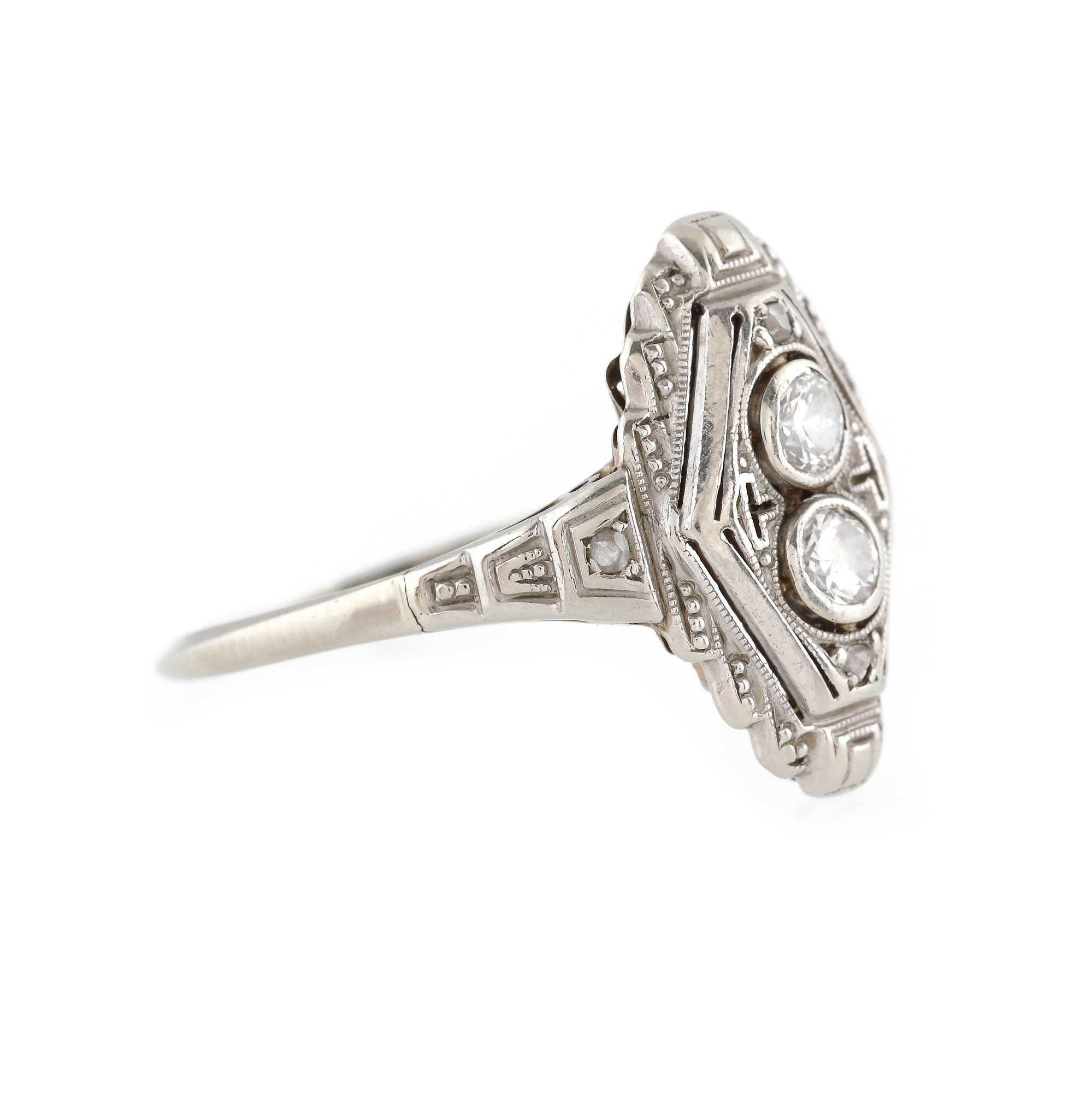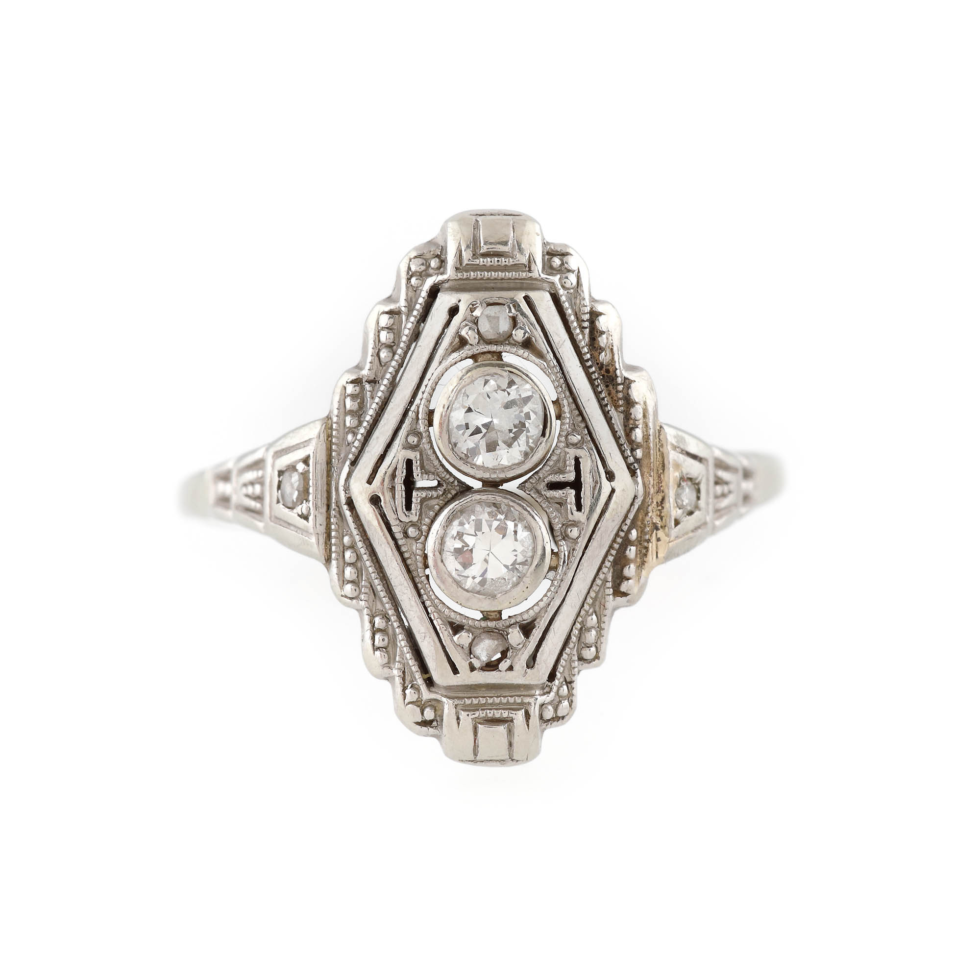 2 diamante european cut, culoare I-J, claritate VS, cca. 0,18 ct. și 4 diamante (3 rose cut, 1 rotund briliant), culoare I-J, claritate VS-SI, cca. 0,02 ct.