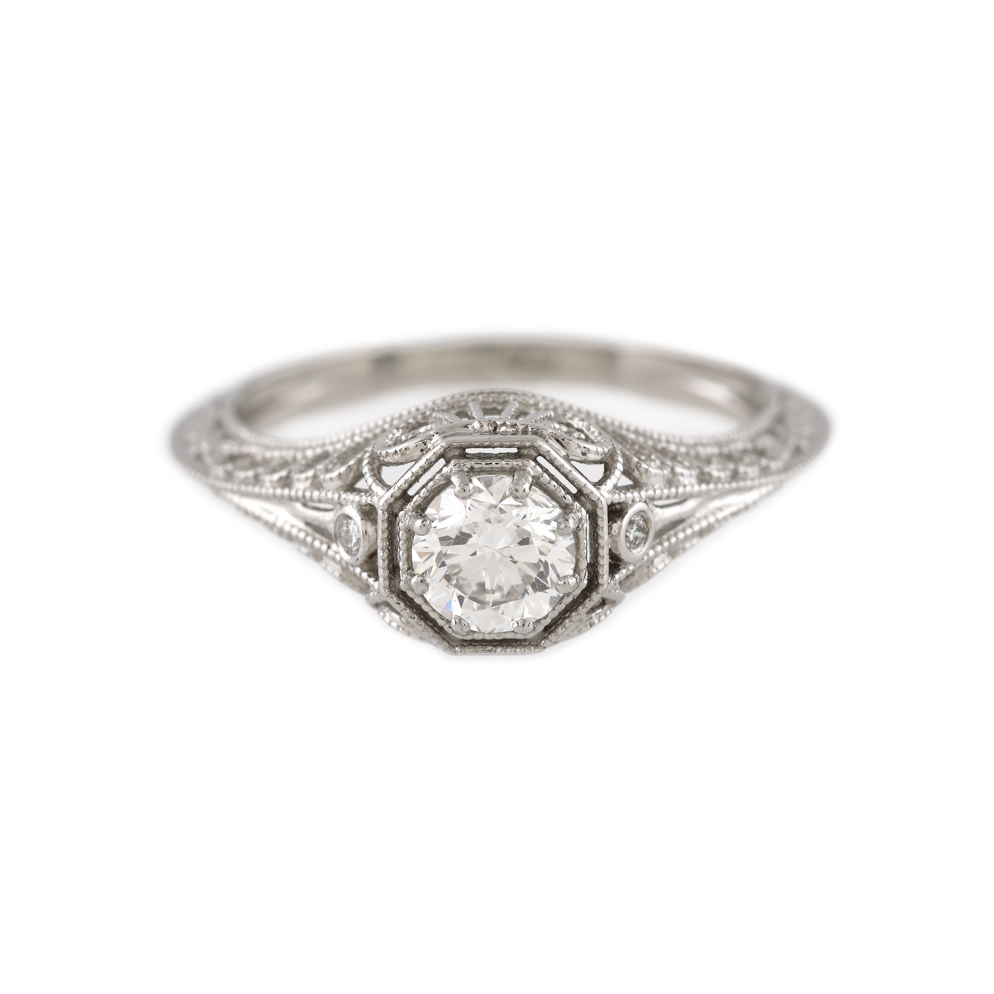 1 diamant rotund briliant, culoare F, claritate VVS1, cca. 0,4 ct. și 2 diamante culoare G-H, claritate VS, cca. 0,016 ct.