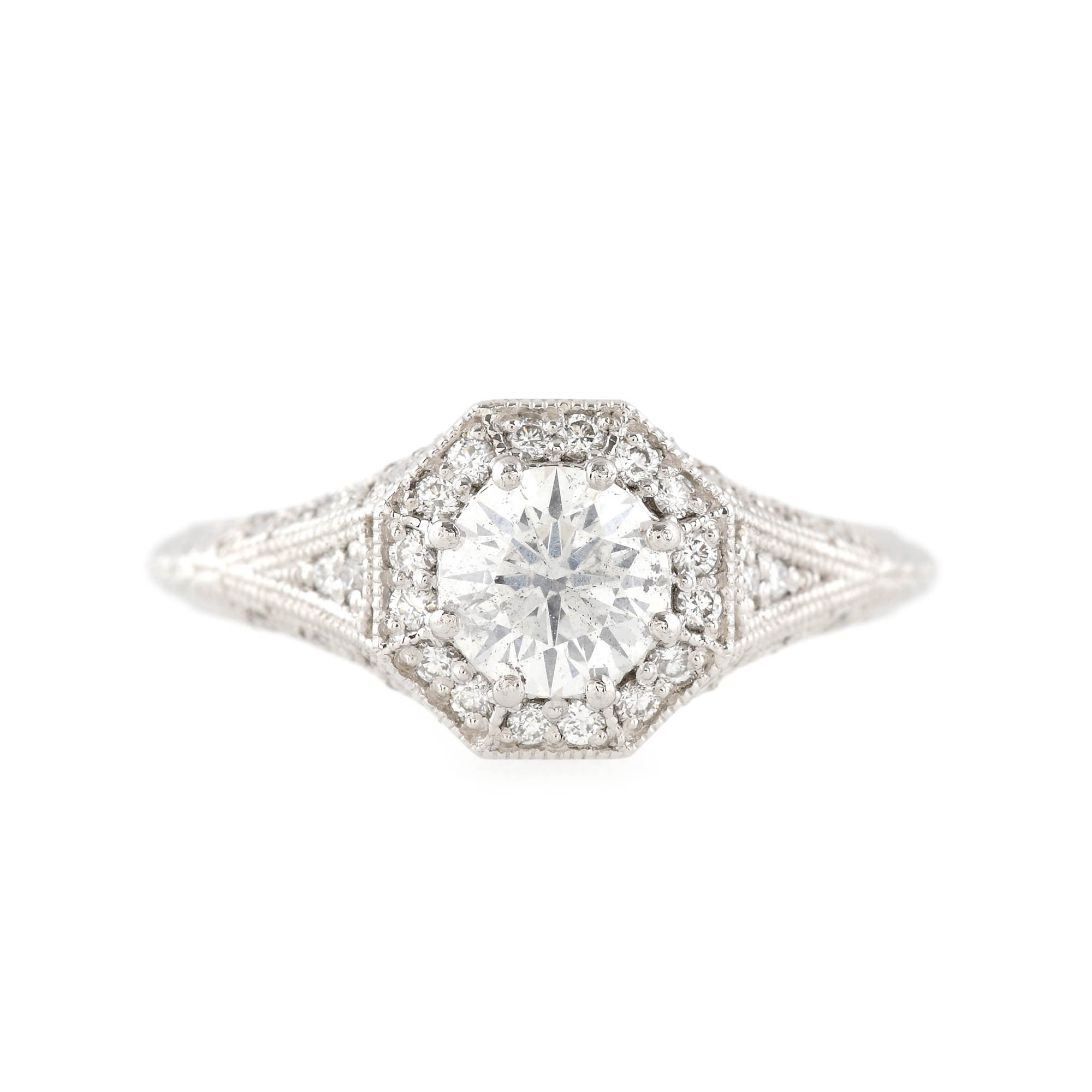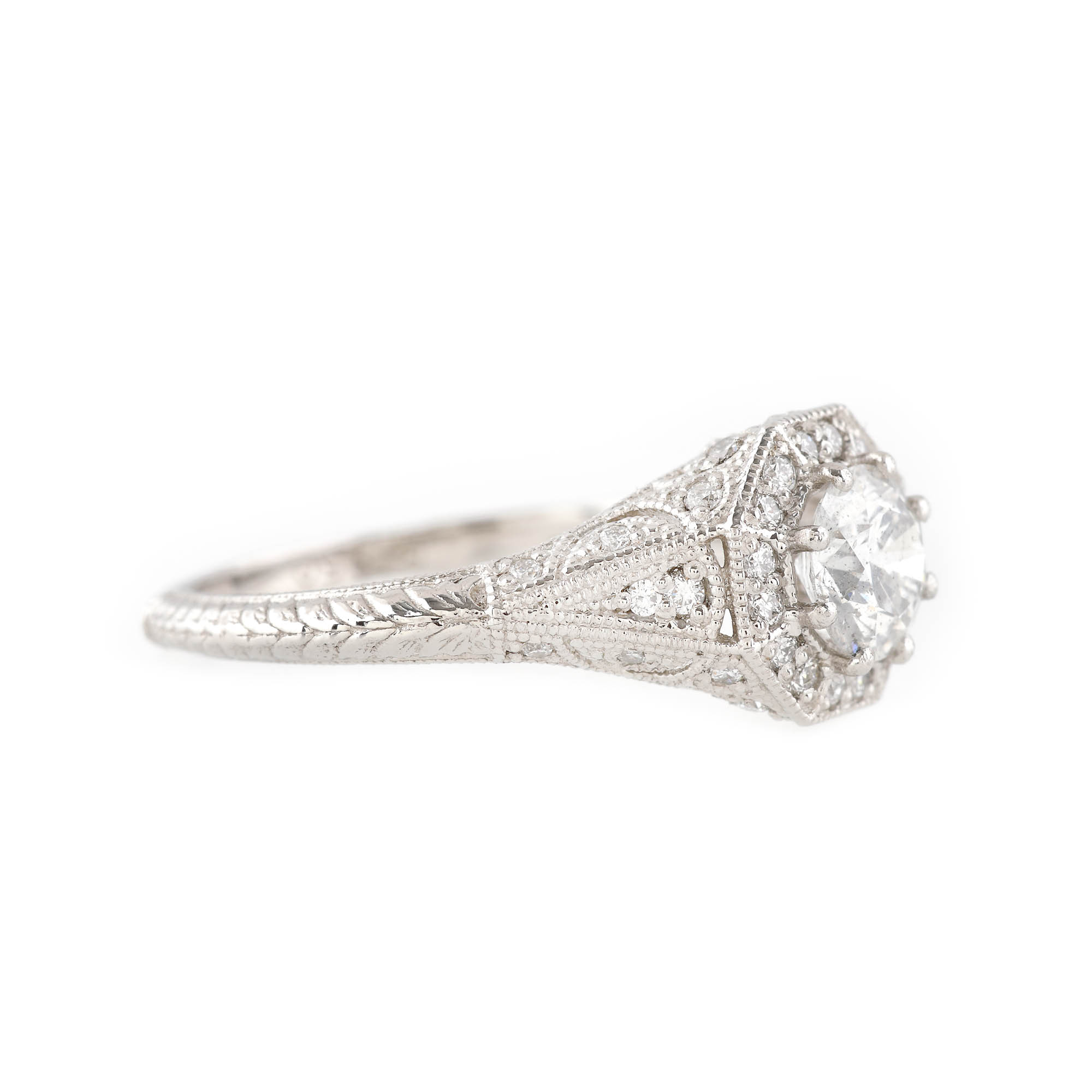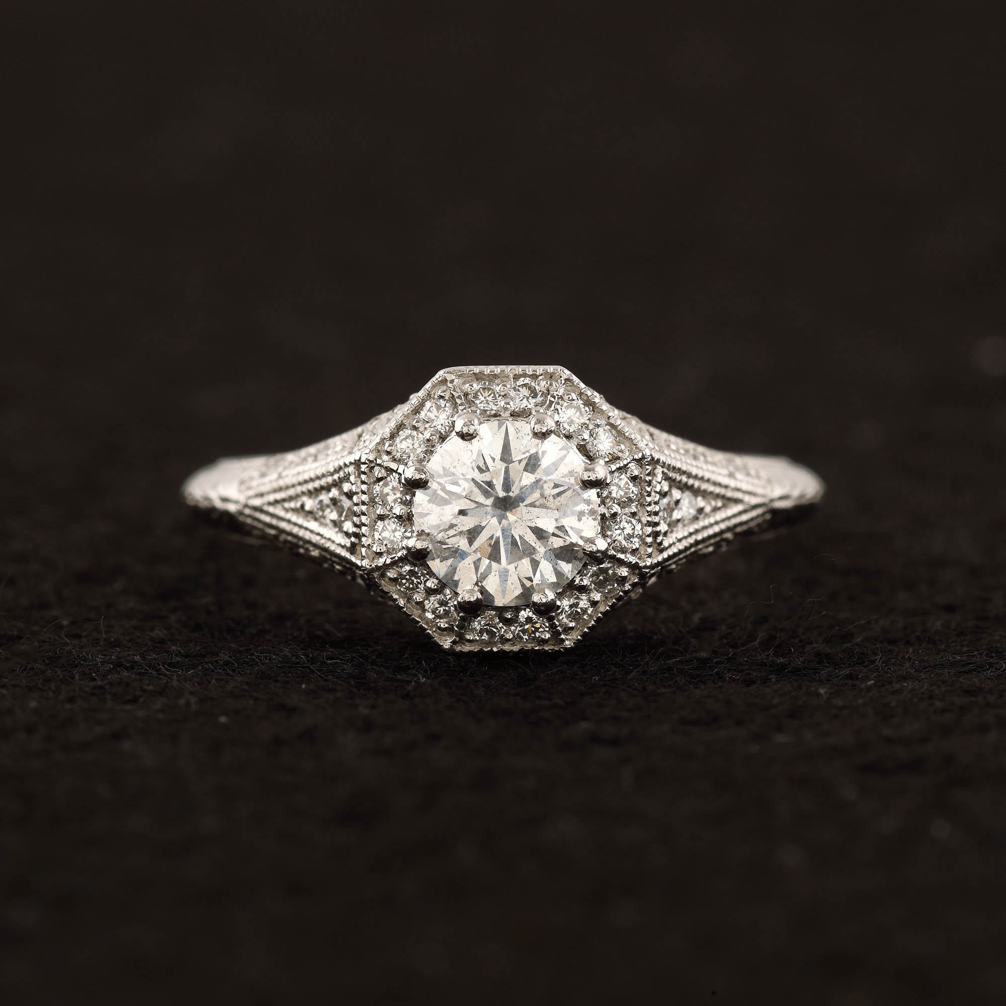 1 diamant rotund briliant, culoare F-G, claritate I2, cca. 0,57 ct. și 40 diamante rotunde briliant, culoare G-H, claritate VS, cca. 0,24 ct.