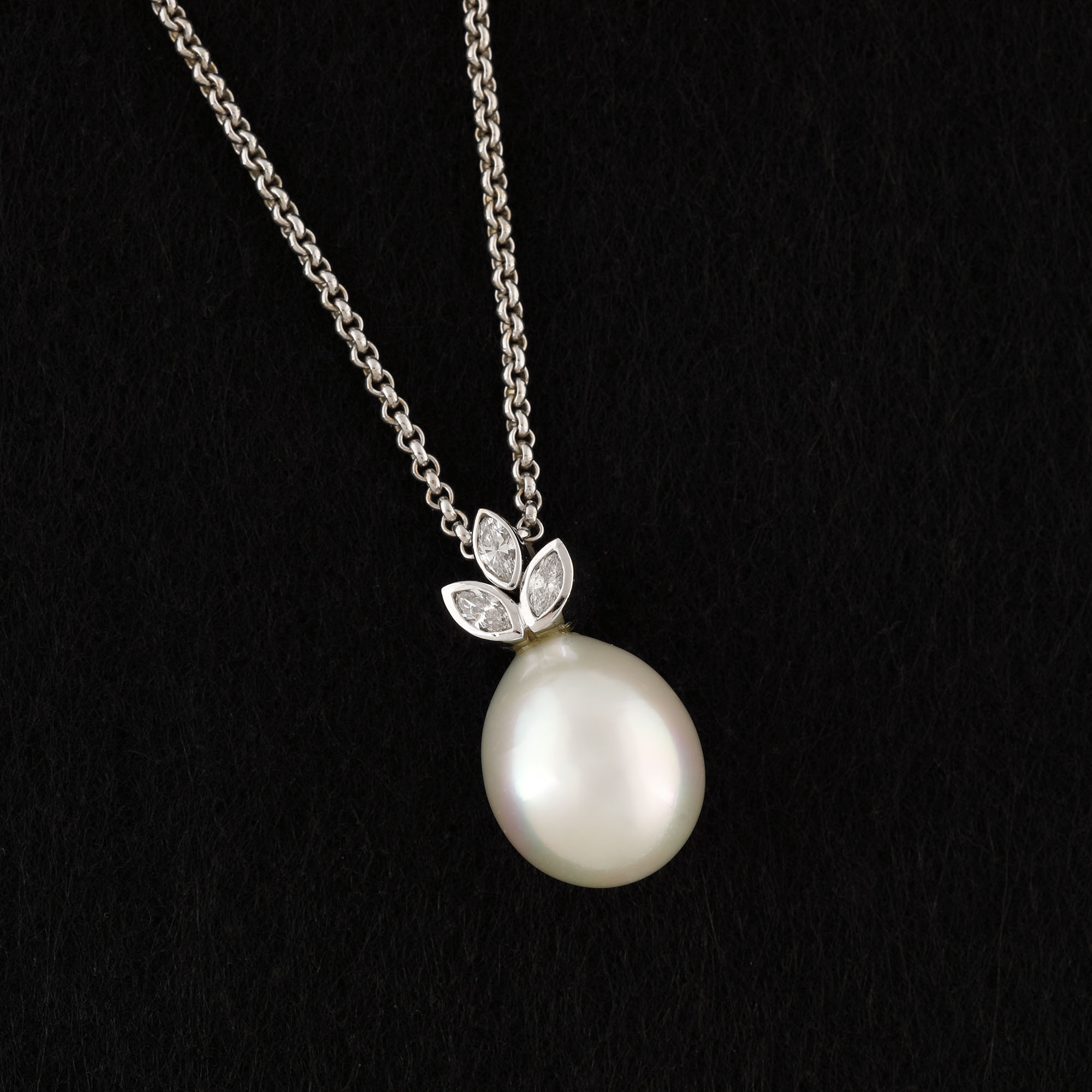 1 perlă pară de apă sărată de cultură, culoare alb, d=13,83-16,36 mm și 3 diamante marchiz fațetate, culoare H-I, claritate VS2-SI, cca. 0,4 ct.