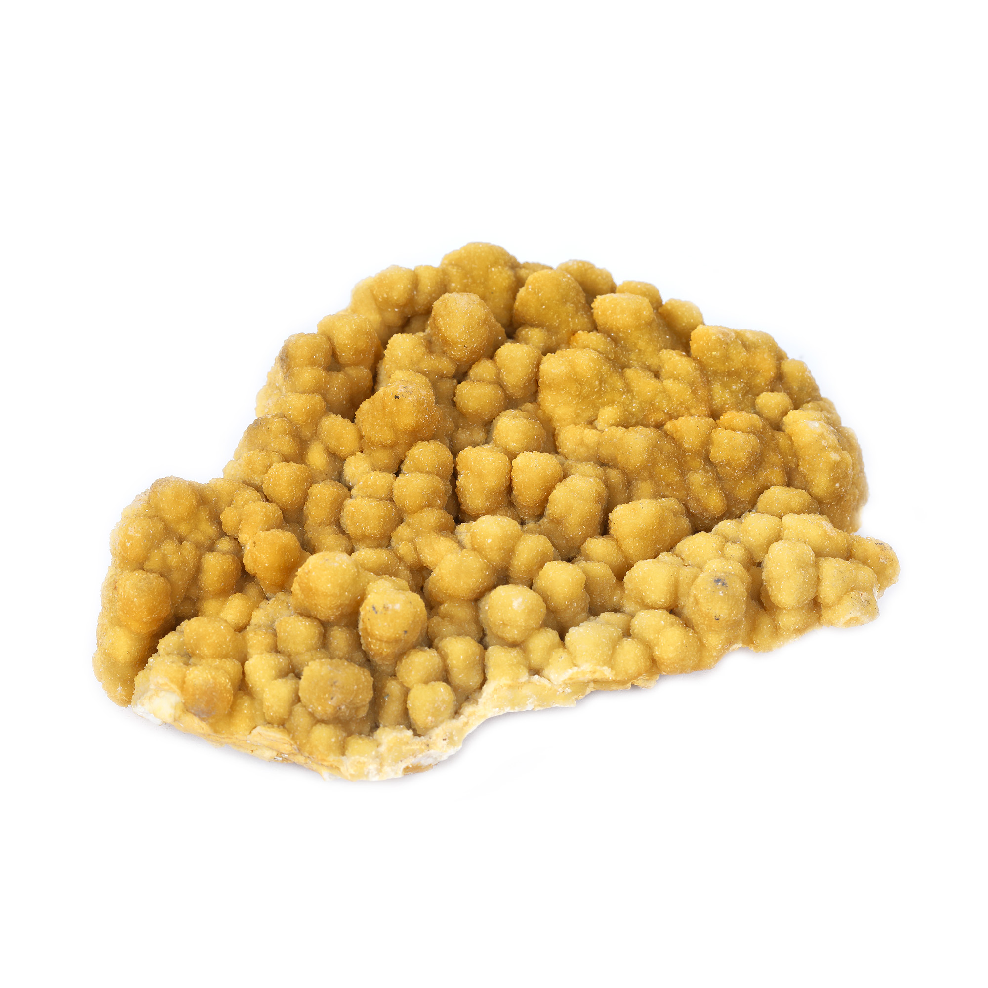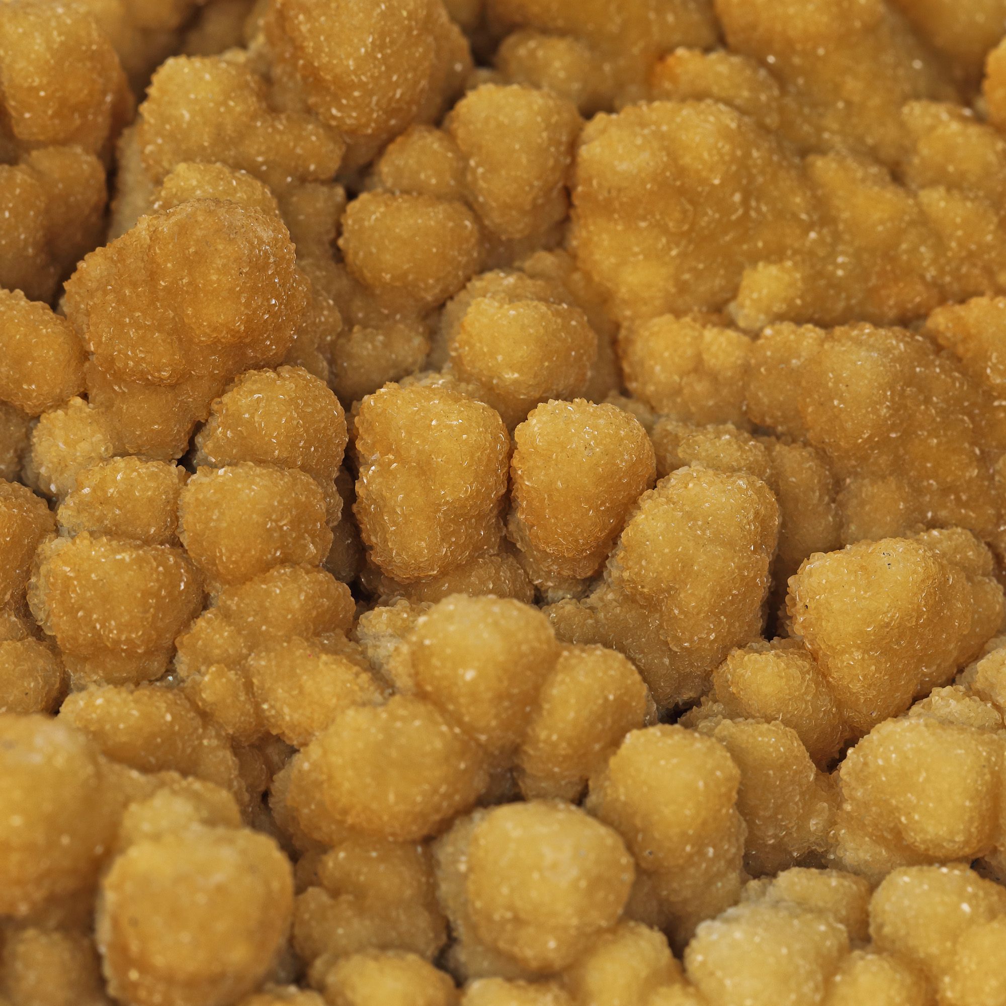 216. Romboedrii de calcit galbui-muștar, pe calcit mamelonar, sector Bolduț, mina Cavnic