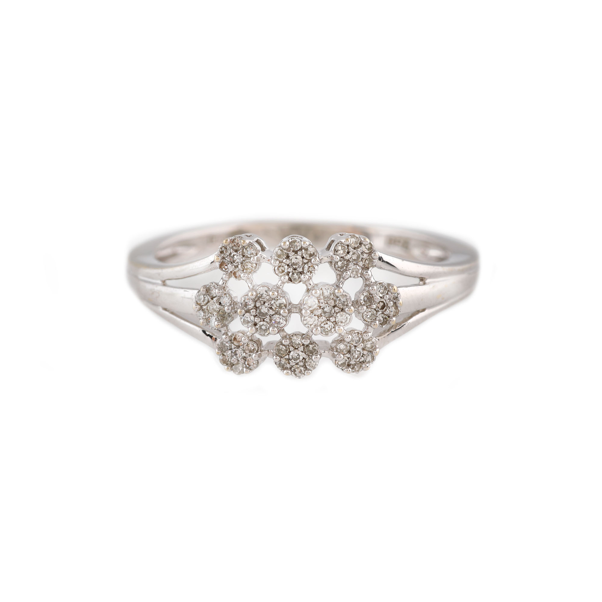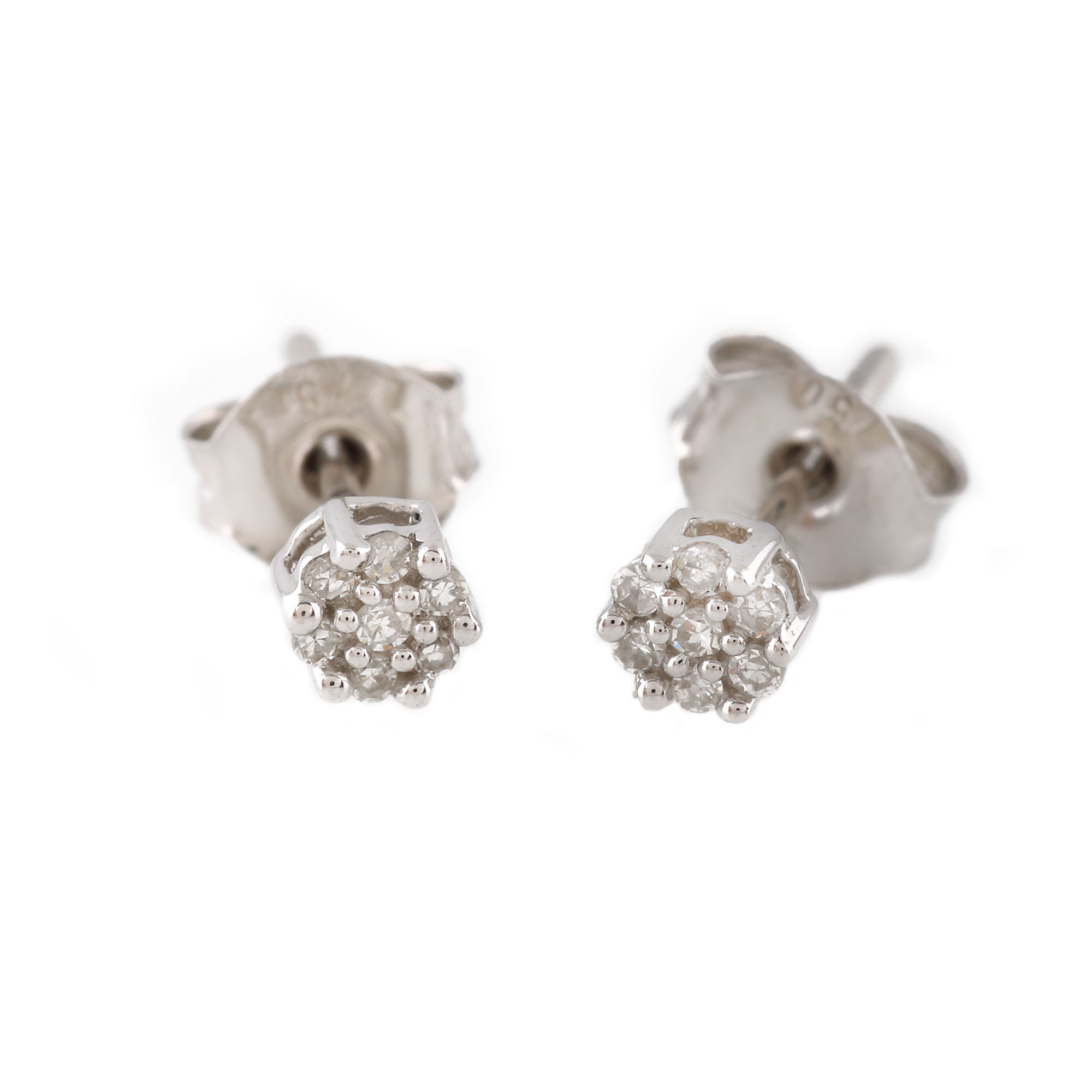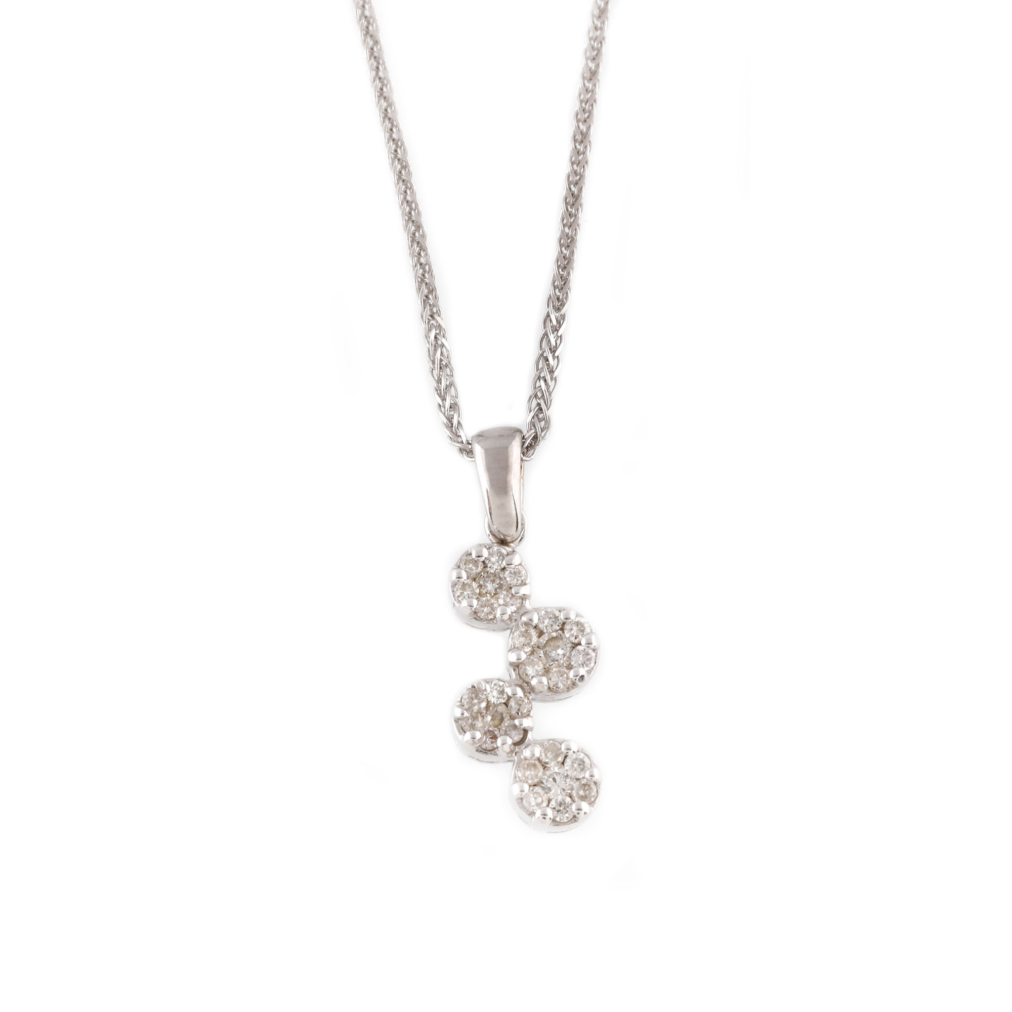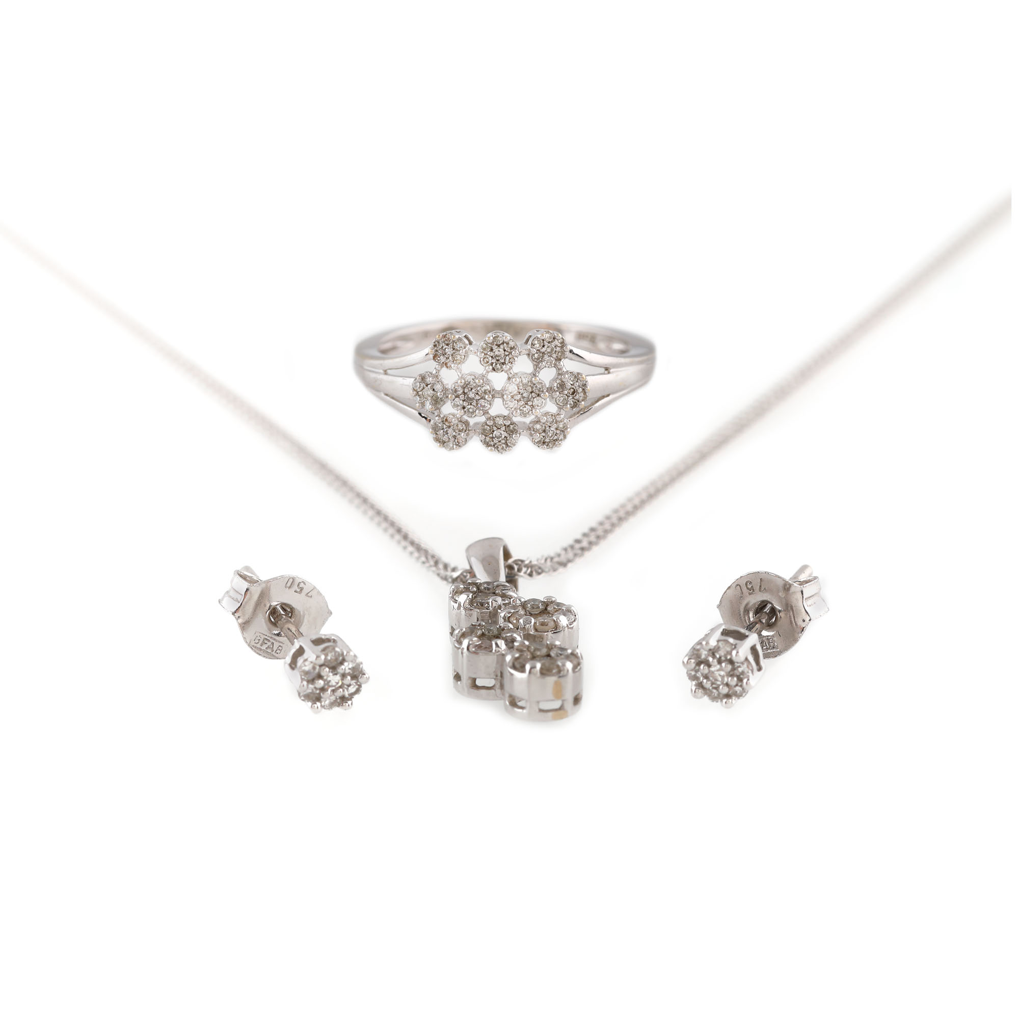 259. Set din aur alb compus din inel, pereche de cercei și lanț cu pandantiv, decorat cu cluster de diamante