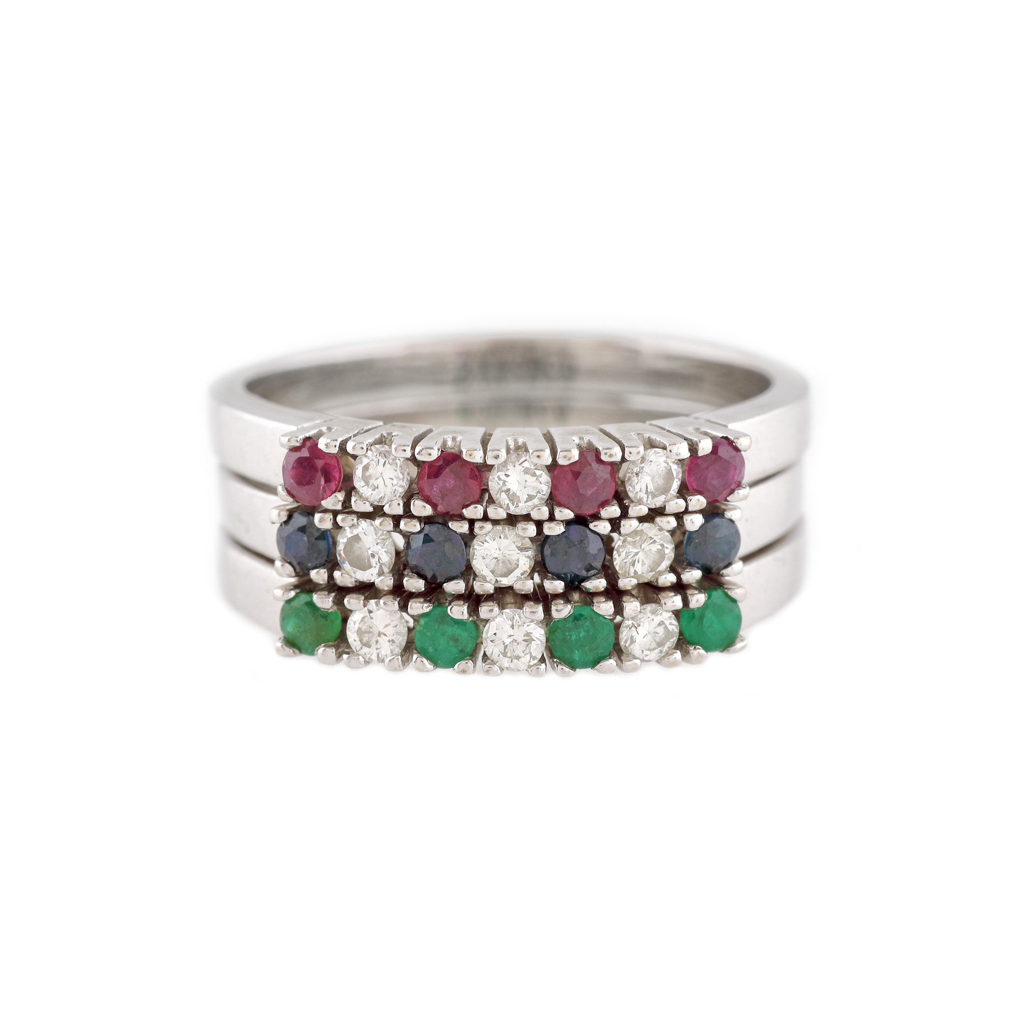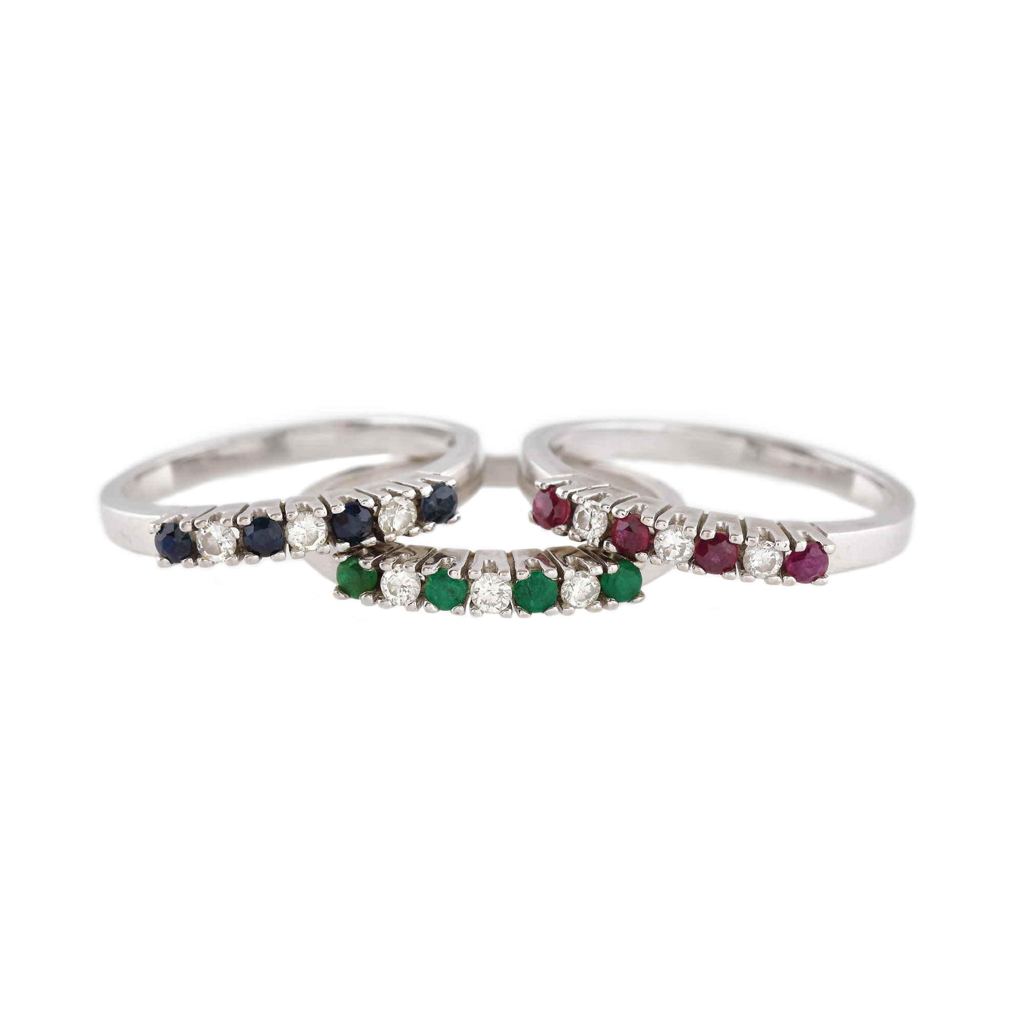 284. Set format din trei inele din aur alb, decorat cu diamante, rubine, smaralde și safire