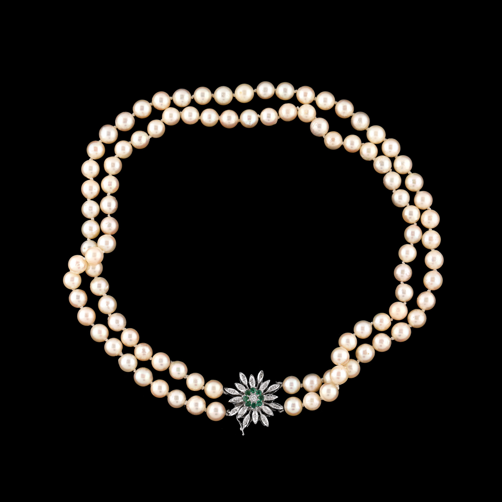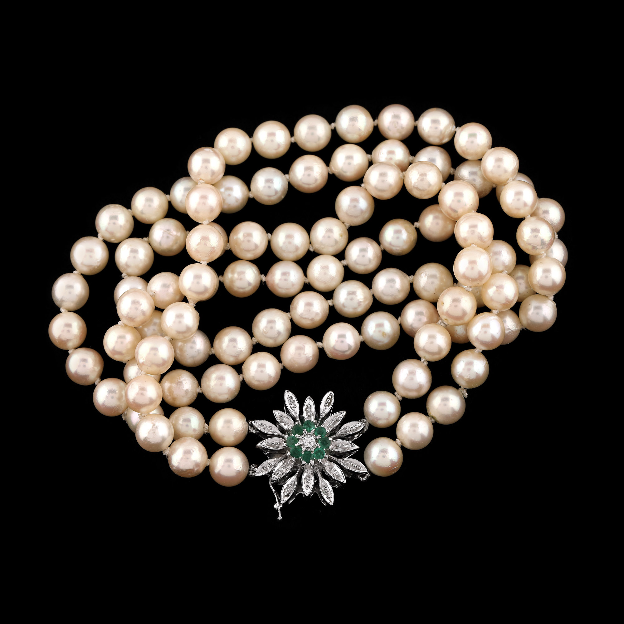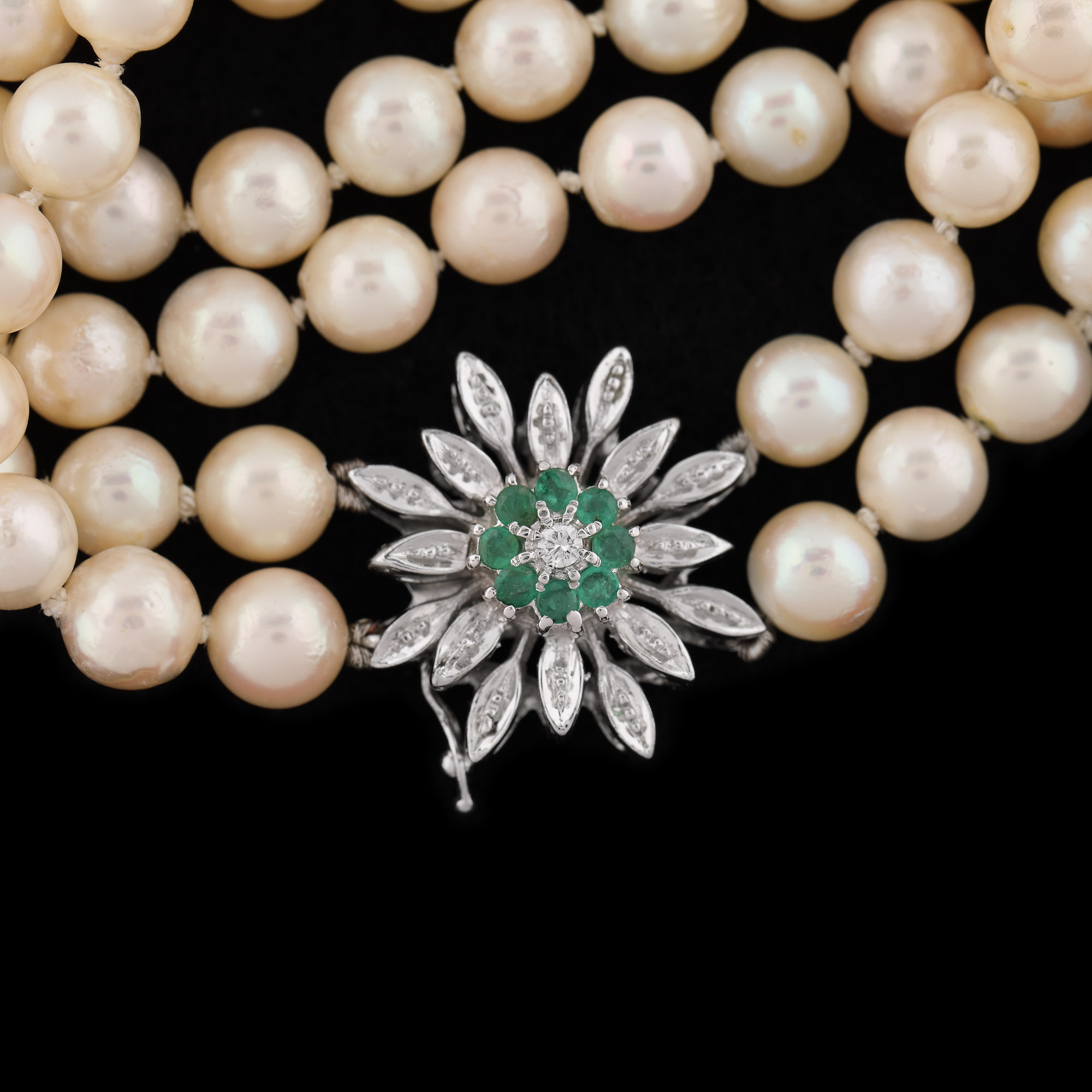 89. Colier din perle, cu închizătoare din aur alb, decorată cu un diamant și smaralde