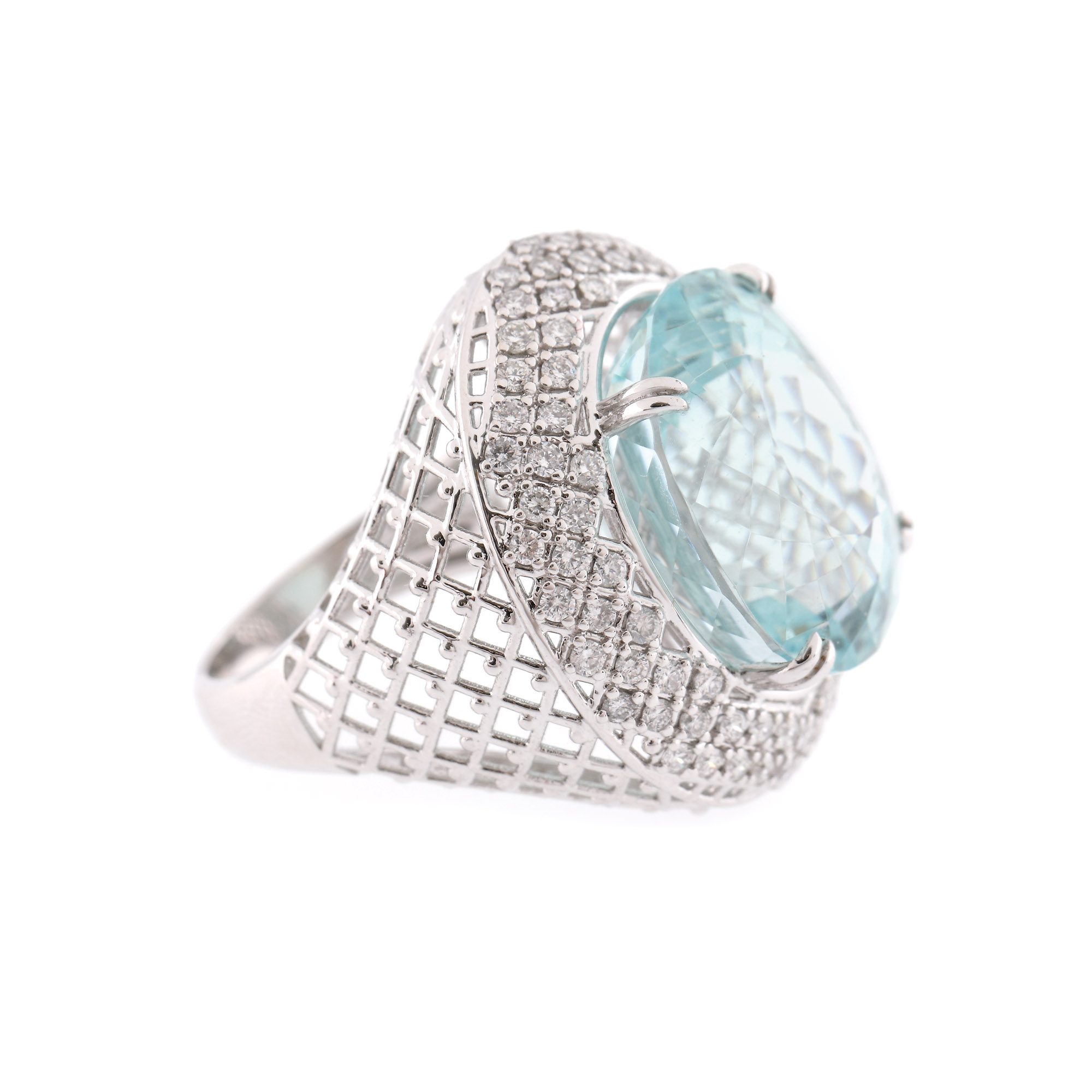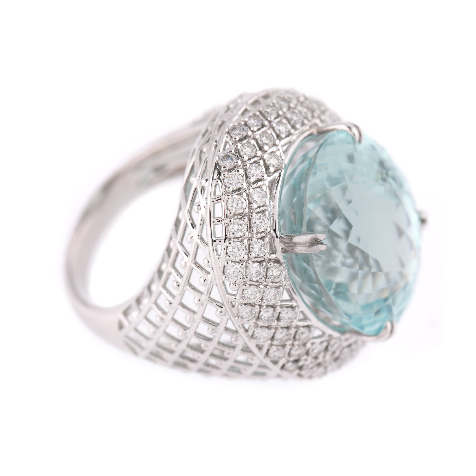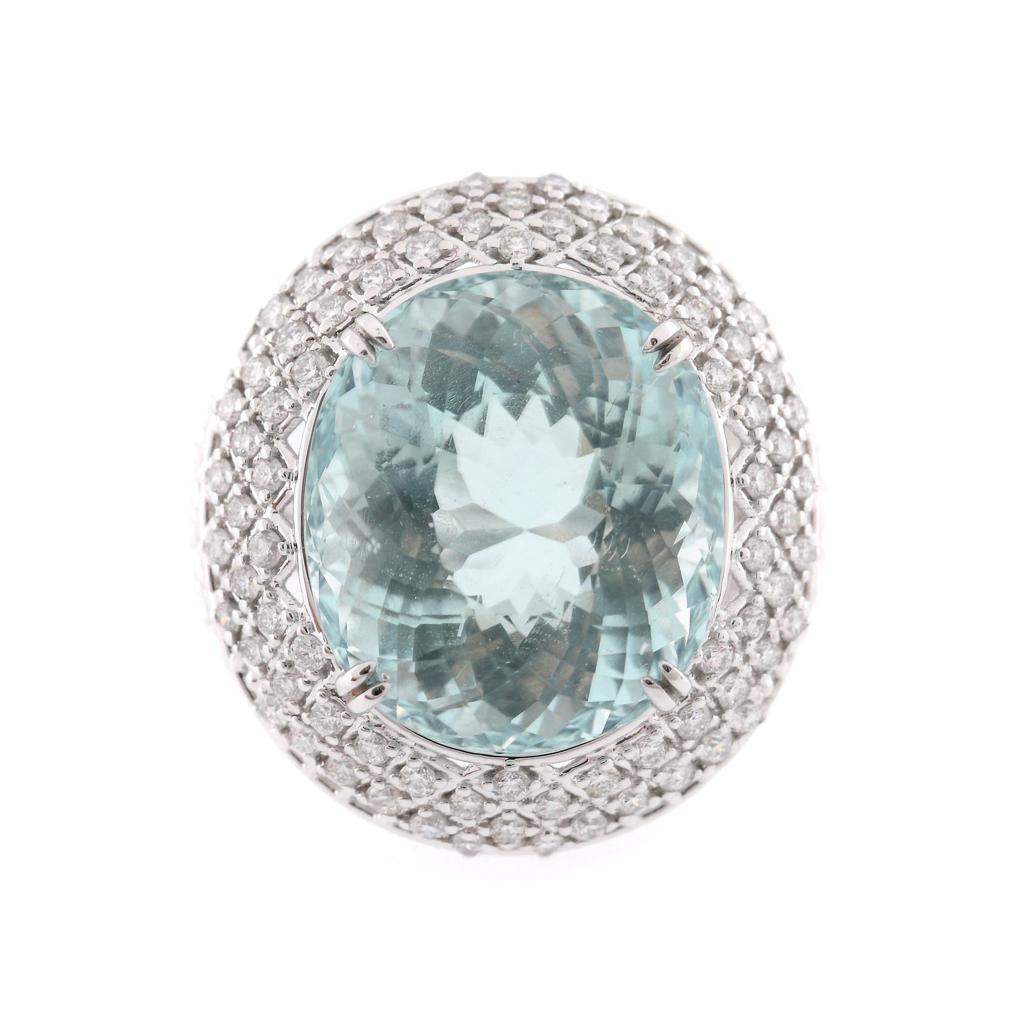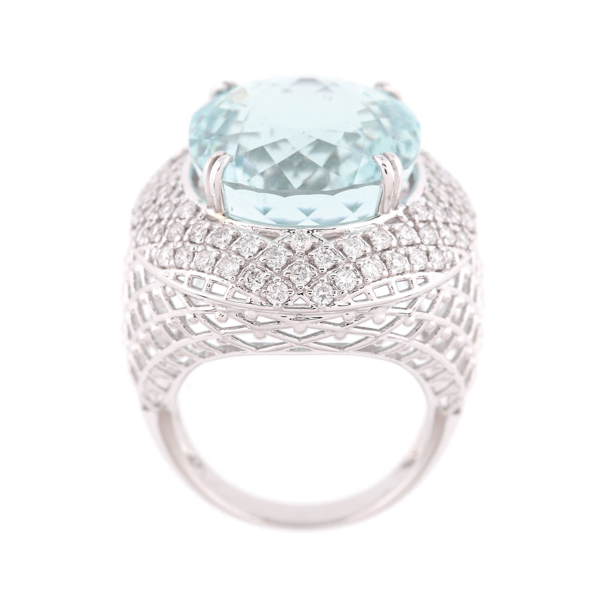 1 acvamarin oval fațetat, culoare bleu, claritate eye-clean, cca. 18,83 ct. și 80 diamante rotunde briliant, culoare G-I, claritate VS-I1, cca. 1,2 ct.