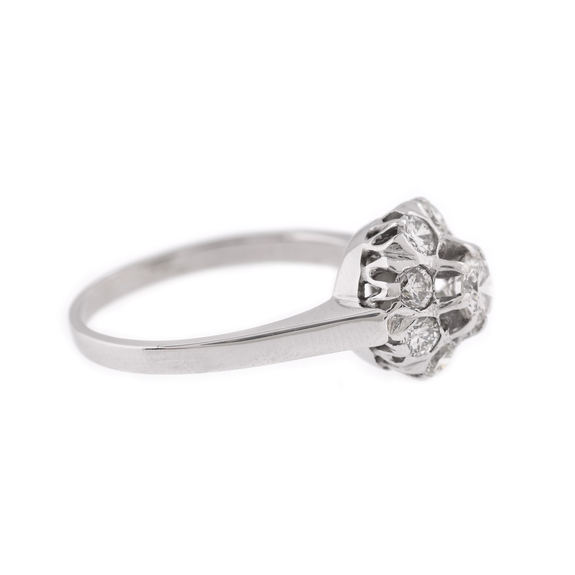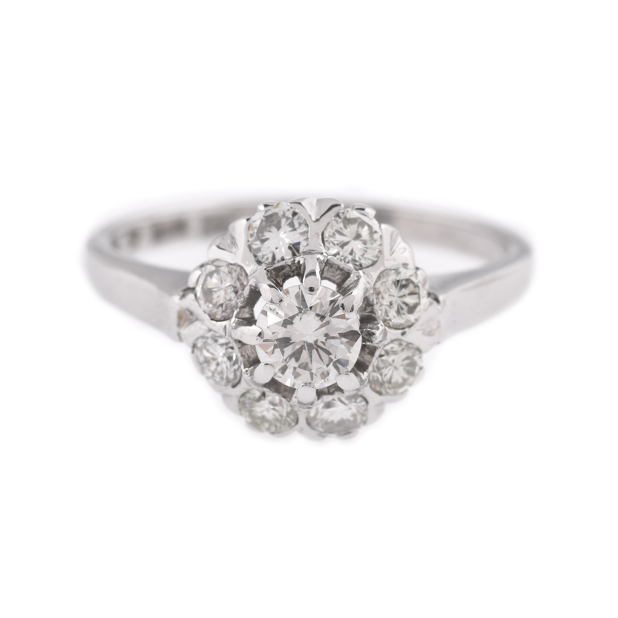 9 diamante rotunde briliant, culoare H-J, claritate VVS2-VS1, cca. 0,88 ct. Diamantul central cca. 0,32 ct.