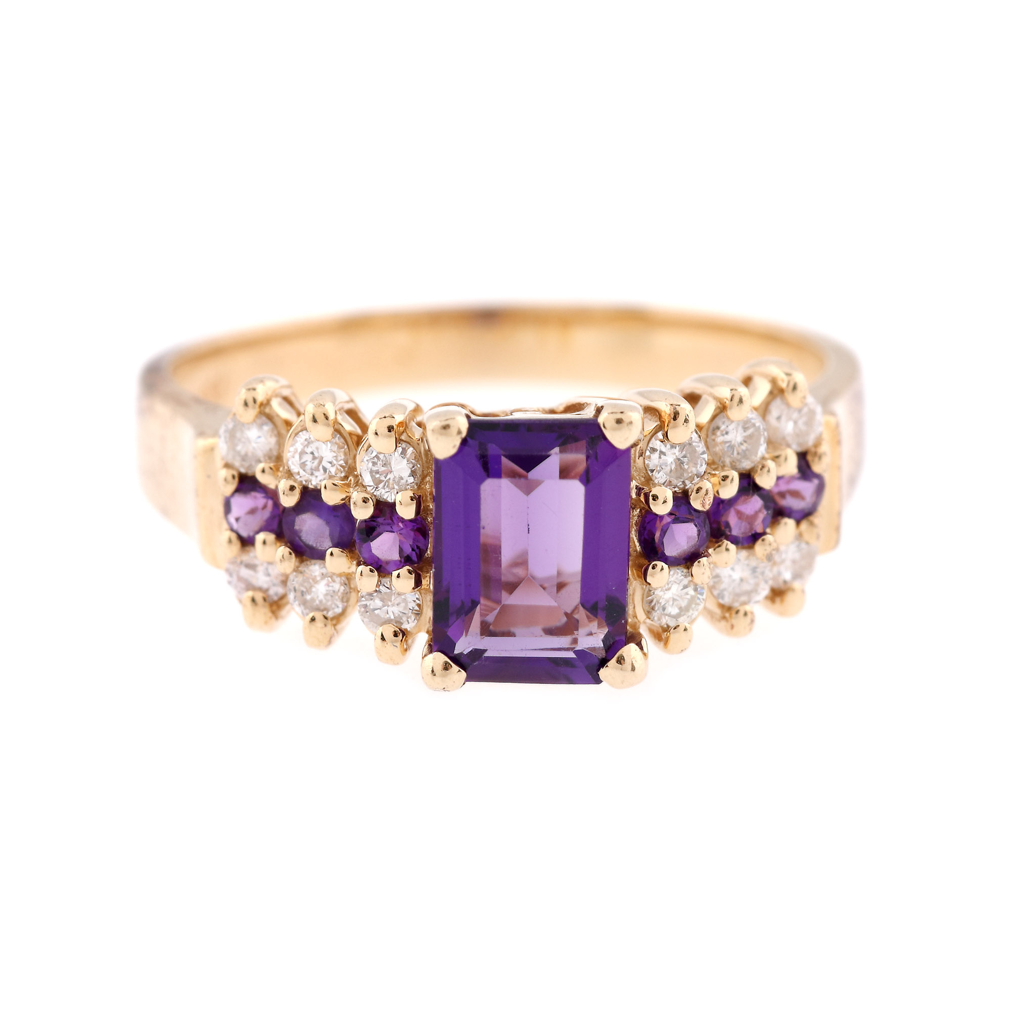 7 ametiste (1 emerald cut, 6 rotund fațetate), culoare violet, claritate eye-clean, cca. 0,90 ct. și 12 diamante rotunde briliant, culoare K-M, claritate SI2-I1, cca. 0,20 ct.