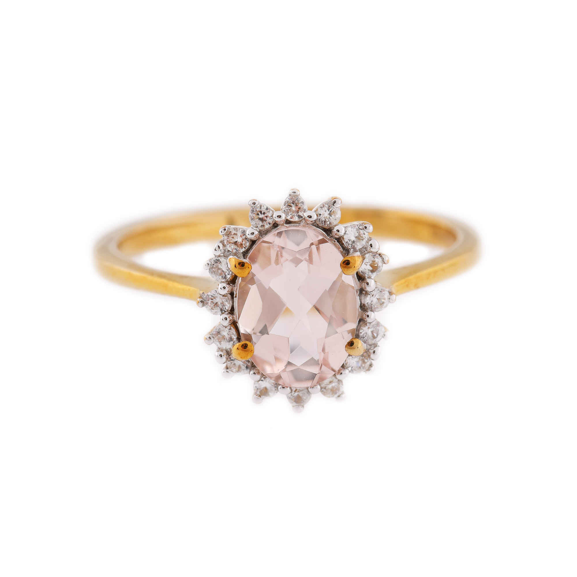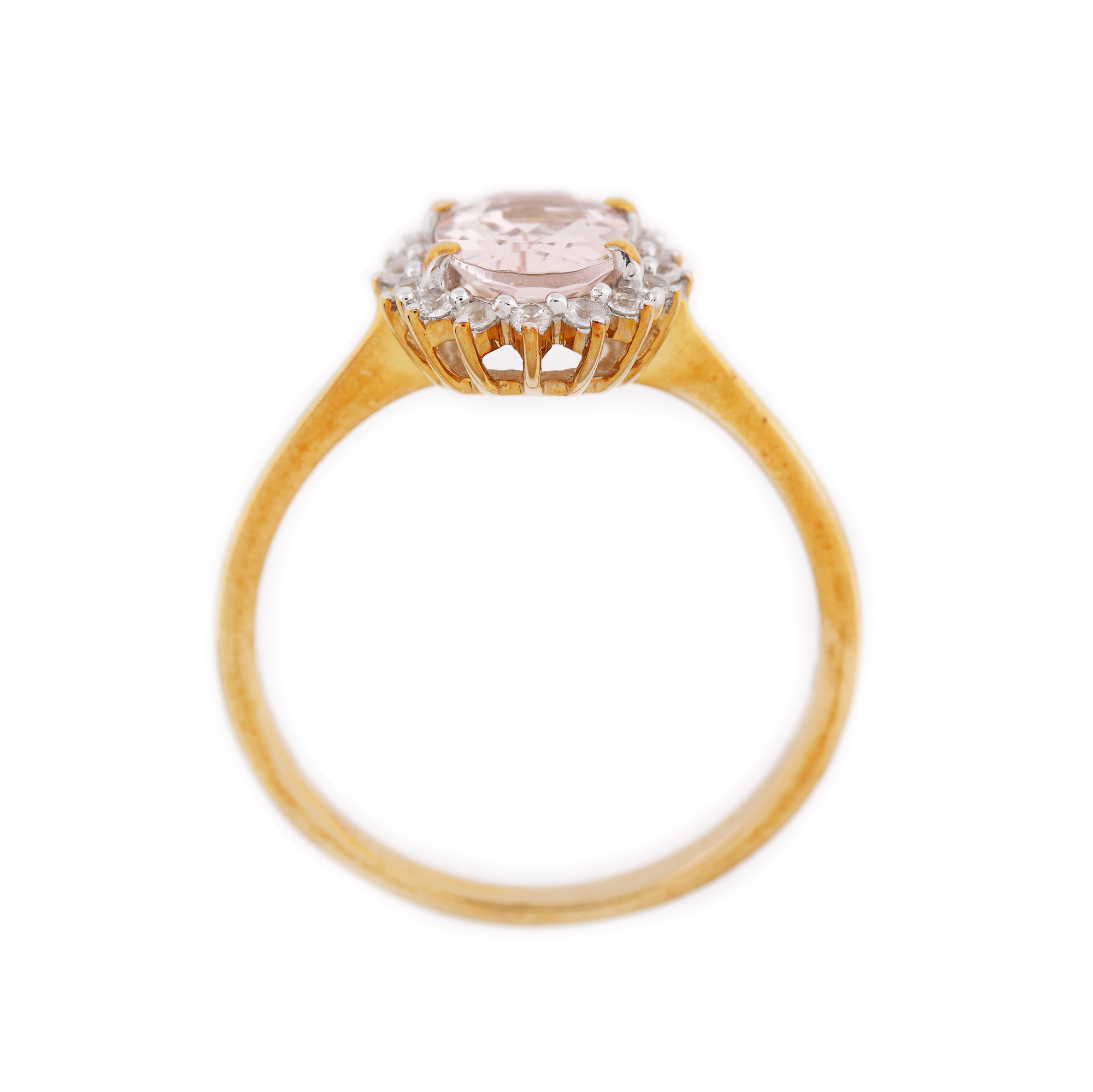 1 morganit oval fațetat, culoare roz, claritate eye-clean, cca. 1 ct. și 16 topaze rotund fațetate, albe, claritate eye-clean, cca. 0,18 ct.