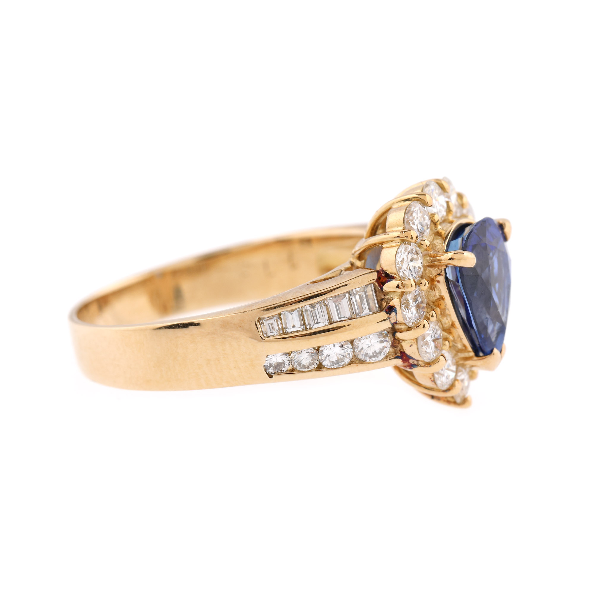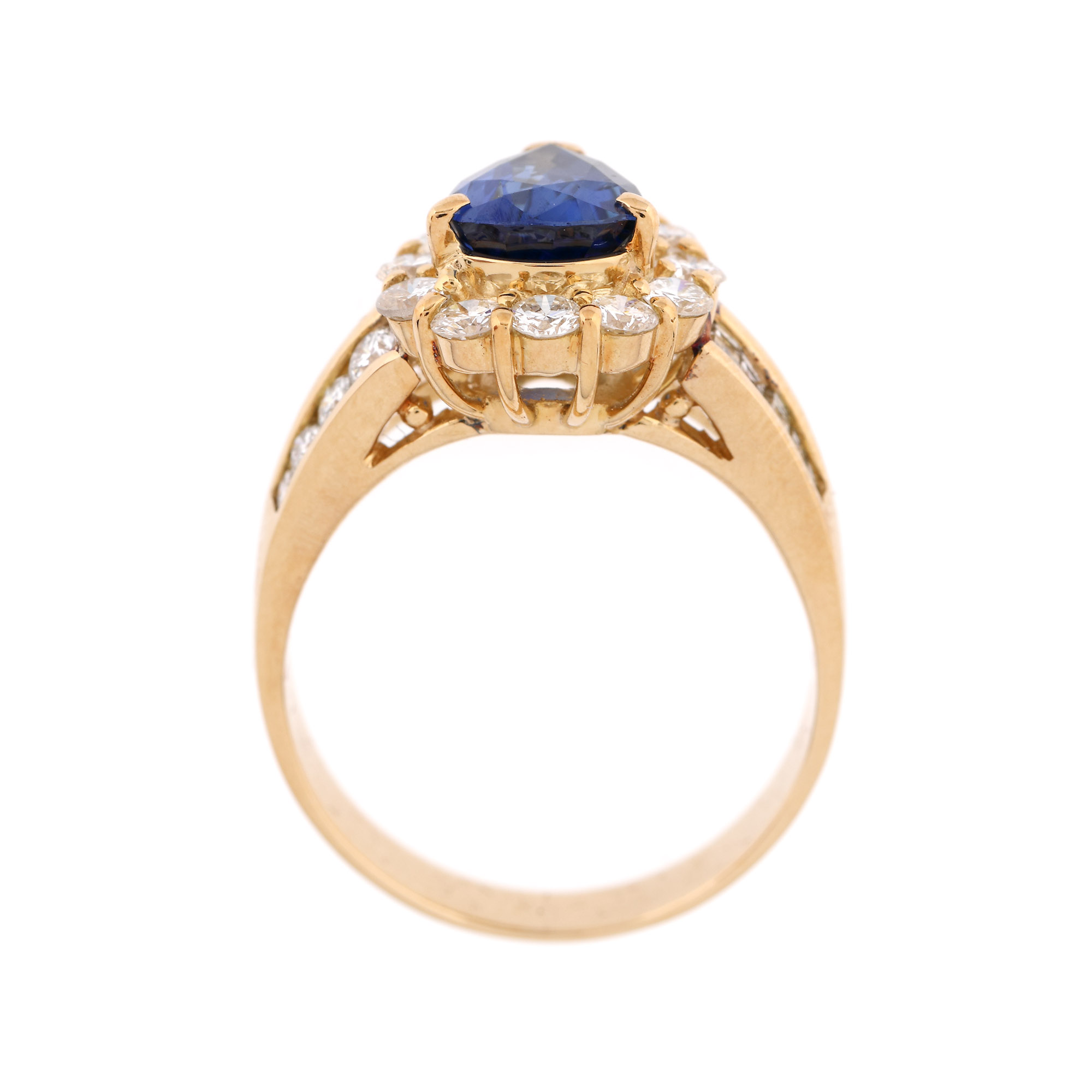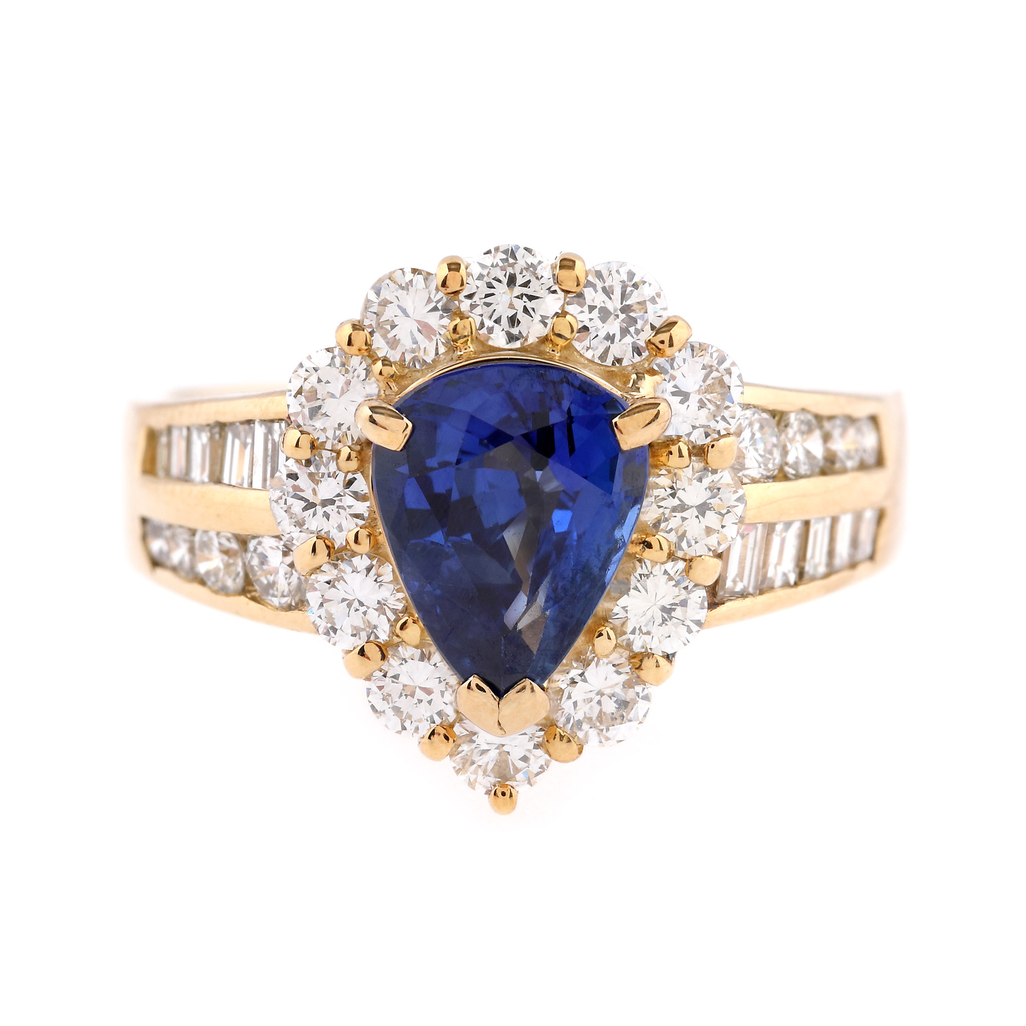 1 safir pară fațetat, culoare albastru, claritate SI, cca. 1,72 ct. și 30 diamante (10 baghete, 20 rotunde briliant), culoare K-L, claritate VS, cca. 1,13 ct.