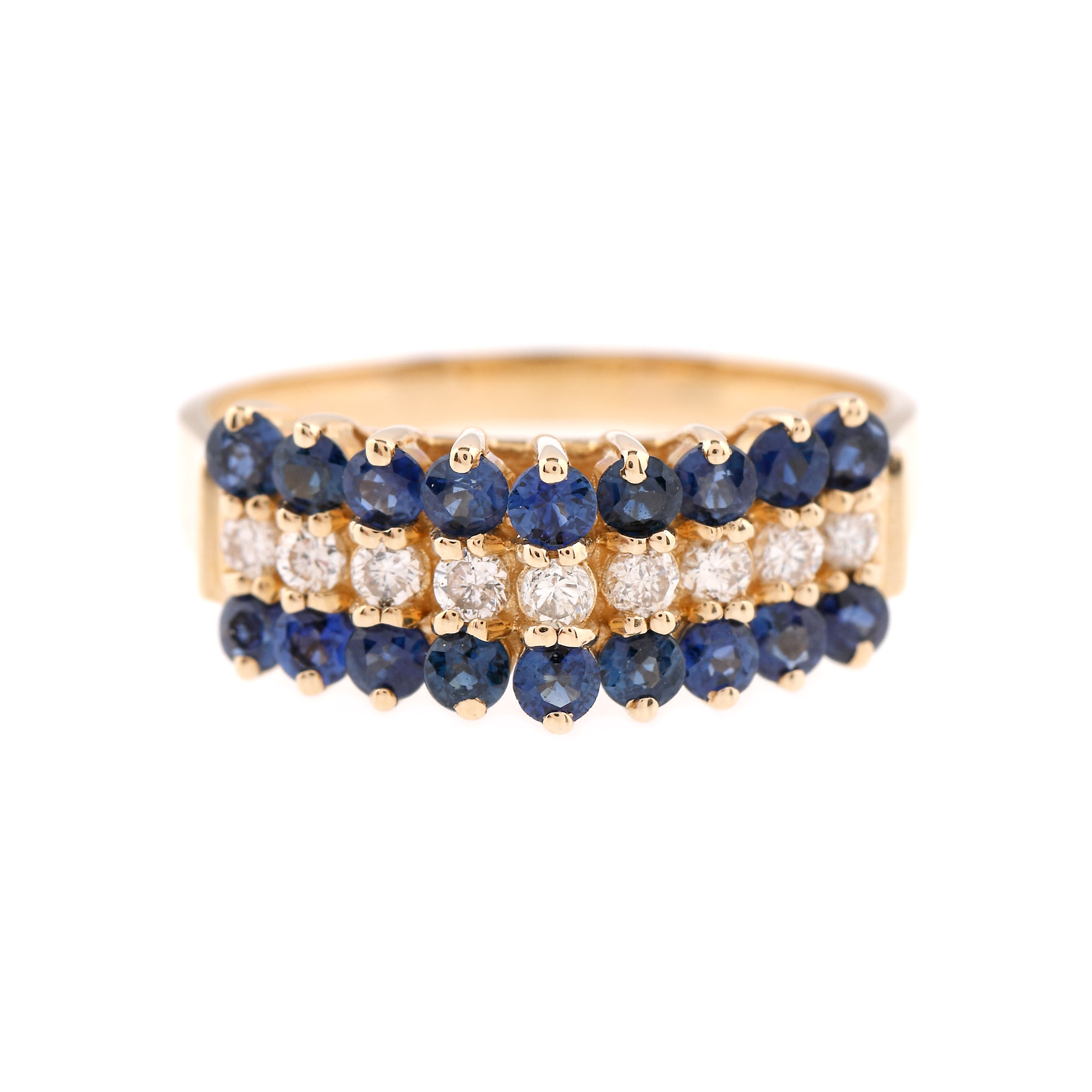 9 diamante rotunde briliant, culoare K-L, claritate VS-SI1, cca. 0,15 ct. și 18 safire rotund fațetate, culoare albastru, claritate SI, cca. 0,54 ct.